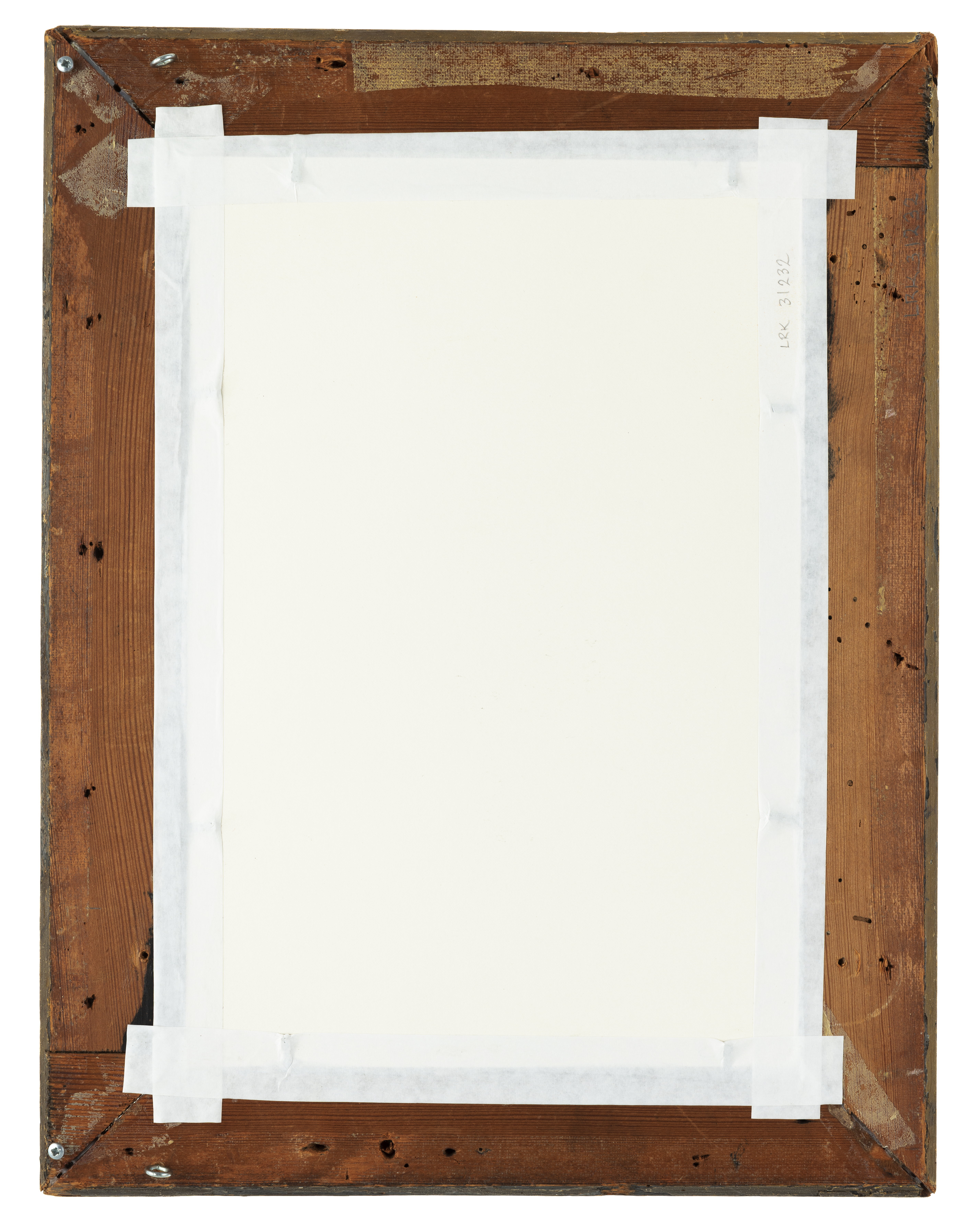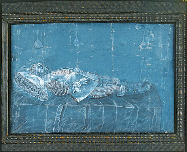 Gouache på papper. Helfigur, liggande på dödsläger med huvudet på en rikt spetsbesatt kudde. Vit spetsmössa, spetskrås, spetsmanschetter (reticellaspetsar) , ärmar och byxor med breda ganser. Gouachen har en 7 cm bred , mörktbrun målad träram som dekorerats med hopplist och reliefmönster som liknar korgflätning.