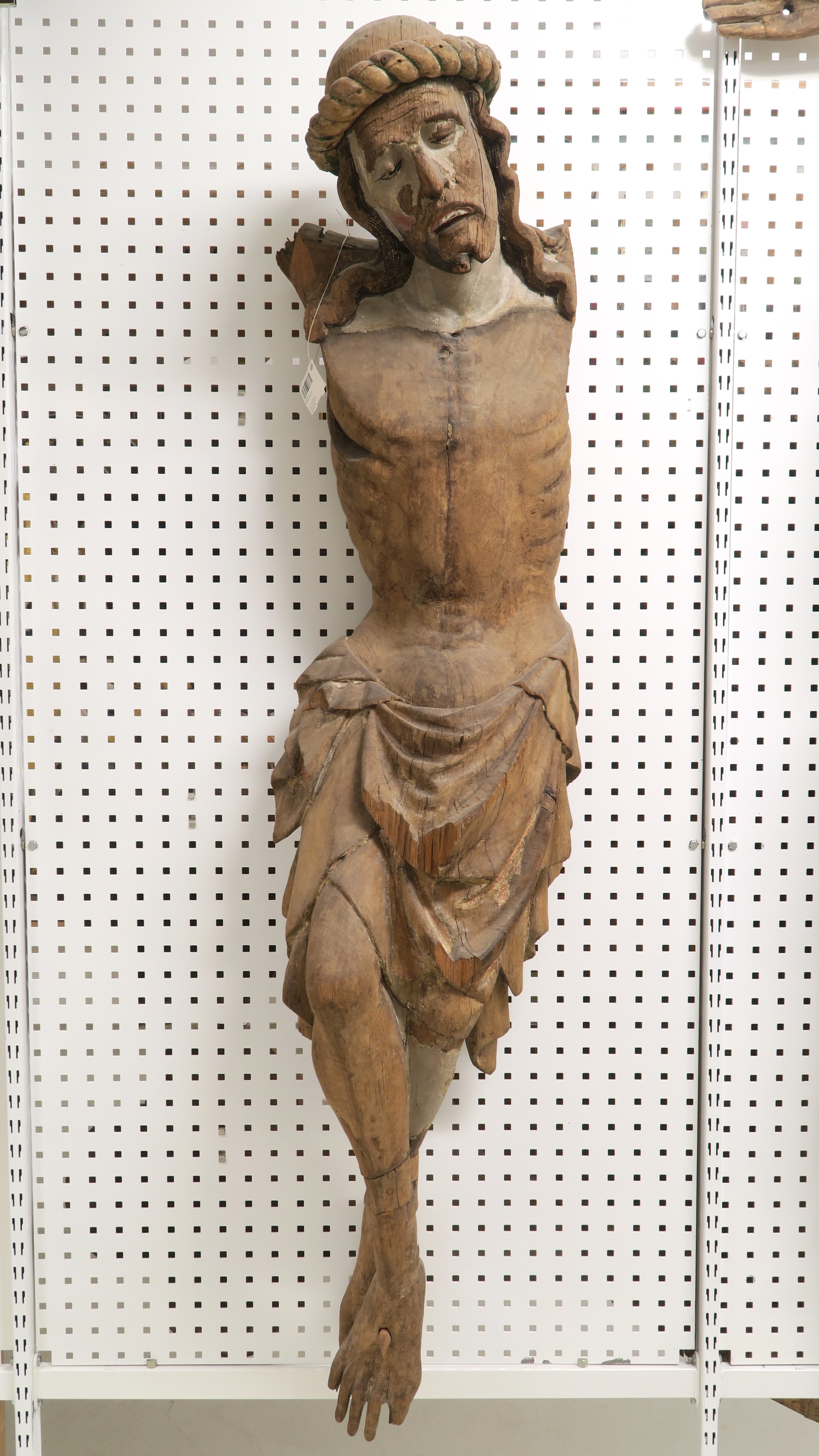 Kondition: armarna förlorade, törnekrona, ländkläde och fötter med smärre skador. Färg: smärre fragment bevarade.