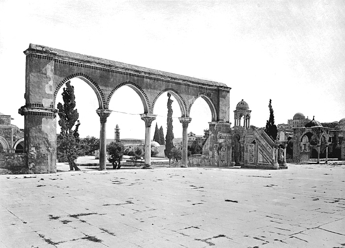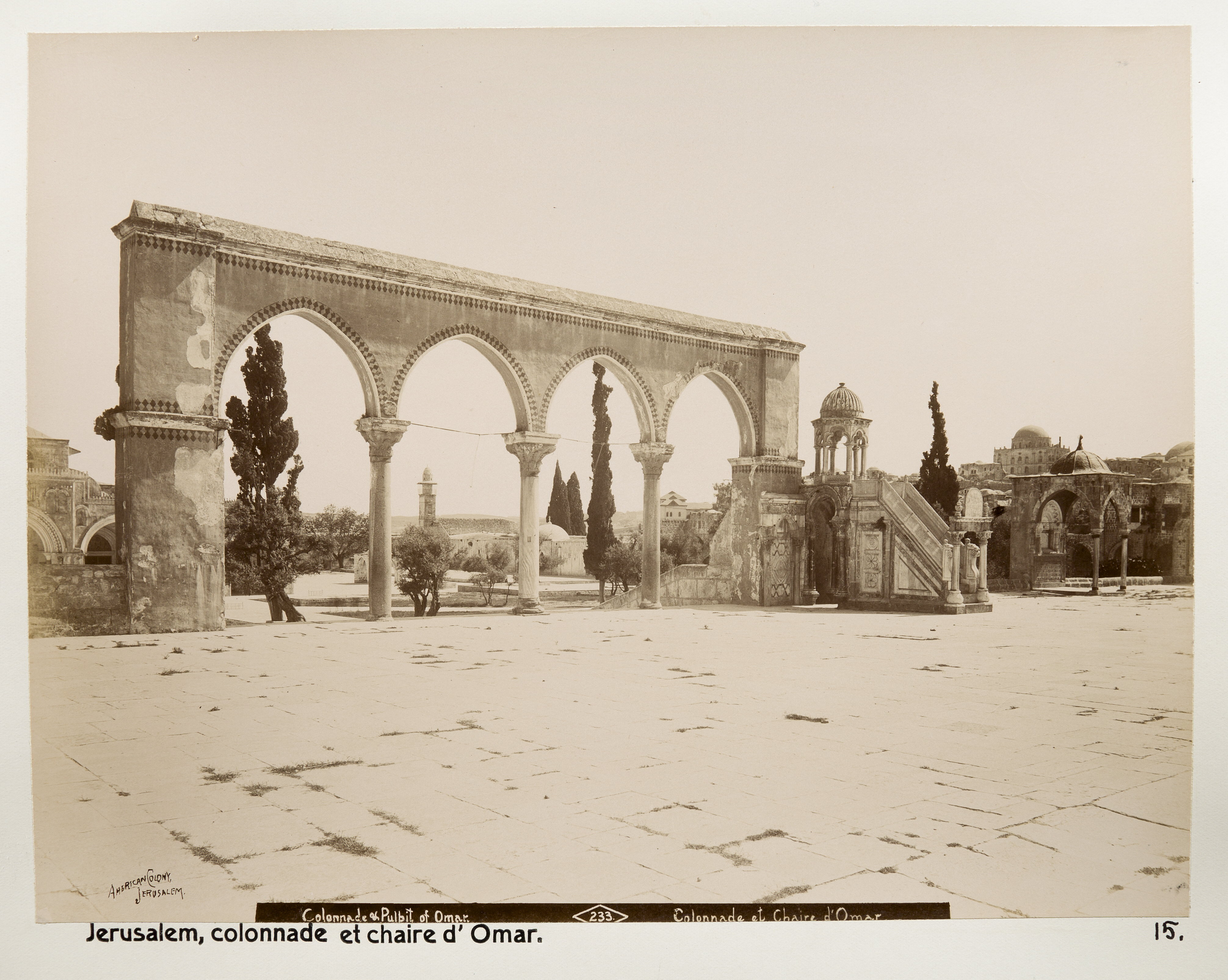 Omars pelargång och predikstol, Jerusalem. Text på originalet: "Colonnade and Pulpit of Omar./Colonnade et Chaire d'Omar." Fotografierna LXVI:N.01.-180. kommer från resan till Palestina och Syrien som Wilhelmina och Walther von Hallwyl gjorde den 30 mars-27 april 1901. De lämnade Sverige den 5 november 1900 för Egypten, där de stannade till den 28 mars 1901, då de fortsatte till Palestina. Med på resan var Wilhelminas sällskapsdam, fröken Ida Uhse. Den 27 april fortsatte de till Turkiet och Mindre Asien. De mindre fotografierna (utom de från Samos) LXVI:N.90.-100. är tagna av Wilhelmina själv, under en resa till häst från Jerusalem till Damaskus 8-20 april 1901. Övriga fotografier är inköpta av Wilhelmina i Jerusalem, Damaskus och Beirut. Alla uppgifter kommer från Ida Uhses reseanteckningar.