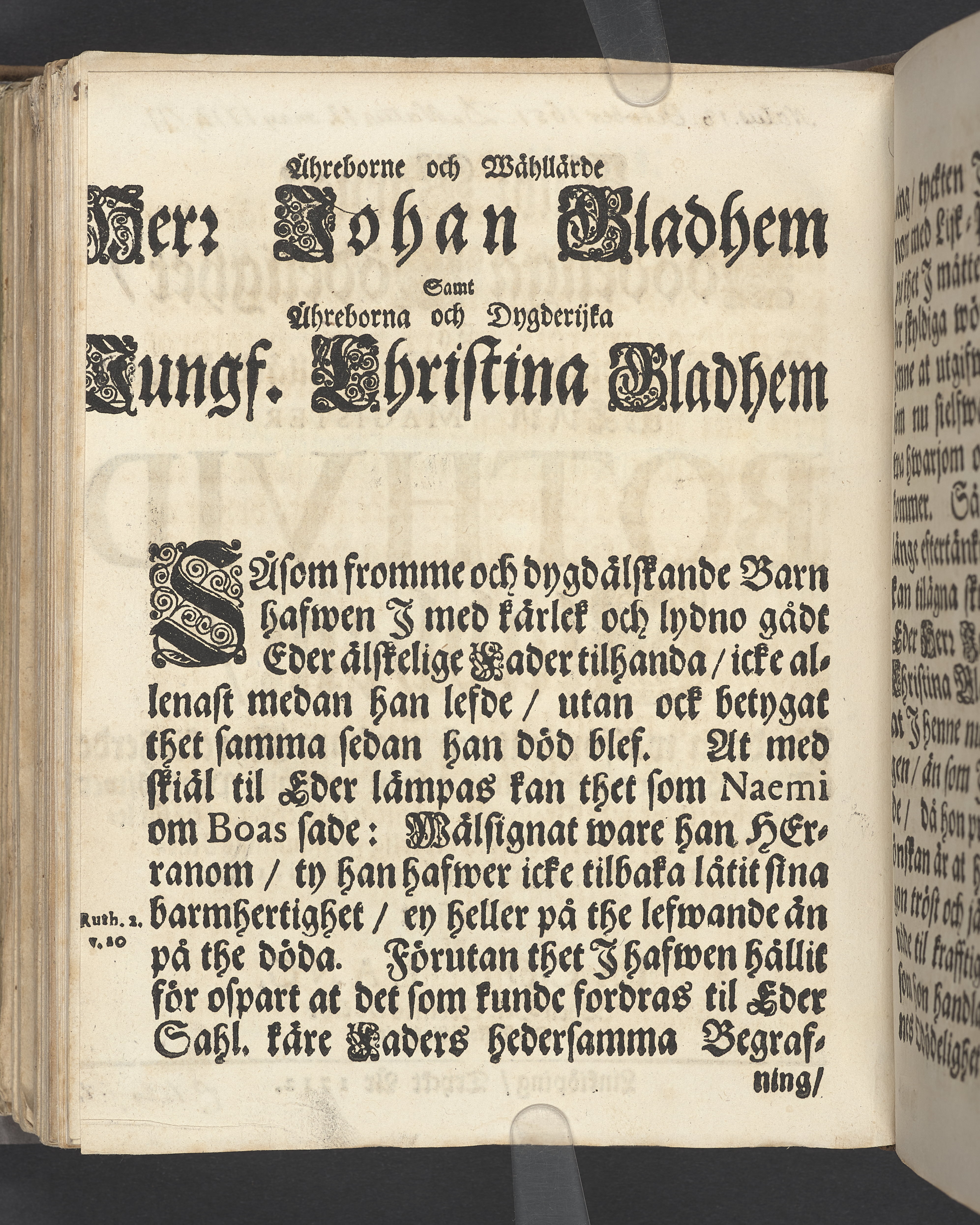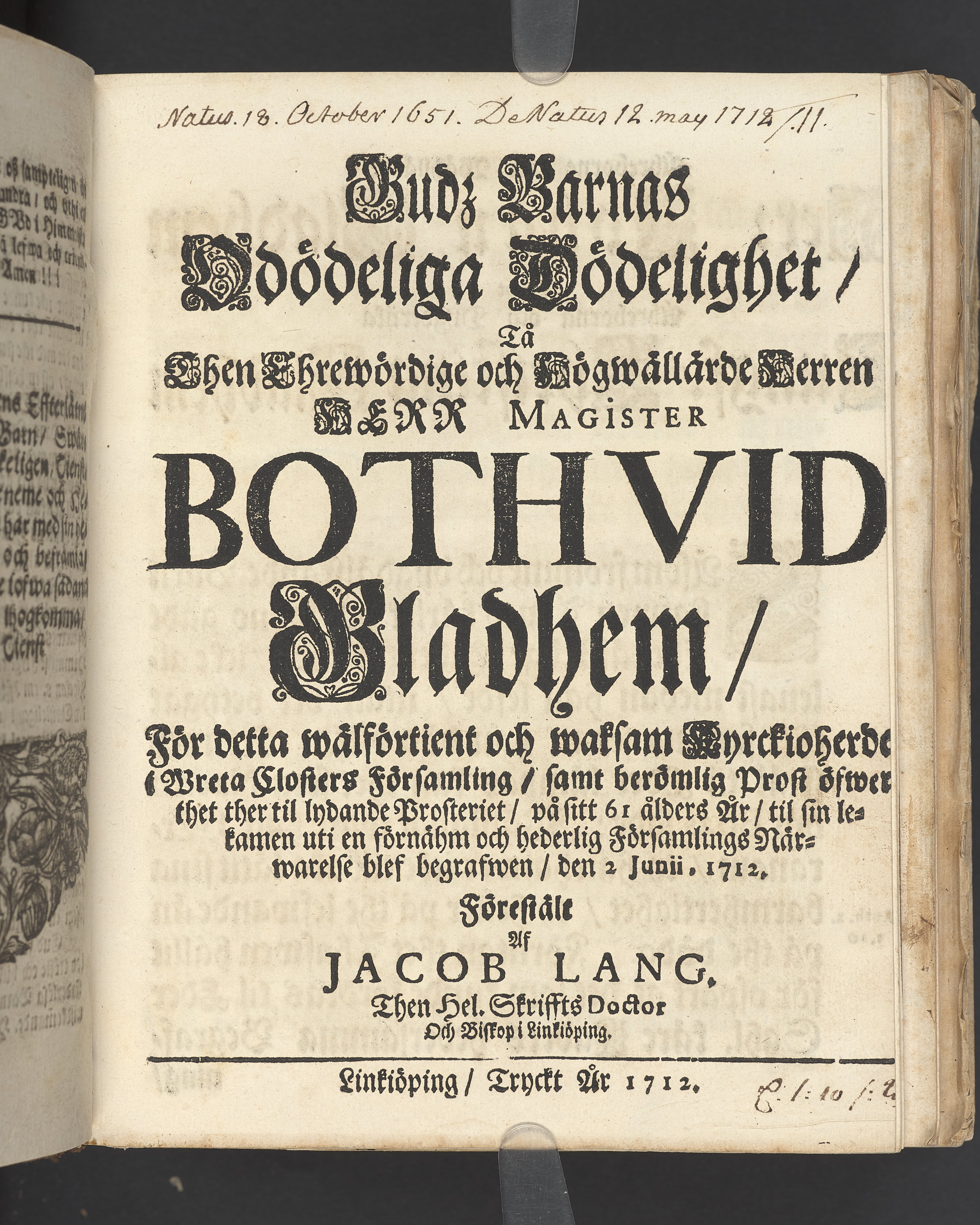 Gudz barnas odödeliga dödelighet, tå then ehrewördige ... Bothvid Gladhem, för detta välförtient och waksam kyrckioherde i Wreta closters församling, samt berömlig prost öfwer thet ther til lydande prosteriet, på sitt 61 ålders år, til sin lekamen uti en förnähm och hederlig församlings närwarelse blef begrafwen, den 2 junii, 1712. Förestält af Jacob Lang ... Linkiöping, tryckt år 1712.