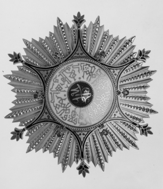 Åttauddig strålstjärna av guld, varannan stråle fasetterad, varannan slät med mittås. Därpå lagt ordensstjärna, sexuddig guldstjärna med konkava sidor. Rund, svagt välvd, vitemaljerad medaljong med skrifttecken i guld, i mitten rund, välvd platta täckt med grön emalj med skrifttecken i guld, båda plattorna med guldrepstavskant. Uddarna täckta med grön emalj, däri växtornament av guld, blå kantbård, på spetsarna bladornament täckta med blå, röd och grön emalj. Mittpå de konkava sidorna en fyrkantig, taffelslipad rubin i slät fattning, därutanför en rund, fasettslipad smaragd i slät fattning. Frånsidan matt, stämplar på en udd: 1) skrifttecken, 2) fågel, 3) C. Blank, konkav, rund platta, stämplad på mitten: "LATTES" samt därnedanför skrifttecken, fågel samt C. Vertikalt placerad säkerhetsnål samt två hakar.