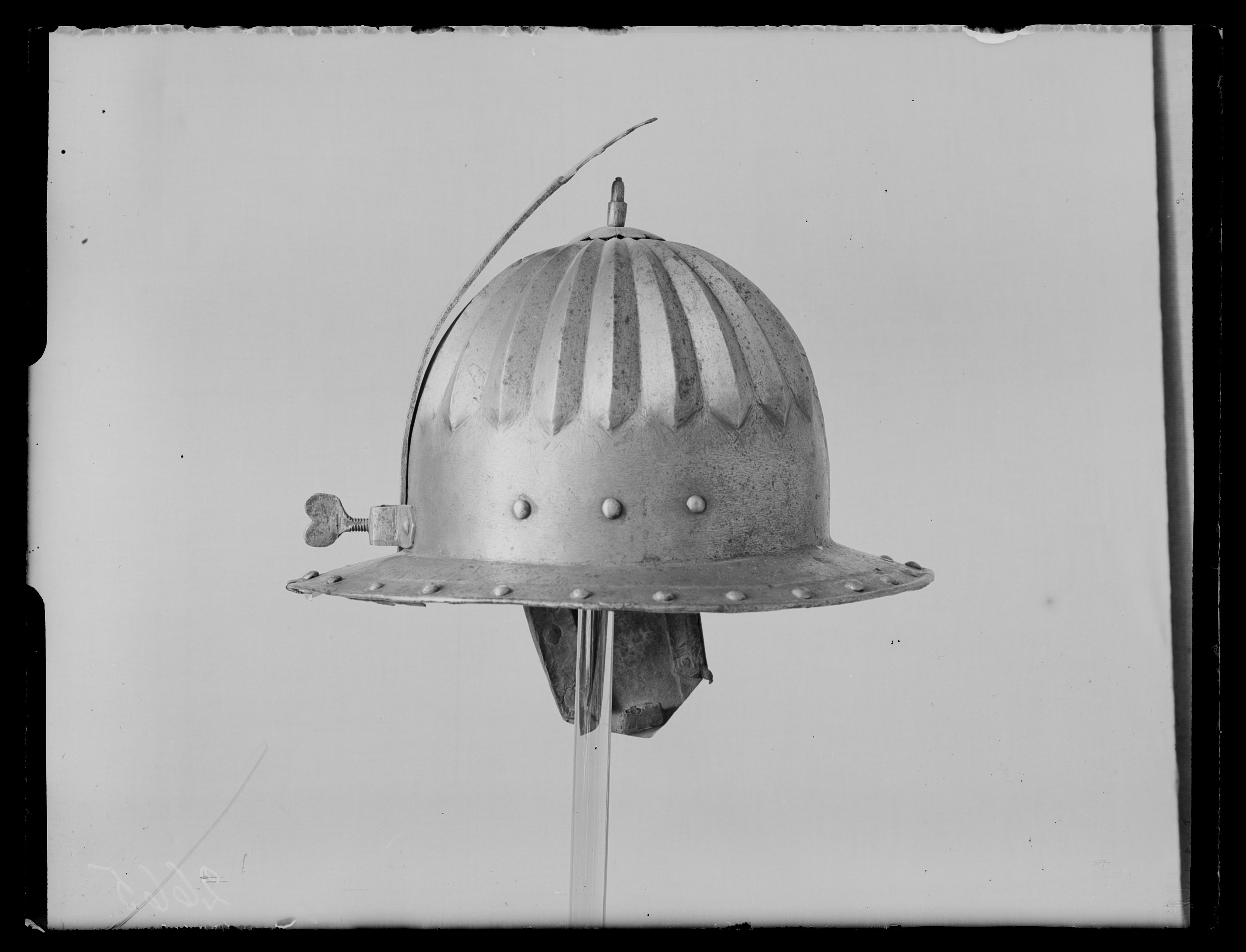 Av stål, utsidan slipad metallren och insidan mörkbrun, behandlad. Bestående av två halvor med längsgående nitad fog, den vänstra över den högra. Klockan halvklotformig, tämligen hög med 18 vertikala åsar, spetsiga med spetsigt avslut. Klockans nedre ca 60 mm slät med tre nitar på var sida. På toppen blomformig bricka, diam 55 mm, med filade linjer. I mitten stålten, H 26 mm. Framtill bygel för näsbärga med hjärtformig låsskruv. Brätte B 60 mm, rundat, något sluttande och smalare i sidorna samt försänkt bård med nitar och invikt rundsmidd kant. På insidan finns delvis bevarade kantband av svart läder.