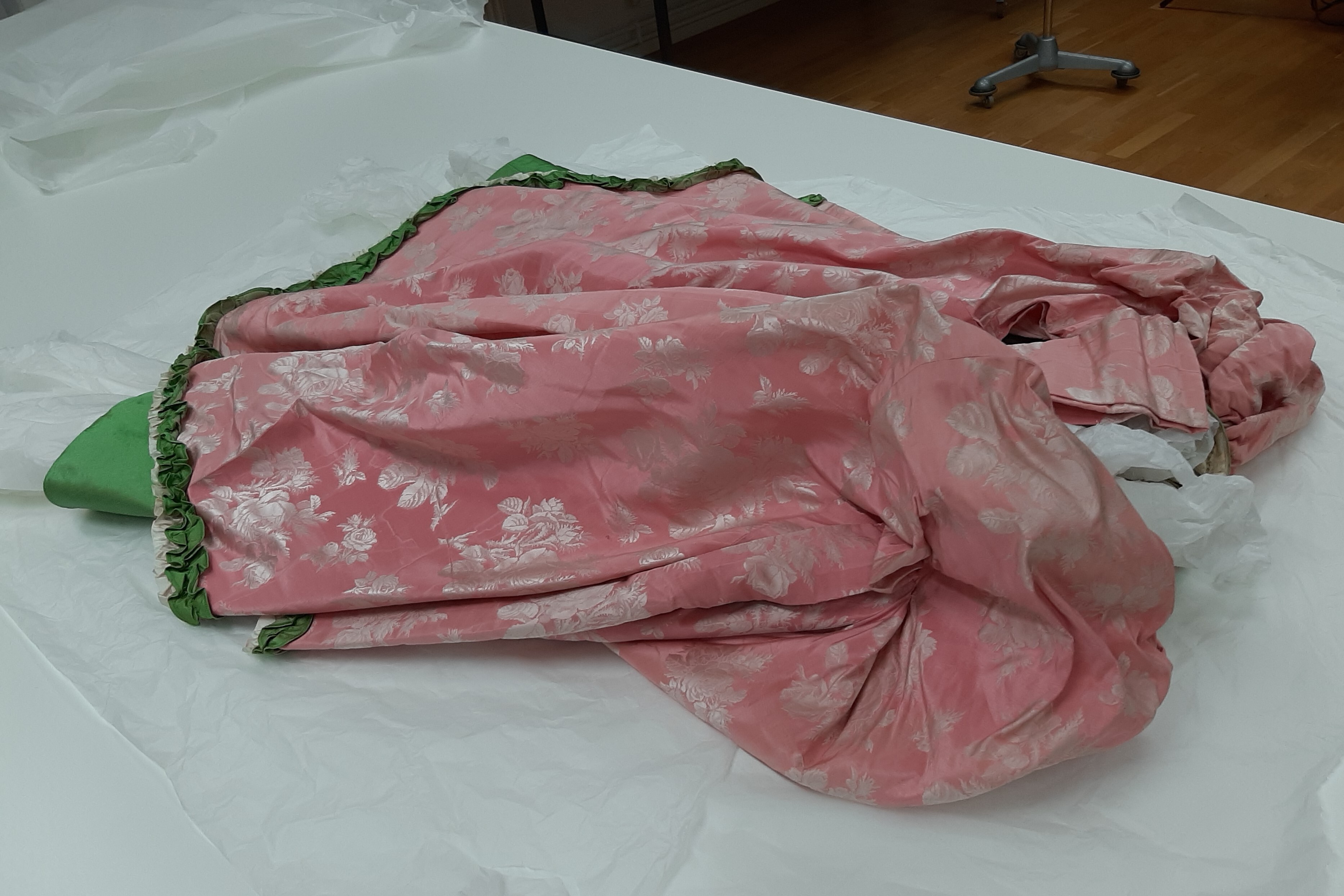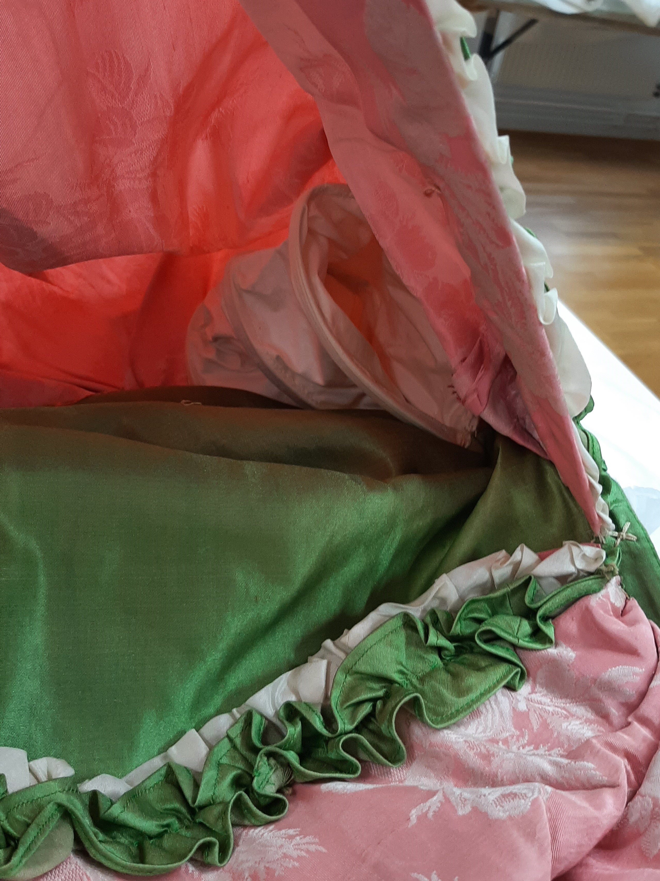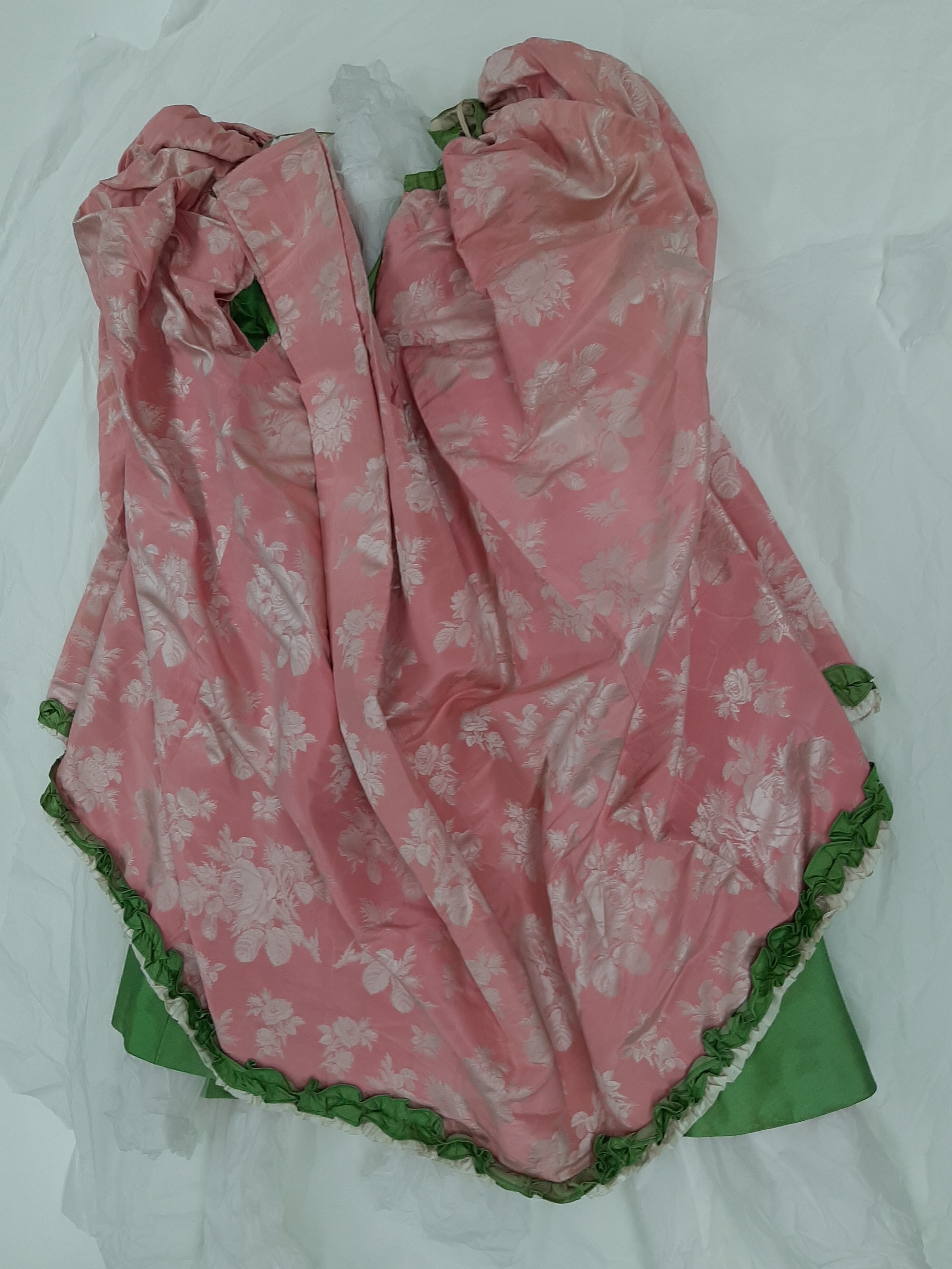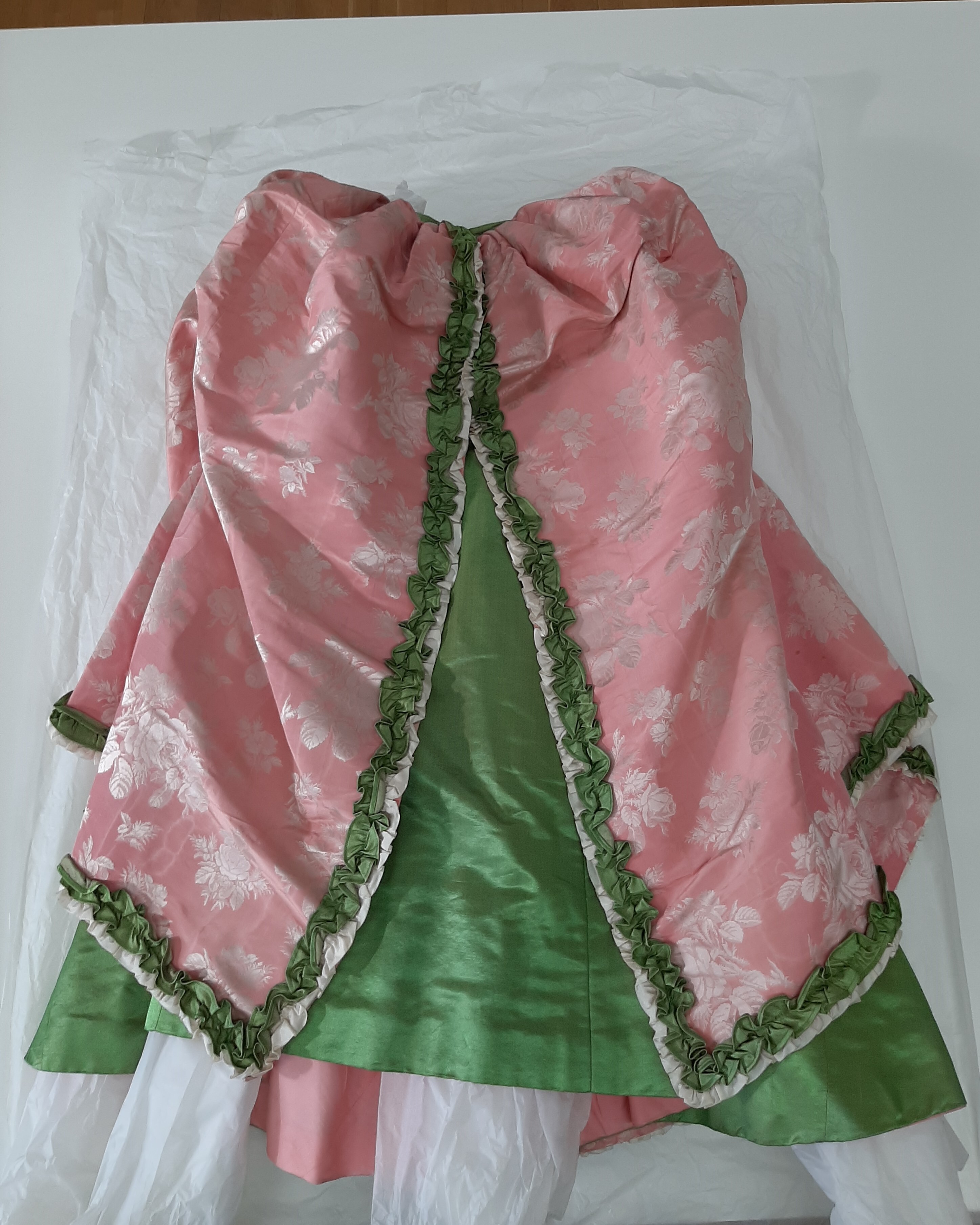 Maskeradklänning av skarpt rosa sidenrips med invävda vita rosor. Livet löst figurskuret med fyrkantig urringning samt djupt nerdragen i en spets fram, likaså mitt bak. Ärm trekvartslång. Runt ringning och ärmar rynkad volang av grönt och vitt siden. Runt ärmarna dessutom gulvit spets samt rosa organza. Livet knäpps mitt bak med snörning. Foder av vit bomull, tretton infällda fjädrar. I midjan ett 30 mm brett band med hake och hyska. Kjol, i två lager, den undre något rynkad av skarpt grönt siden, infodrad med vit bomull. Runt nederkanten en skoning av 200 mm brett rosa siden. Överkjolen av klänningens rosa tyg kortare än underkjolen, samt rynkad på höfterna och går svagt böjt isär mitt fram. Mitt bak rynkat med puff. Hela överkjolen kantad med rynkadbård av grönt och vitt siden. I höfterna mellan överkjol och den undre gröna kjolen sitter insydda "höftkuddar" med 3 rundade fjädrar som ger form. Bandet i midjan med invävd firmaetikett: "Augusta Lundin, Stockholm."