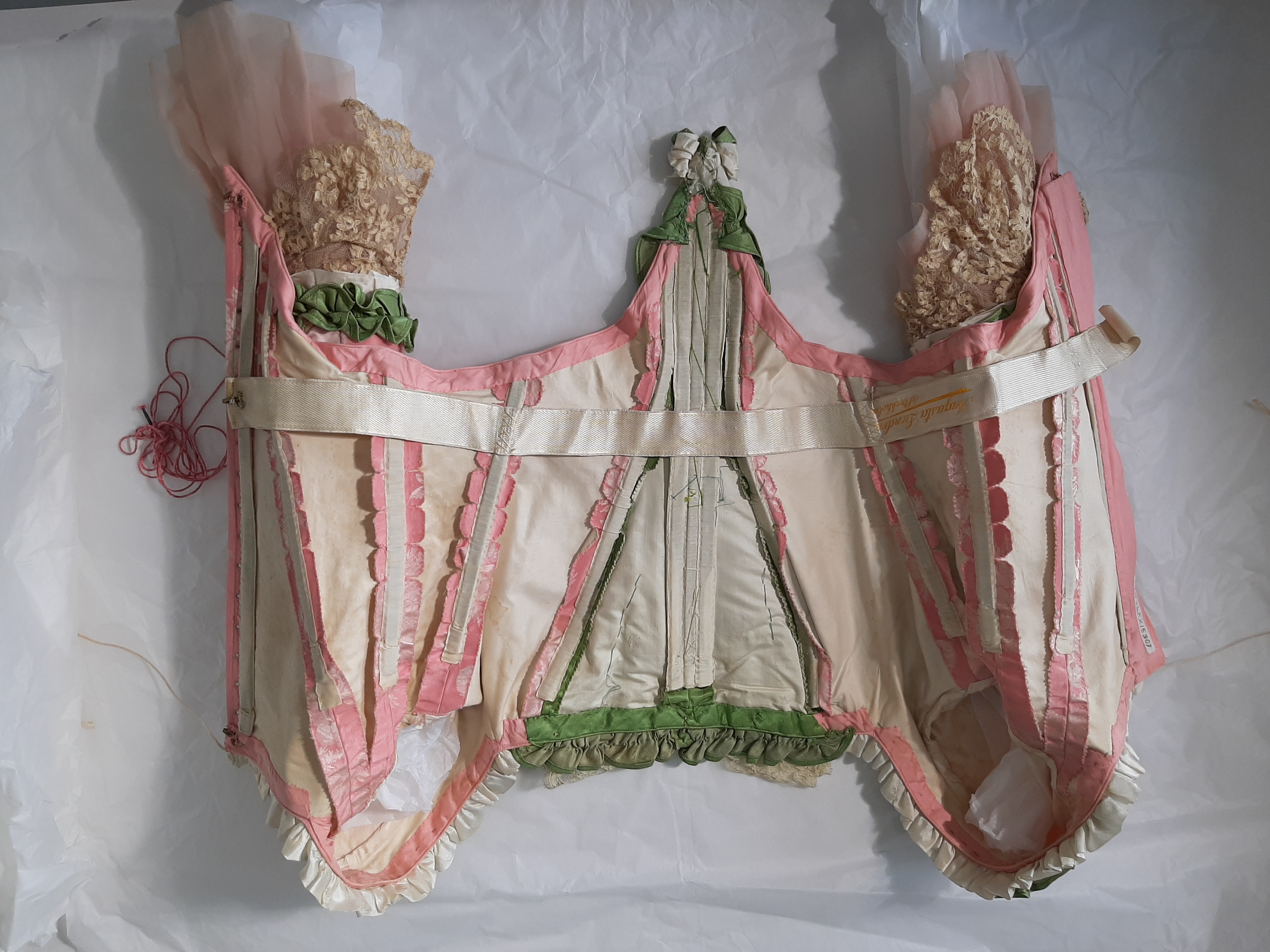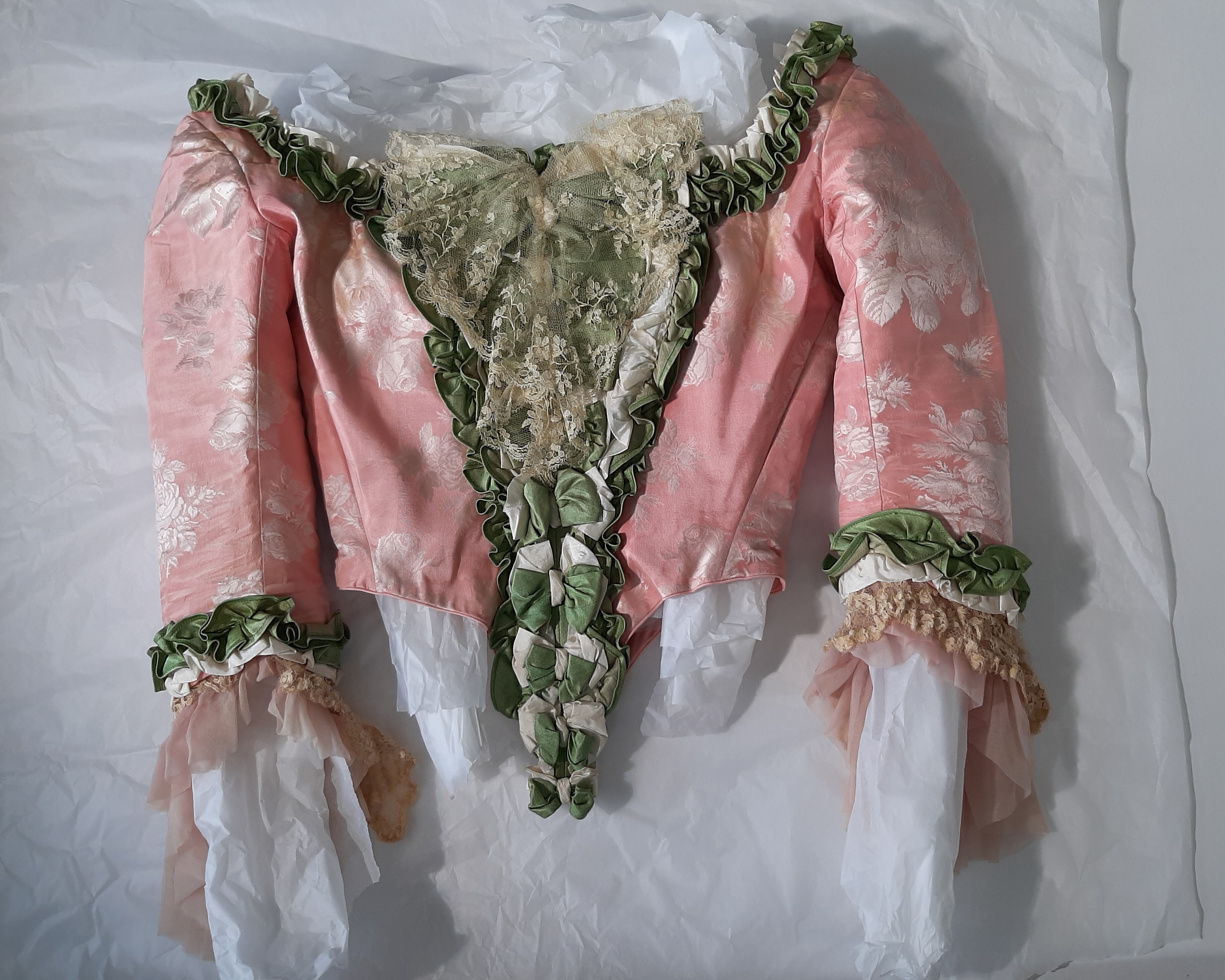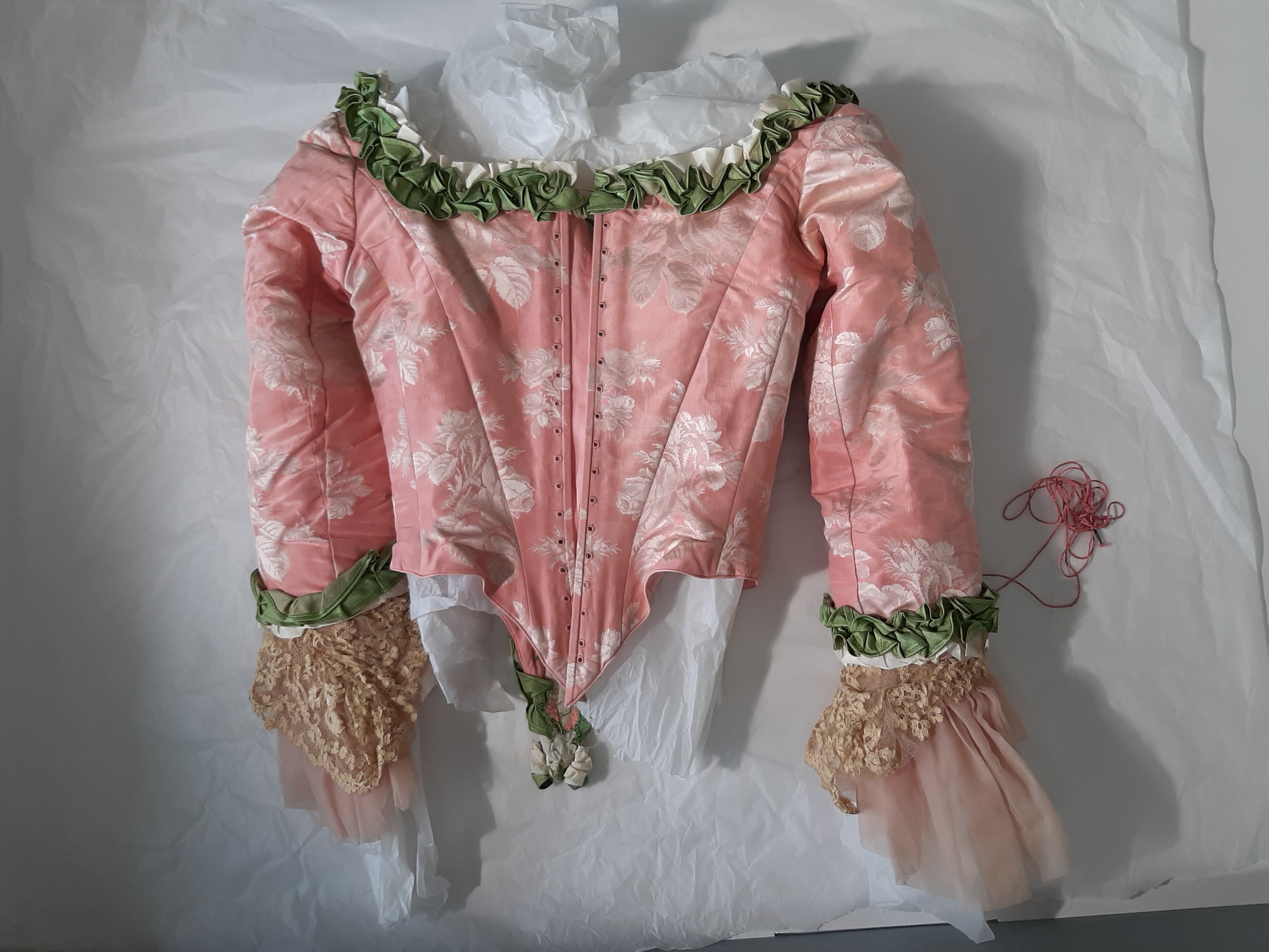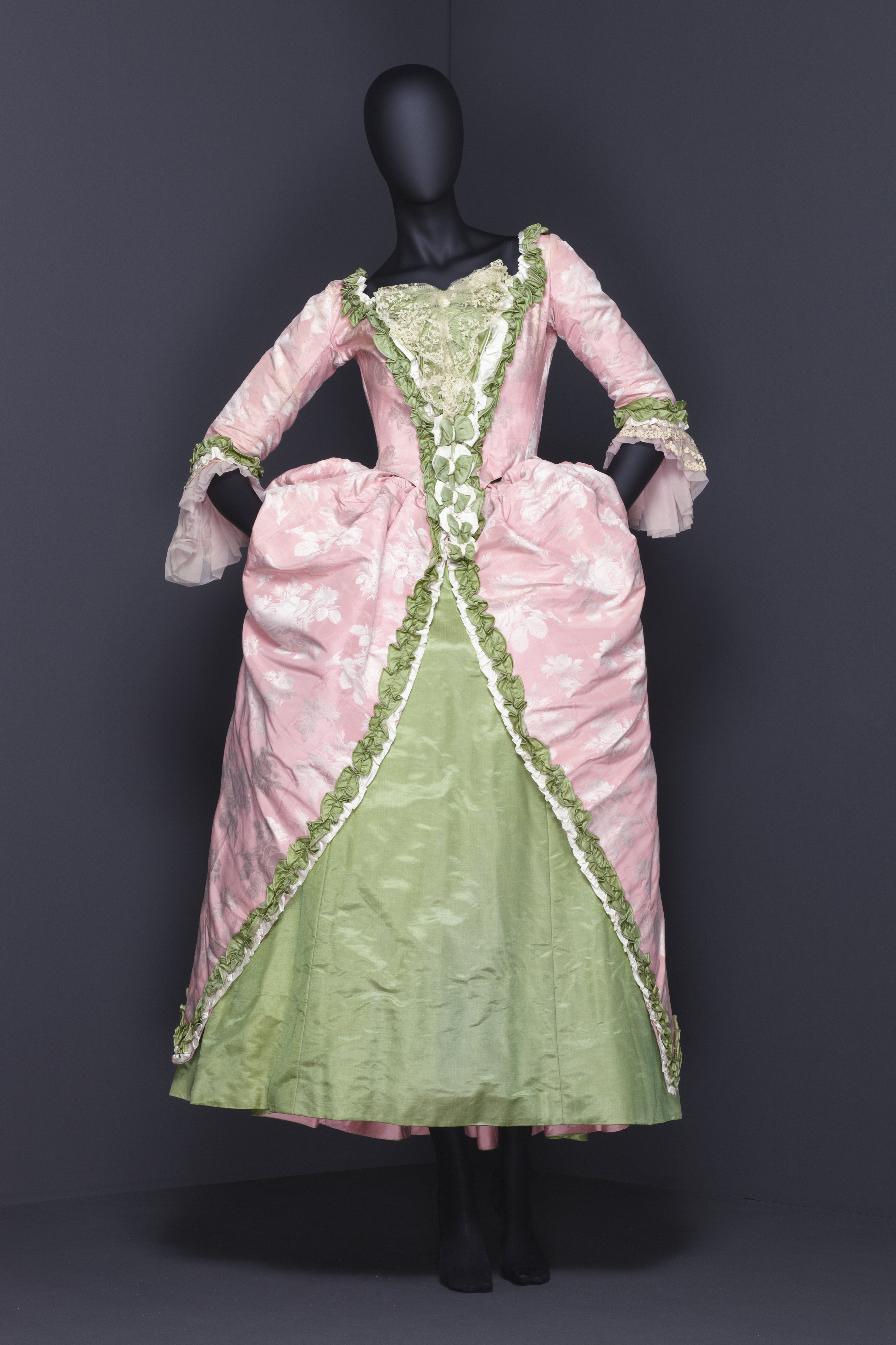 Maskeradklänning av skarpt rosa sidenrips med invävda vita rosor. Livet löst figurskuret med fyrkantig urringning samt djupt nerdragen i en spets fram, likaså mitt bak. Ärm trekvartslång. Runt ringning och ärmar rynkad volang av grönt och vitt siden. Runt ärmarna dessutom gulvit spets samt rosa organza. Livet knäpps mitt bak med snörning. Foder av vit bomull, tretton infällda fjädrar. I midjan ett 30 mm brett band med hake och hyska. Kjol, i två lager, den undre något rynkad av skarpt grönt siden, infodrad med vit bomull. Runt nederkanten en skoning av 200 mm brett rosa siden. Överkjolen av klänningens rosa tyg kortare än underkjolen, samt rynkad på höfterna och går svagt böjt isär mitt fram. Mitt bak rynkat med puff. Hela överkjolen kantad med rynkadbård av grönt och vitt siden. I höfterna mellan överkjol och den undre gröna kjolen sitter insydda "höftkuddar" med 3 rundade fjädrar som ger form. Bandet i midjan med invävd firmaetikett: "Augusta Lundin, Stockholm."