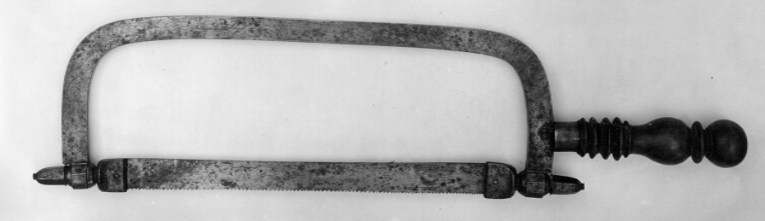 Bågsåg med båge med rundade hörn och rektangulärttvärsnitt i var ände försedd med åttkantögla i vilka bladet är fastsatt i beslag med en slits i vilka bladet är fastskruvat med skruvar med klotformiga flänsskallar med spår. Beslagen är fastskruvad i öglorna med skruvar med toppiga sexkant flänsskallare. Skaftet sitter på en ten utgående från bågen. Tenen går genom hela skaftet och är fastnitad med en mässingsbricka. Skaftets fäste är skott med en slät mässingsring. Skaftet är svarvat och dekorerat med sex vulster, en baluster samt avslutat med en kula. Tandavstånd 3 mm.