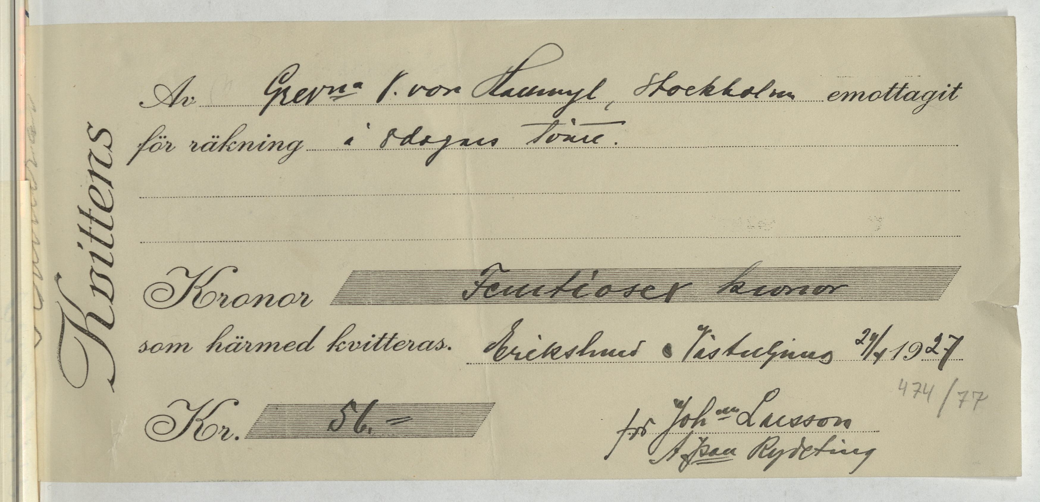 Kvitto från Johanna Larsson i Erikslund, Västerljung. Gällande 8 dagars tvätt. Erikslund, 1927.
