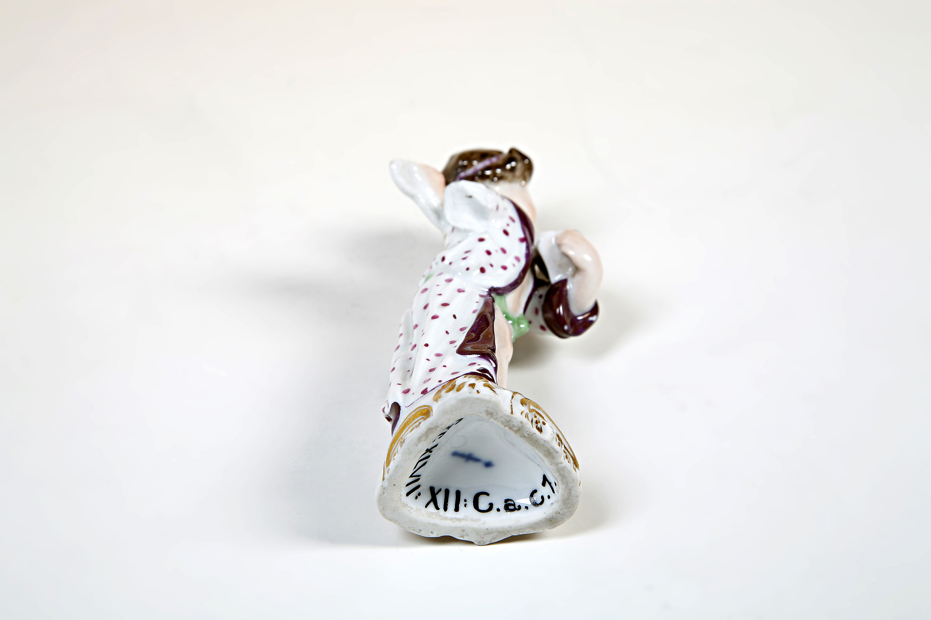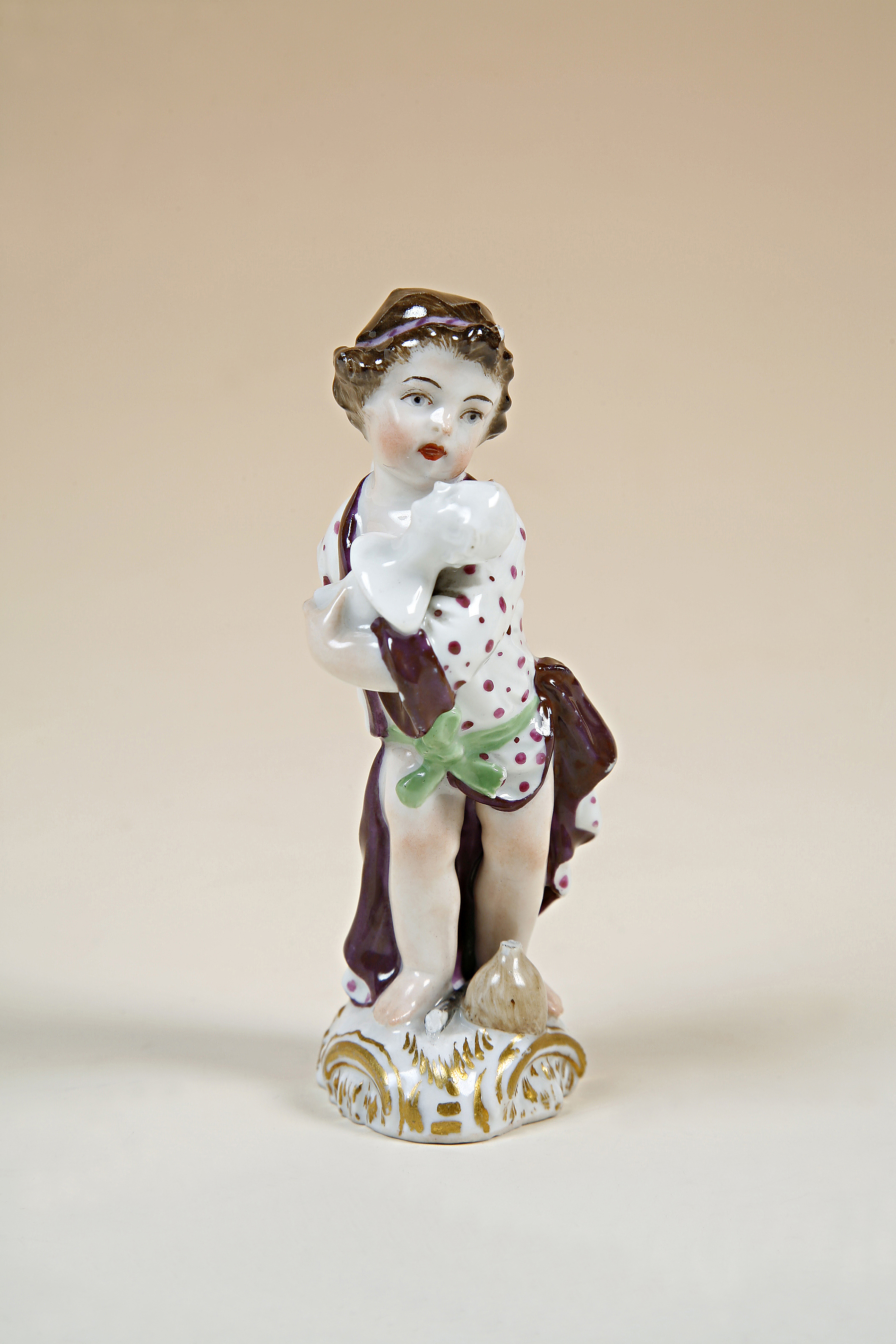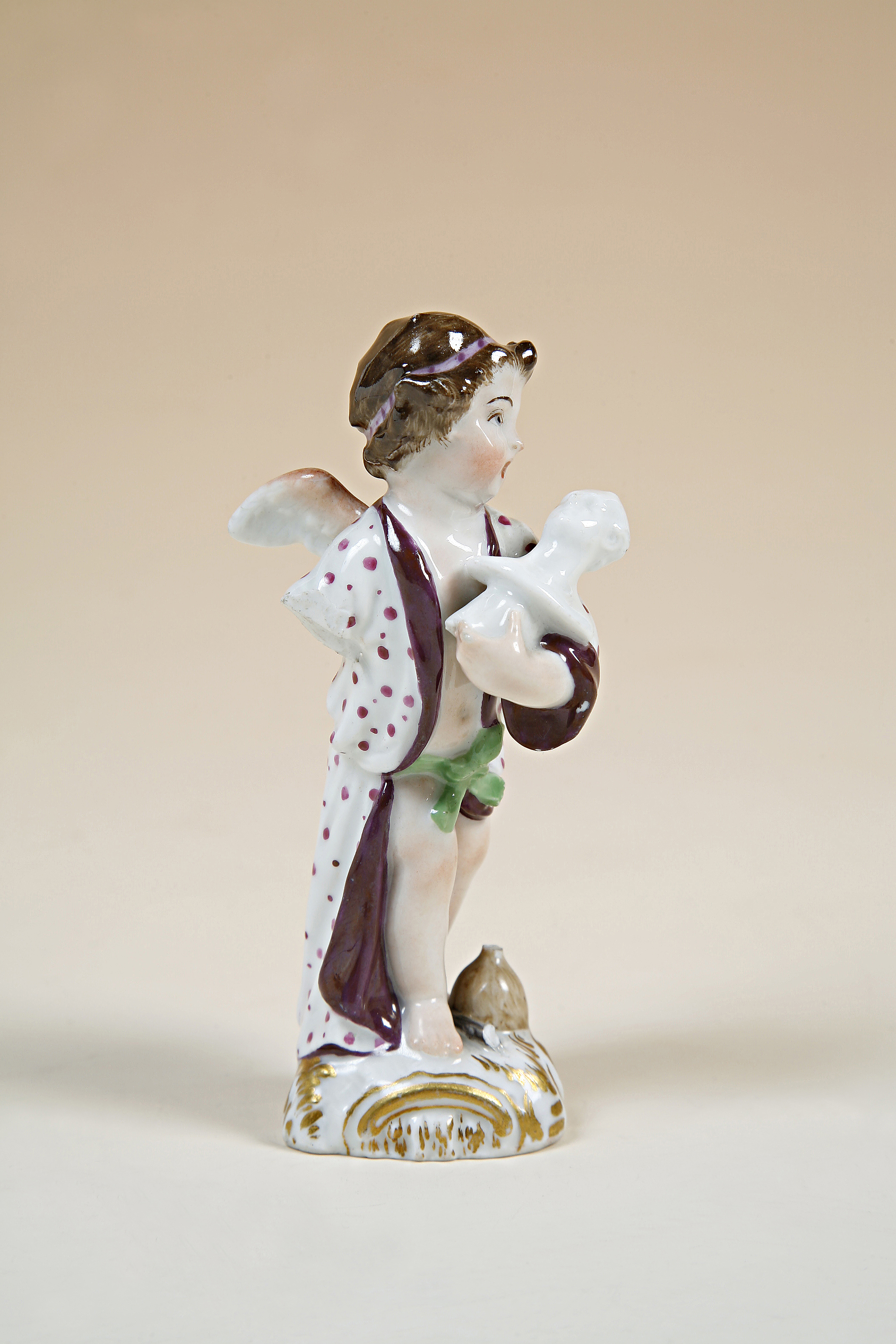 FIGURIN. Amorin hållande en byst stående iklädd en lång rock med gredelina prickar. I färger och guld på glasyren. Dekoren är av senare datum utförd (sekundärt) utanför fabriken. Modellen är utförd som nr 13 i en serie av Johann Joachim Kaendler pcj Friedrich Elias Meyer från 1755