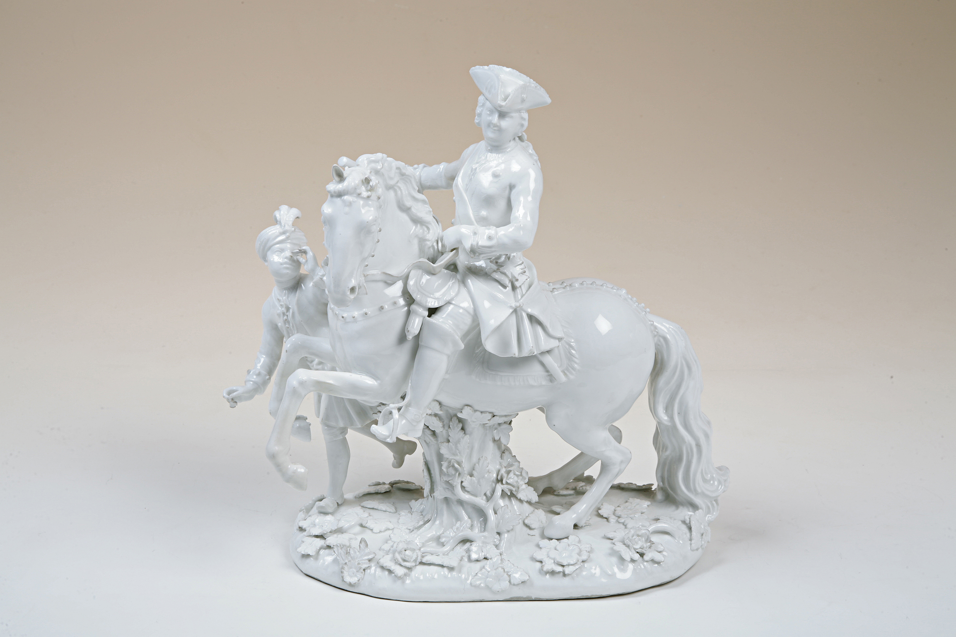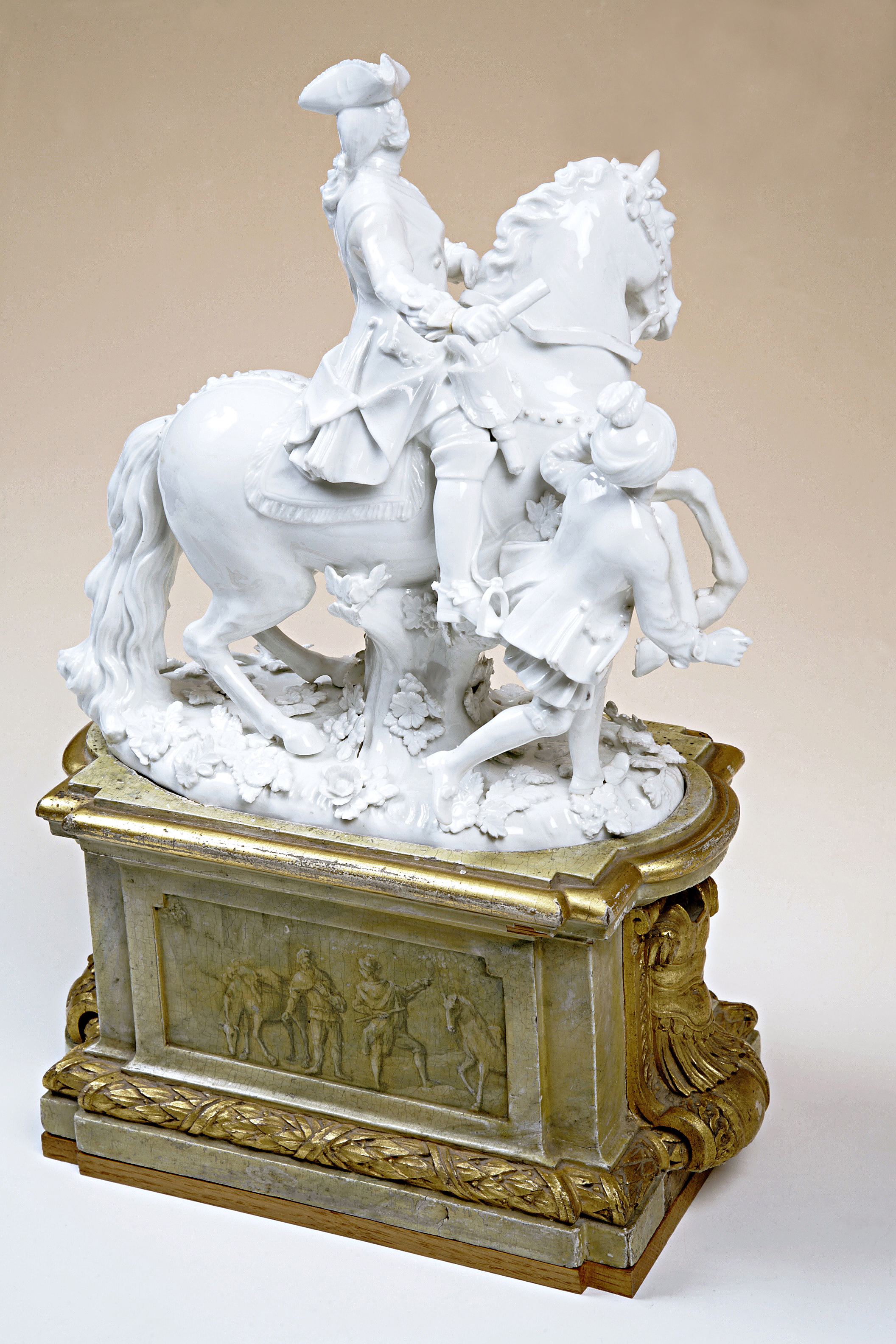 - Gruppen omålad. Kejsarinnan sittande i manssadel samt i uniform som chef för ett af sina regementen. Hufvudet vridet åt vänstra sidan, högra armen utåtsträckt och svagt böjd, i handen en kommandostaf, vänstra armen böjd, i handen tyglarna; benen svagt böjda. Hästen i galopp, frambenen uppåtböjda, bakbenen böjda, hufvudet vändt åt vänstra sidan; svansen lång och vågig, stödjande mot marken; som stöd under hästens buk en trädstubbe. Framtill vid hästens högra sida en springande betjäntpojke (löpare) af neger-ras; hufvudet och öfverkroppen vridna mot härskarinnan, högra armen nedåtriktad och något böjd, vänstra armen uppåtböjd med handen framför ansiktet; högra benet bakåt-böjdt, foten upplyft från marken, vänstra benet böjdt, foten mot marken. Gruppen å långsträckt oval fotplatta, å undersidan en tvärgående djup spricka (bränningsfel), något synlig på öfversidan. Kejsarinnan i plymagerad trekantig hatt med agraff å vänstra sidan, å hvardera af de öfriga sidorna två lodräta stolpar (gradbeteckning?); håret lockigt vid öronen samt ombundet nedanför nacken, med en bandrosett. Vapenrocken med två rader knappar, upptill öppen samt med fastknäppta ärmuppslag och sammanhäktade fram- och bakskört, under dessa vid vänstra sidan rest af en värja; låg uppstående krage och bröst-krås; kring handlederna spetsmanschetter, å händerna handskar med uppslitsade vida kragar (stulp). Vid vänstra höften en åttauddig ordensstjärna i form af ett grekiskt kors, buren i ett bredt band öfver högra axeln; å vänstra sidan af bröstet en ordensstjärna (ristad i massan). Stöflarna höga, med uppstående kragar vid knäna; spänn-sporrar med bred vristrem. Hästens mundering bestående af betsel med bridongtygel (löst hållen), sadel på fransad vojlock, stigbyglar, bukgjord, bog- och svansrem, den senare med kappa, å samtliga remtyg, utom tygeln och bukgjorden, oglaserade knoppformiga upphöjningar; på hvardera sidan framför sadeln ett pistolhölster med pistol. Betjäntpojken i turbanliknande hufvudbonad, framtill med två bakåtböjda korta plymer, uppknäppt halflårig röck samt väst, kring halsen en åtsittande enkel krage med bröstkrås, skärp, veckad kort kjortel, knäbyxor, långstrumpor samt skor. Fotplattan och trädstubben rikt besatta med fritt pålagda blommor och blad. Å fotplattans kant nedanför svansen i blått under glasyren fabriksmärke: ^ Höjd: 24.1 cm. Fotplatta, längd: 20.5 cm.; bredd: 10.6 cm. Anm. Kommandostafvens nedre ända afslagen. Kejsarinnans högra arm samt hästens vänstra framben lagade på två ställen, dessutom högra frambenet på ett ställe; hästens öron samt tygeln vid vänstra handen likaledes lagade. Elisabet Petrovna, kejsarinna af Ryssland, f. 18 December 1709, d. 5 Januari 1762, kejsarinna 6 December 1741. Från 1748. Modellen, formnummer 1059, af Johann Joachim Kaendler. Professor Erich Hösel, vid tiden för Hallwylska katalogverkets utarbetande modellmästare och direktör för skulpturafdelningen vid fabriken i Meissen, har härom lämnat följande upplysning: »Formennummer 1059. Kaiserin Elisabeth von Russland zu Pferde. Kaendler 1748. In den Monatsberichten Kaendlers ist dieser Modell zwar nicht beschrieben, weil die Angaben nur bis December 1747 reichen und dann erst im August 1764 neu einsetzen. Es ist jedoch aus dem Jahre 1748 ein Verzeichnis der Feierabendarbeiten Kaendlers erhalten geblieben, in dem Modelle mit Formennummern zwischen 990 und 1090 enthalten sind. Daraus ist zu folgern, dass auch die Nummer 1059 um diese Zeit entstanden sein wird.» — Enligt K. Berling skulle dock modellen ha utförts redan 1742, se denne författare: »Königlich Sächsische Porzellanmanufaktur Meissen 1710—1910», Festive Publication, Leipzig, sid. 39 och 40. Figurgruppen sällsynt, dock känd bl. a. i följande samlingar: Som n:r 375 i Sammlung VON Pannwitz; måladt exemplar, försåldt på auktion hos Hugo Helbing i München 23 och 24 Oktober 1905 för 12500 Mark till samlingen Subalov, Ryssland, (se »Der Kunstmarkt», Wochenschrift für Kenner und Sammler, III. Jahrgang 190s/19o6> n*r 6; bemälda grupp af bildad som försättsplansch i Willy Doenges: »Meissner Porzellan», Dresden 1921). — I Collection du duc G.-G. de Mecklembourg-Strelitz, slottet Oranienbaum vid Finska viken, omåladt exemplar (text och afbildning, se »Les arts», Decembernumret 1908, sid. 10). Fabriken grundlagd 1710 af konung AUGUST II af Polen, kurfurste af Sachsen. Sockel: Långsträckt fyrsidig med utskjutande öfverdel och bas, den förra konturerad samt med stafformigt mellanparti, den senare rak, båda bågformigt framspringande å kortsidorna, hvarest snidade midtstycken; å hvardera långsidan en utanpåliggande ram af form som vägglifvet och af samma höjd men kortare samt med fyllning med upptill intagna hörn; på basen en rundt sockeln löpande lindad lagerstaf. I öfver-sidan en långsträckt oval insänkning för figurgruppens fotplatta. Dekor: Oljefärg i flammigt grågrönt (imiterande marmor) samt guld. Å långsidornas fyllningar ryttarscener i grågrön camaïeu: Å ena sidan i midten två stående män; den vänstra vänd framåt, i kort jacka med axelkrage samt åtsittande benkläder, högra handen snedt utåtriktad, den vänstra på bröstet; högra mannen vänd bortåt, hufvudet vridet åt vänster, högra armen utsträckt, handen pekande, den vänstra böjd med handen på ryggen, i handen en kort staf, högra benet utåtfördt och böjdt, mannen i turbanliknande hufvudbonad samt mantel; till vänster en snedt åt vänster vänd häst, betande på marken, längst till höger framdelen af en åt vänster vänd häst med högra frambenet upplyft, i bakgrunden otydliga byggnader och träd. Å andra sidan två ryttare i strid; till höger en åt vänster galopperande häst, hvars ryttare lutar sig framåt med högra armen framsträckt, i handen en dragen sabel, lyft mot motst