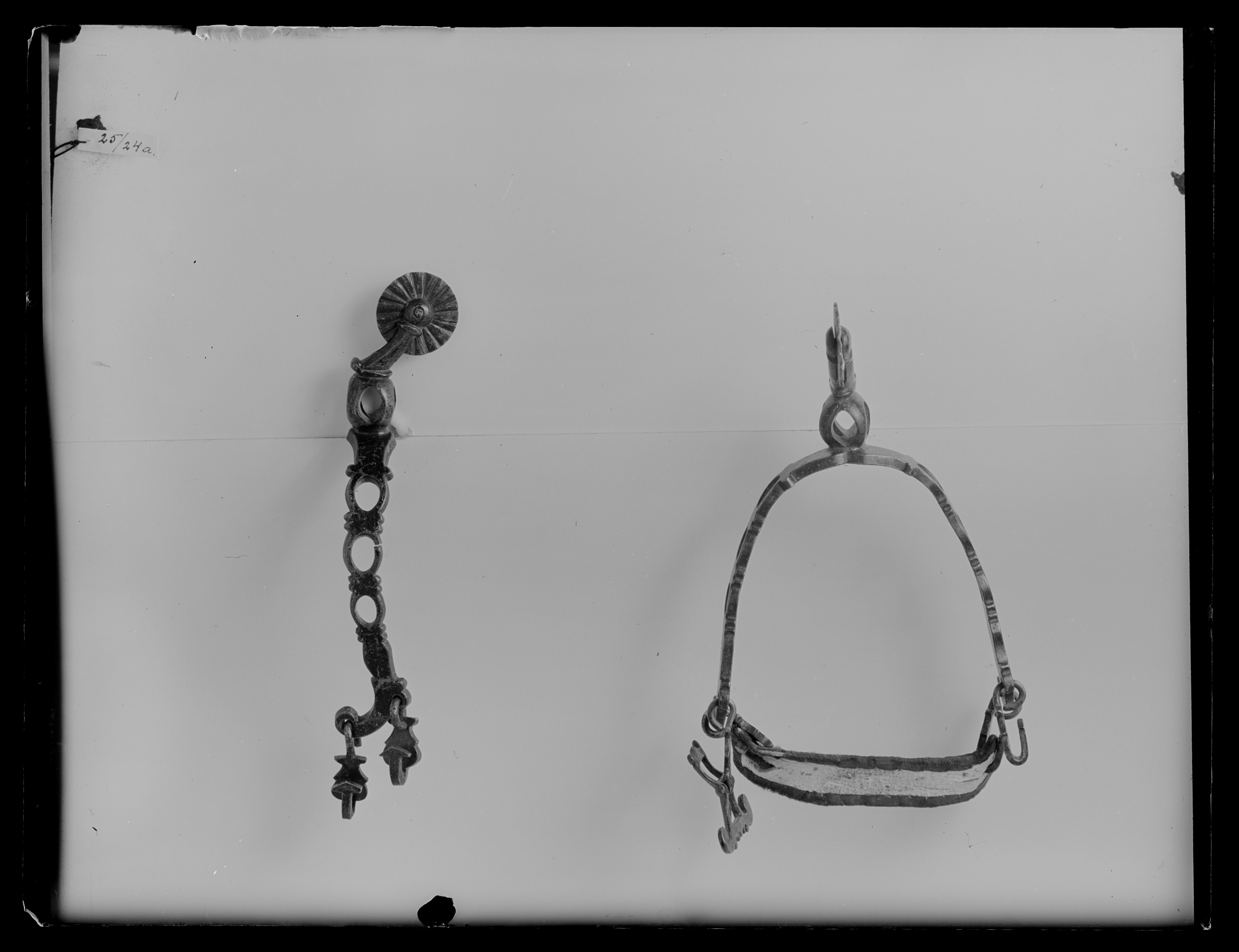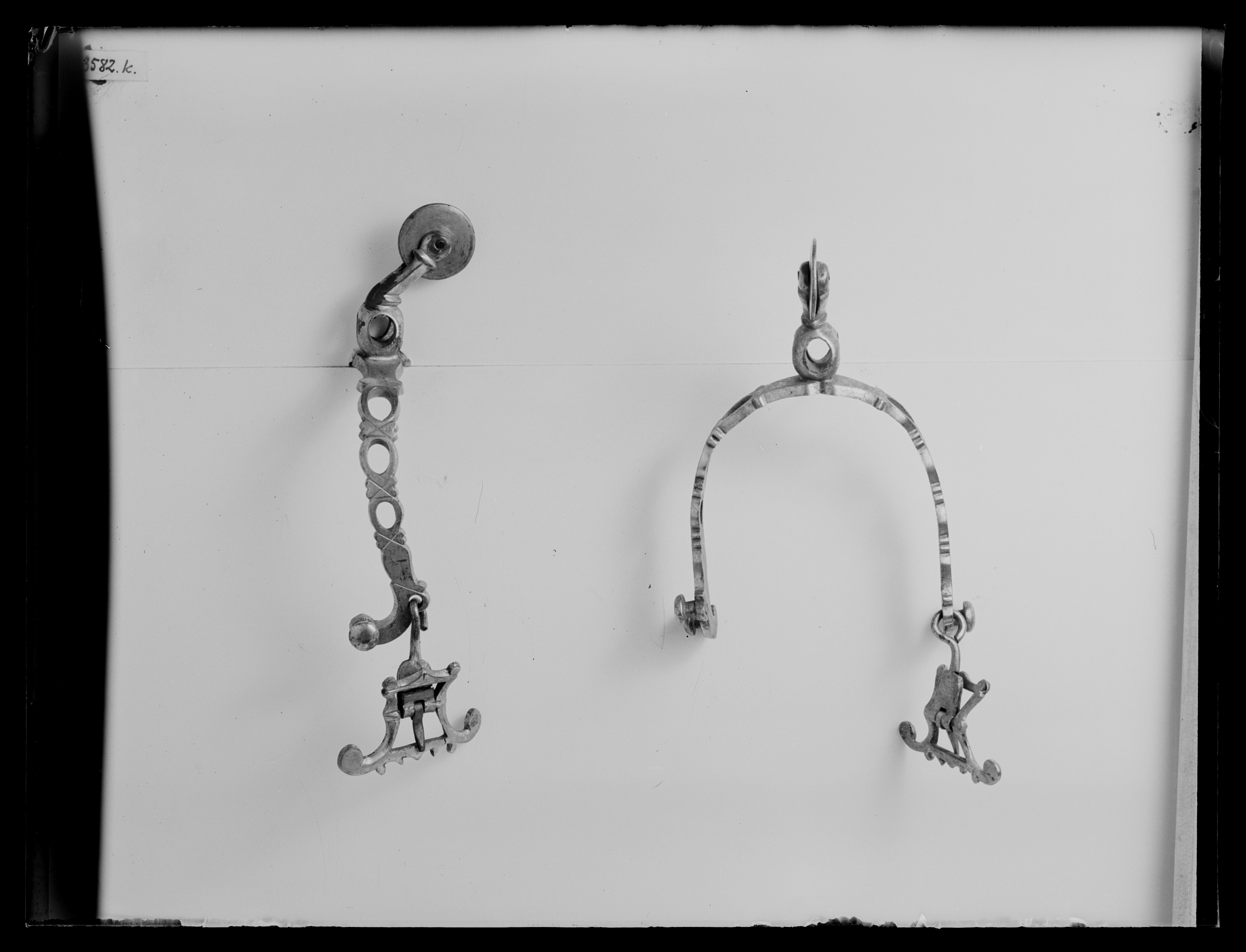 Sporre av förgylld mässing i sin helhet konturerad och genombruten med ovala hål samt kryssformiga infilningar. U-formade skänklar nedåtböjda i ändarna 45 mm lång uppåtböjd hals. Delen närmast skänklarna kubformad och genombruten. Klinga i form av trissa. Vid skänklarnas ändar på ena, två välvda knappar på hals, på den andra en knapp samt rektangulär remsölja med två kraftigt utdragna hörn. Hör till mindre Serafimerdräkt, inlämnad till Klädkammaren 1854 av överkammarherren m.m. Gustaf Göran Gabriel Oxenstierna av Korsholm och Wasa (1793-1860, Elg.tab.6) underceremonimästare vid KMO 1836-1850. Katalogisering:Lena Nordström 1971-05-25, inmatning-utskrift PAr 1997-03-03.