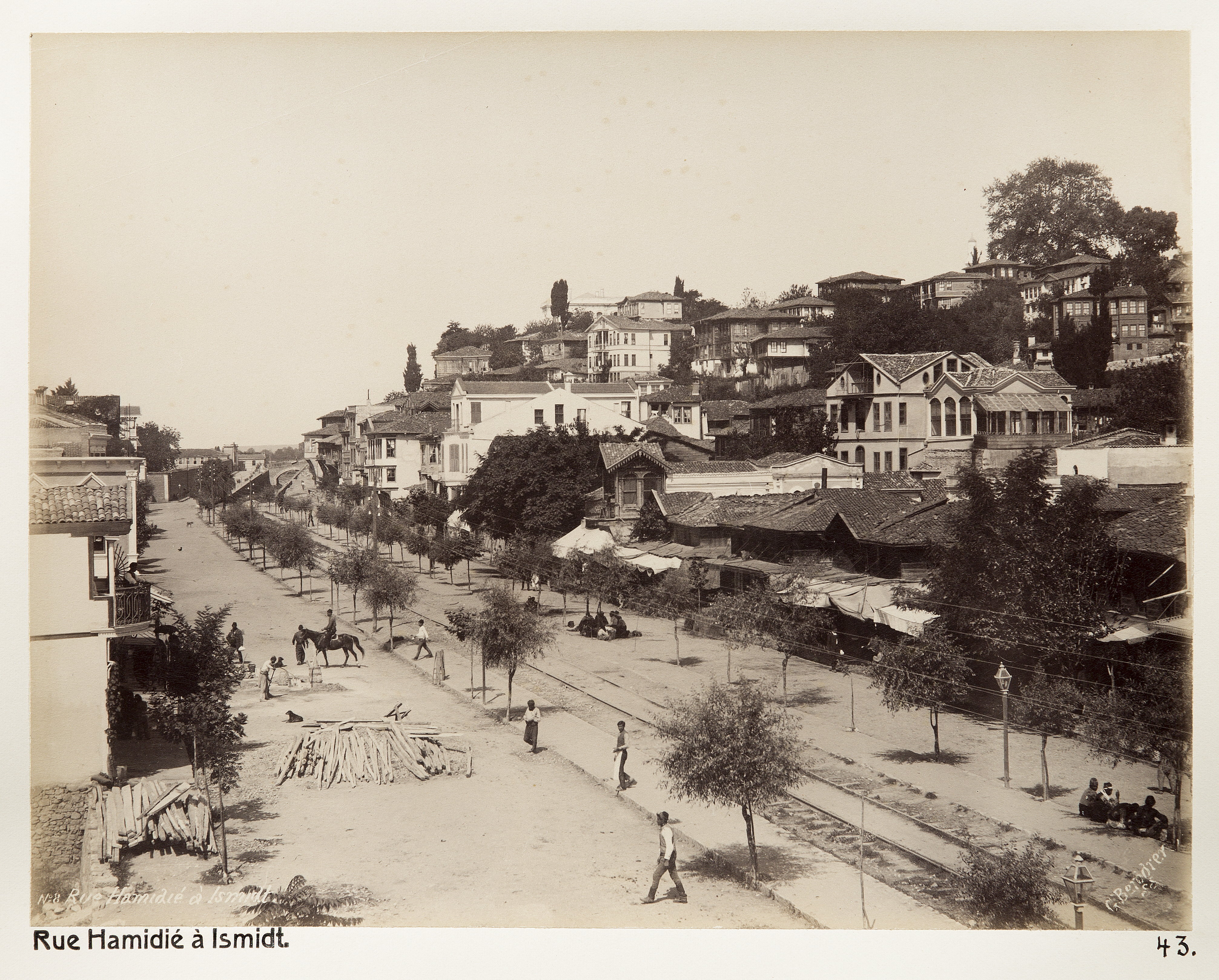 En gata i İzmit. Text på originalet: "Rue Hamidié à Ismidt." Fotografierna LXVI:O.01.-54. kommer från resan till Turkiet och Mindre Asien som Wilhelmina och Walther von Hallwyl gjorde den 27 april - 20 juni 1901. De lämnade Sverige den 5 november 1900 för Egypten, där de stannade till den 28 mars 1901, då de fortsatte till Palestina. Den 27 april fortsatte de till Turkiet och Mindre Asien. Med på resan var Wilhelminas sällskapsdam, fröken Ida Uhse. I Konstantinopel (Istanbul) anslöt sig Wilhelminas mor Johanna Kempe och kusindottern Elma Hök. Fotografierna är inköpta av Wilhelmina i Konstantinopel (Istanbul) och Brussa. Alla uppgifter kommer från Ida Uhses reseanteckningar.