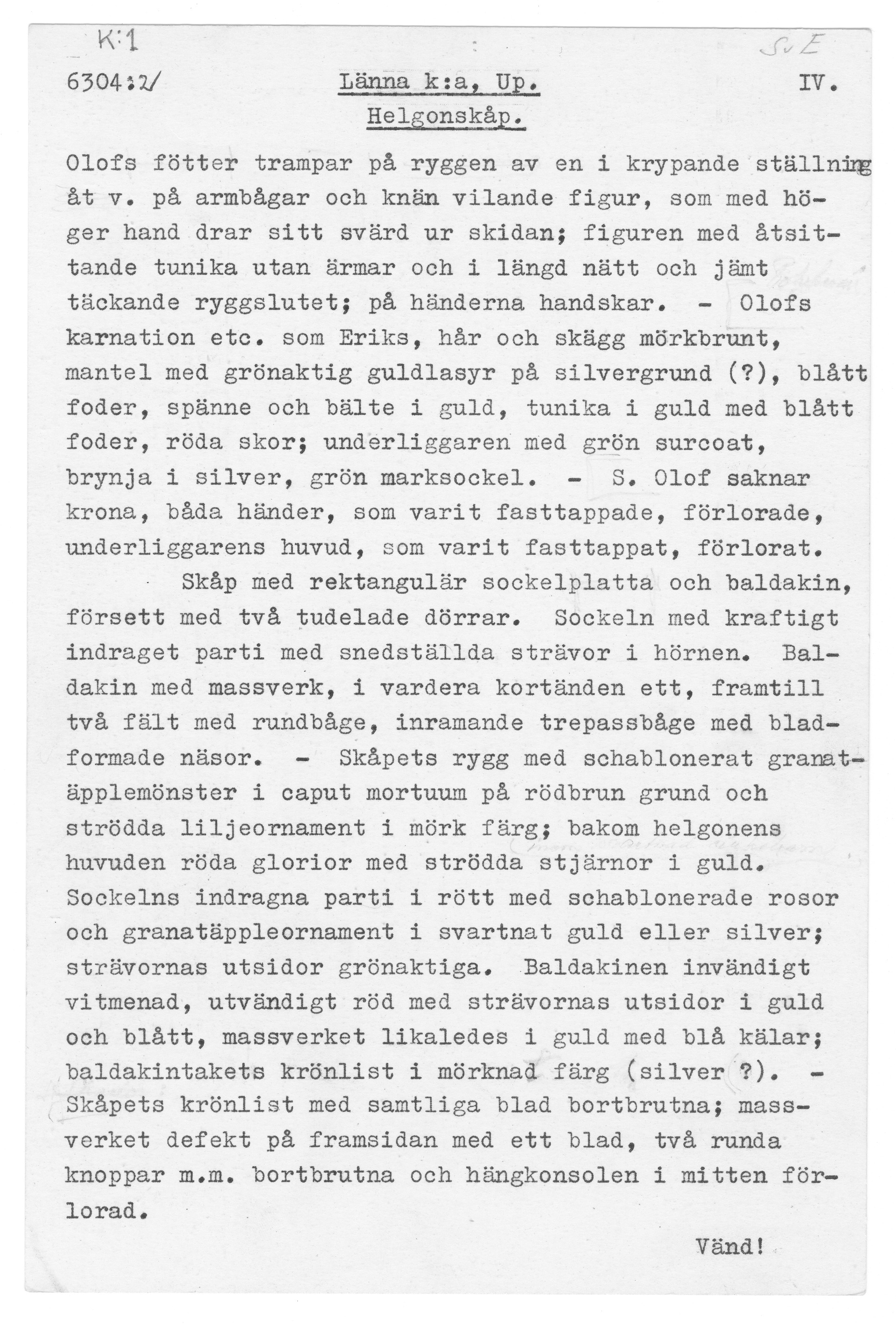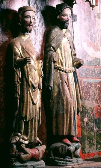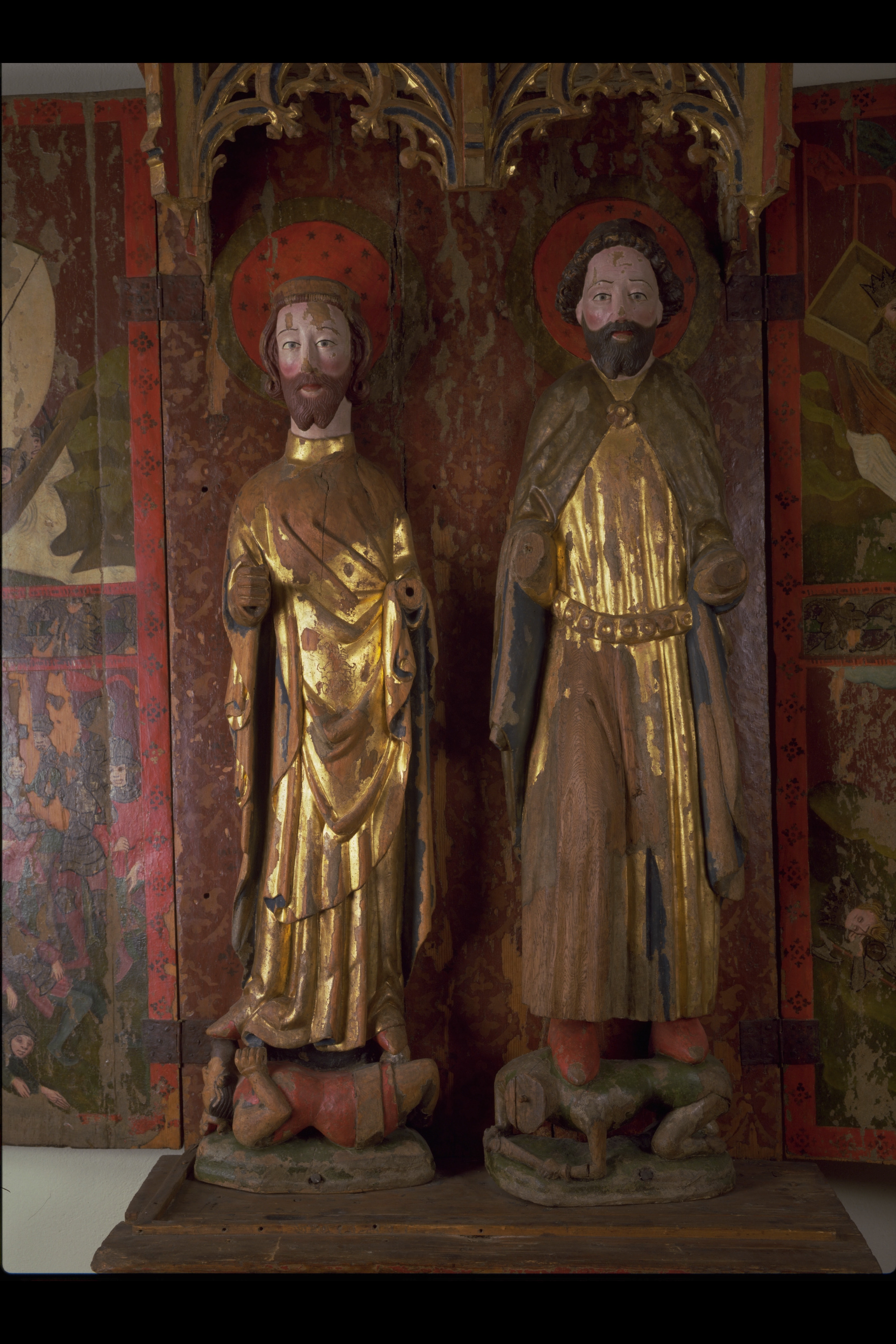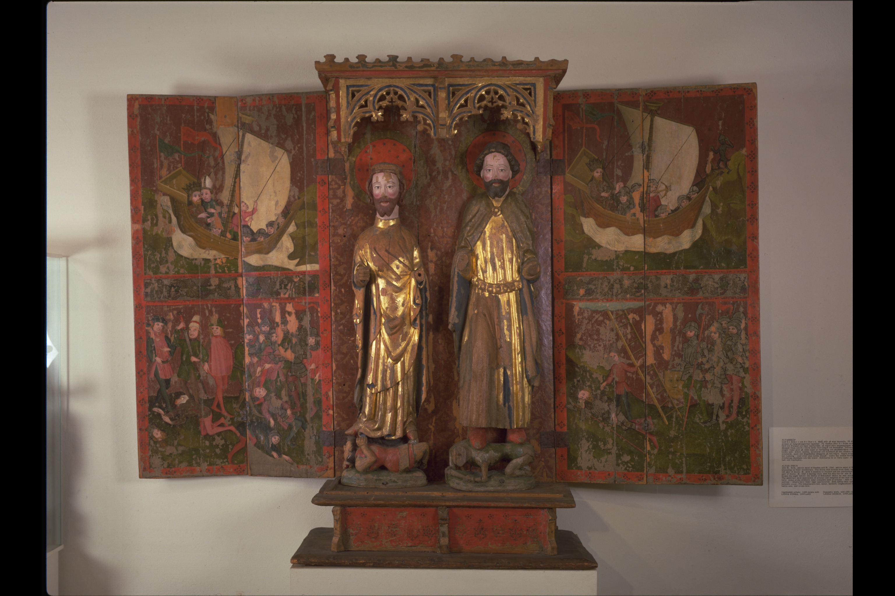 S Olof av ek, S Erik av lövträ, skåp av furu. Kondition: händer och attribut bortfallna (Eriks högra hand bevarad), båda kronorna förlorade, Olofs underliggare saknar huvud. Färg: betydande partier bevarade, målningarna i förhållandevis god kondition.