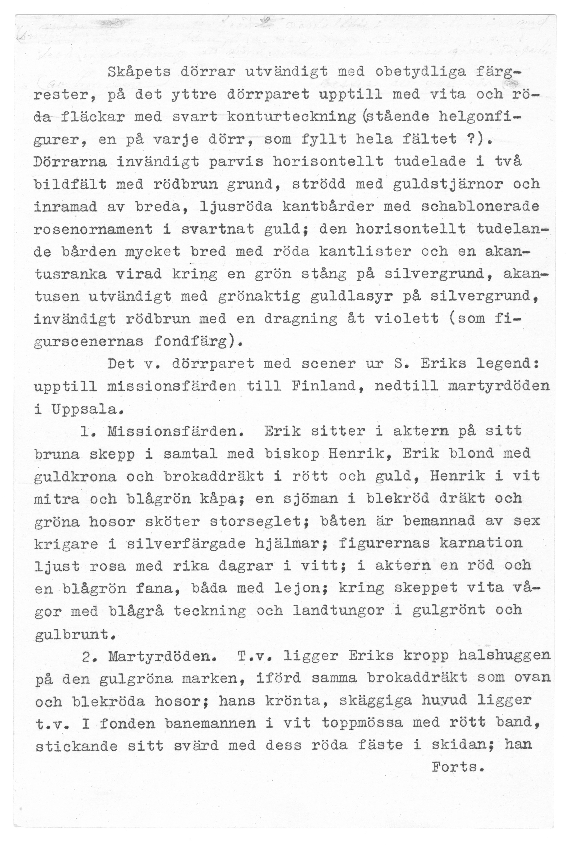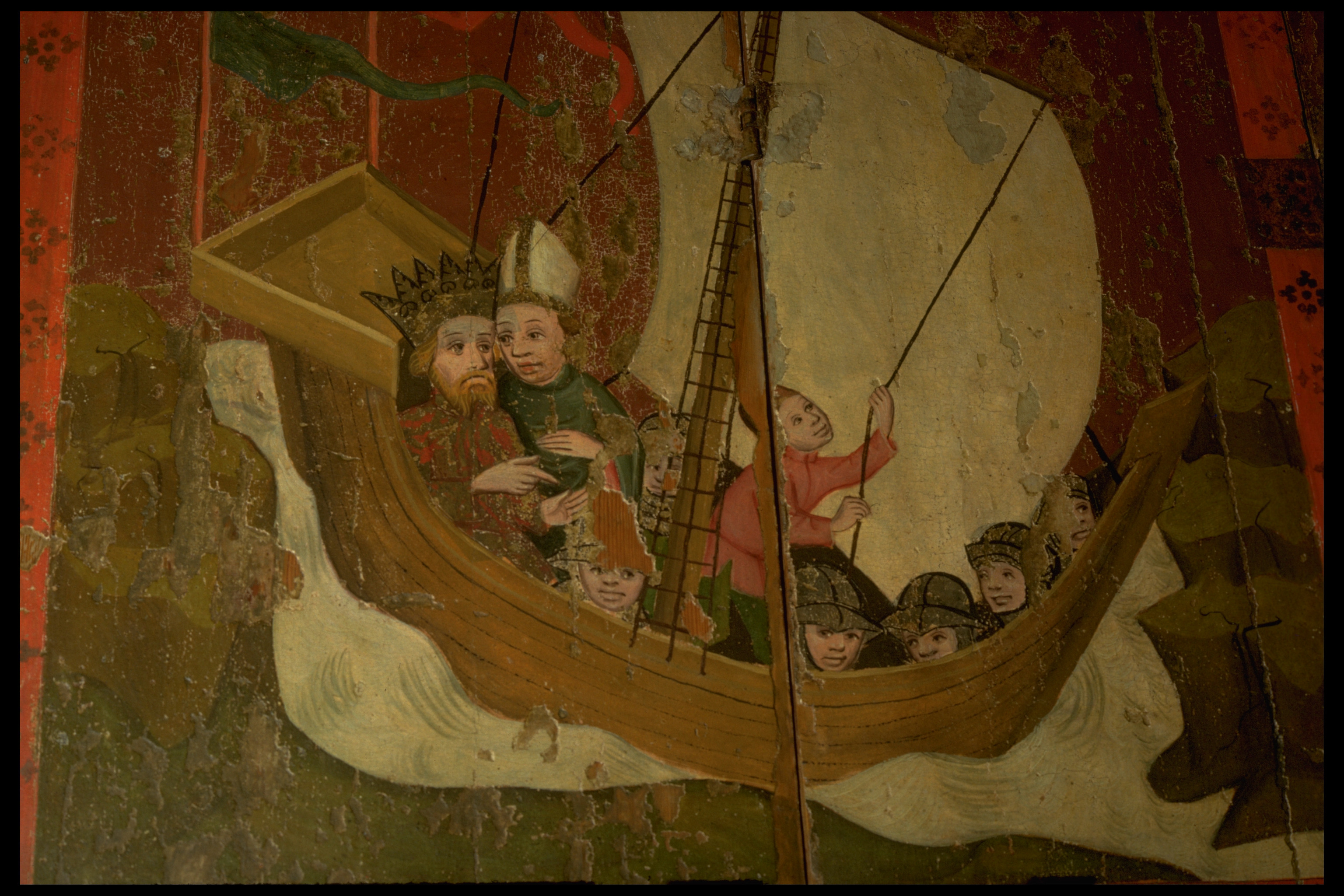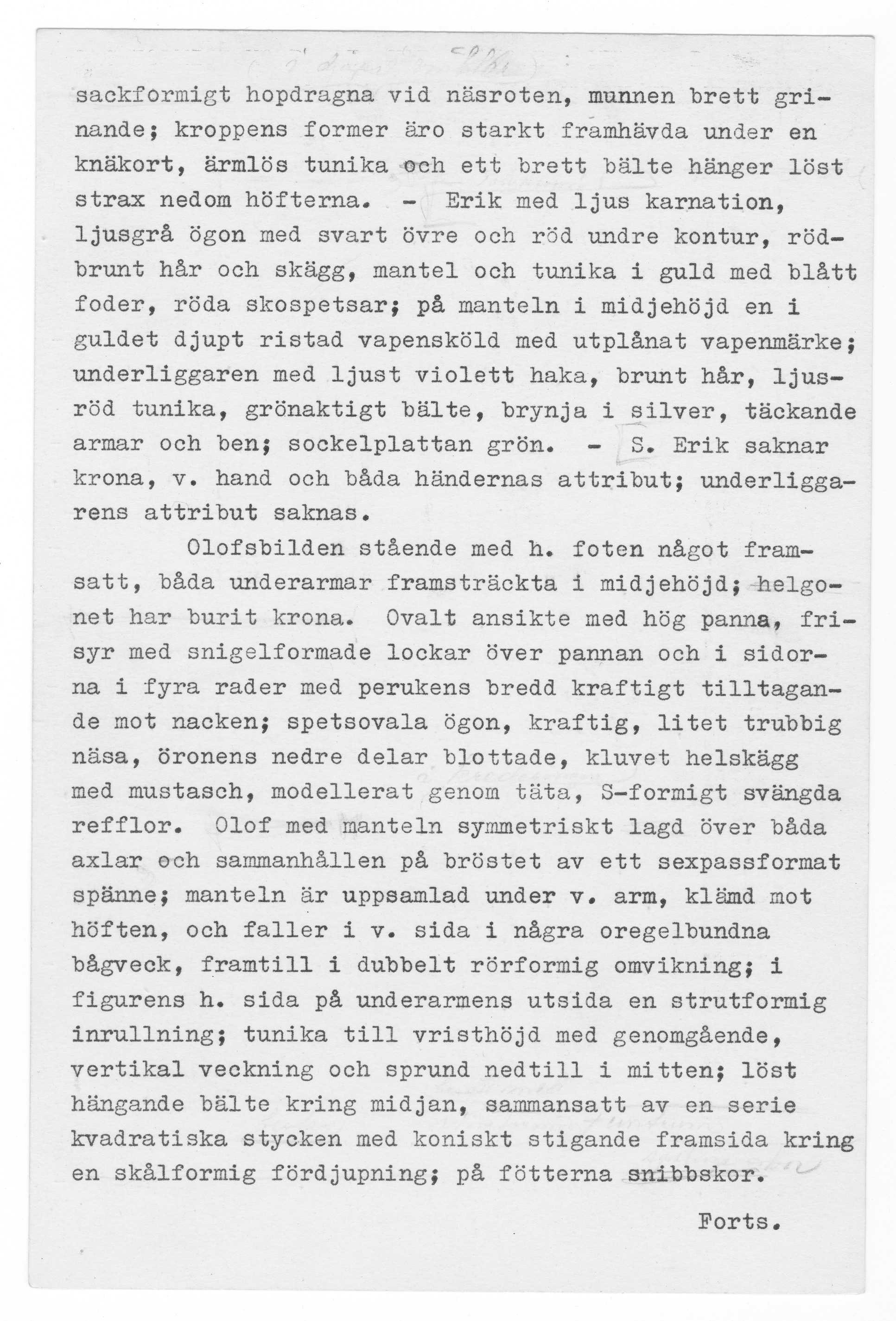 S Olof av ek, S Erik av lövträ, skåp av furu. Kondition: händer och attribut bortfallna (Eriks högra hand bevarad), båda kronorna förlorade, Olofs underliggare saknar huvud. Färg: betydande partier bevarade, målningarna i förhållandevis god kondition.