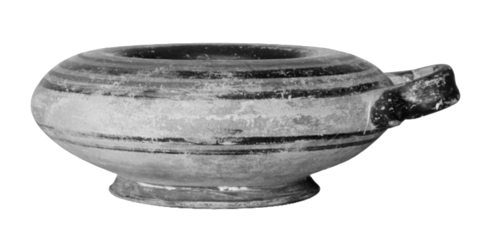 DRYCKESKÄRL (kothon) från Syrakusa, Sicilien. Av ljusbrunt, brändt lergods. Lågt, starkt vulstigt, med rundad, nedåt inviken mynningskant, på snett utstående låg fotkant samt med ett liggande bågböjt, grovt handtag med grunt kälad utsida och utdragna fästen. Dekor, i färger. Mått: Höjd: 6,3 cm.; diameter: 15,8 cm. Fotplatta, diameter: 9 cm.