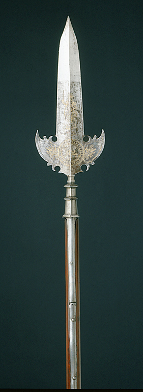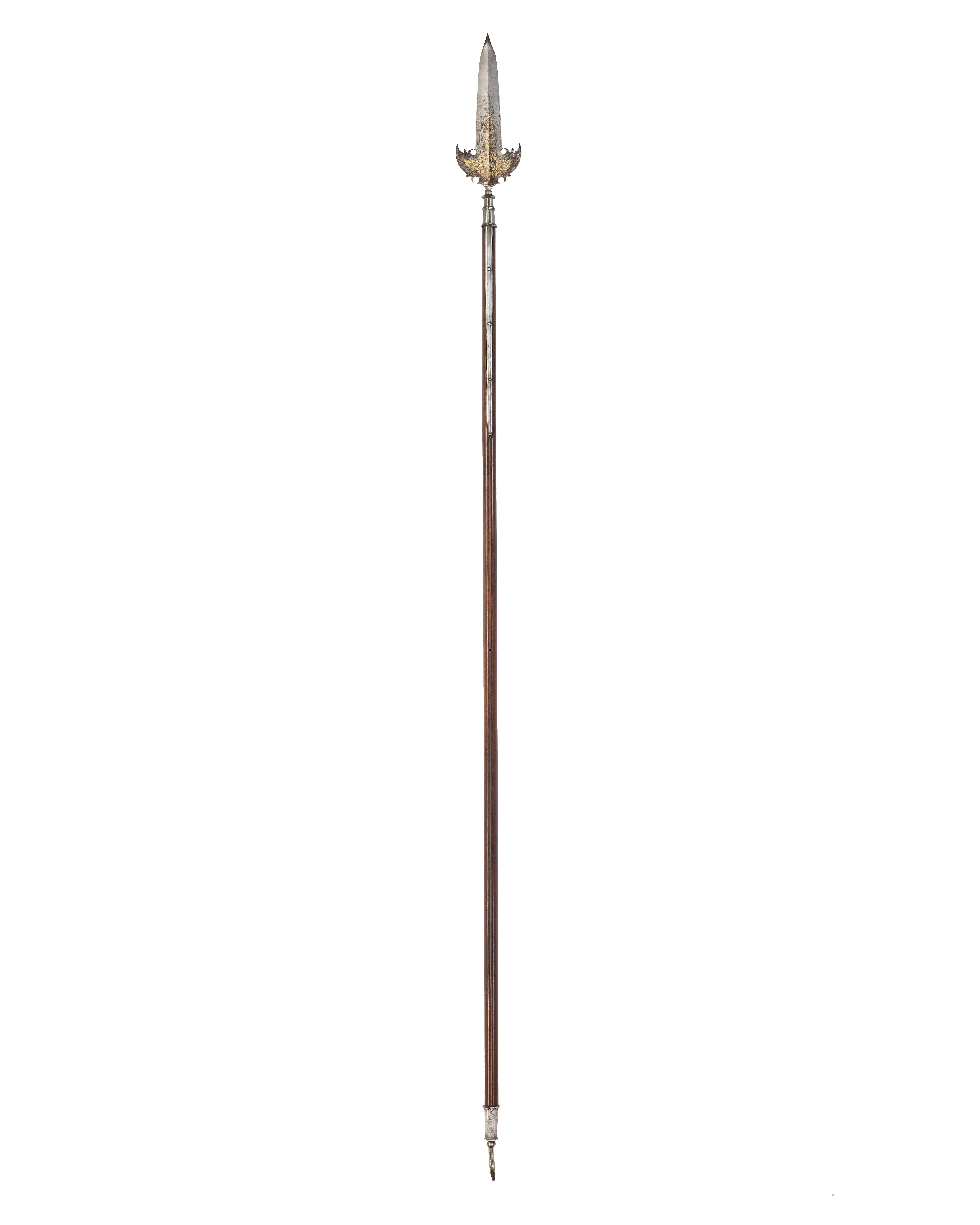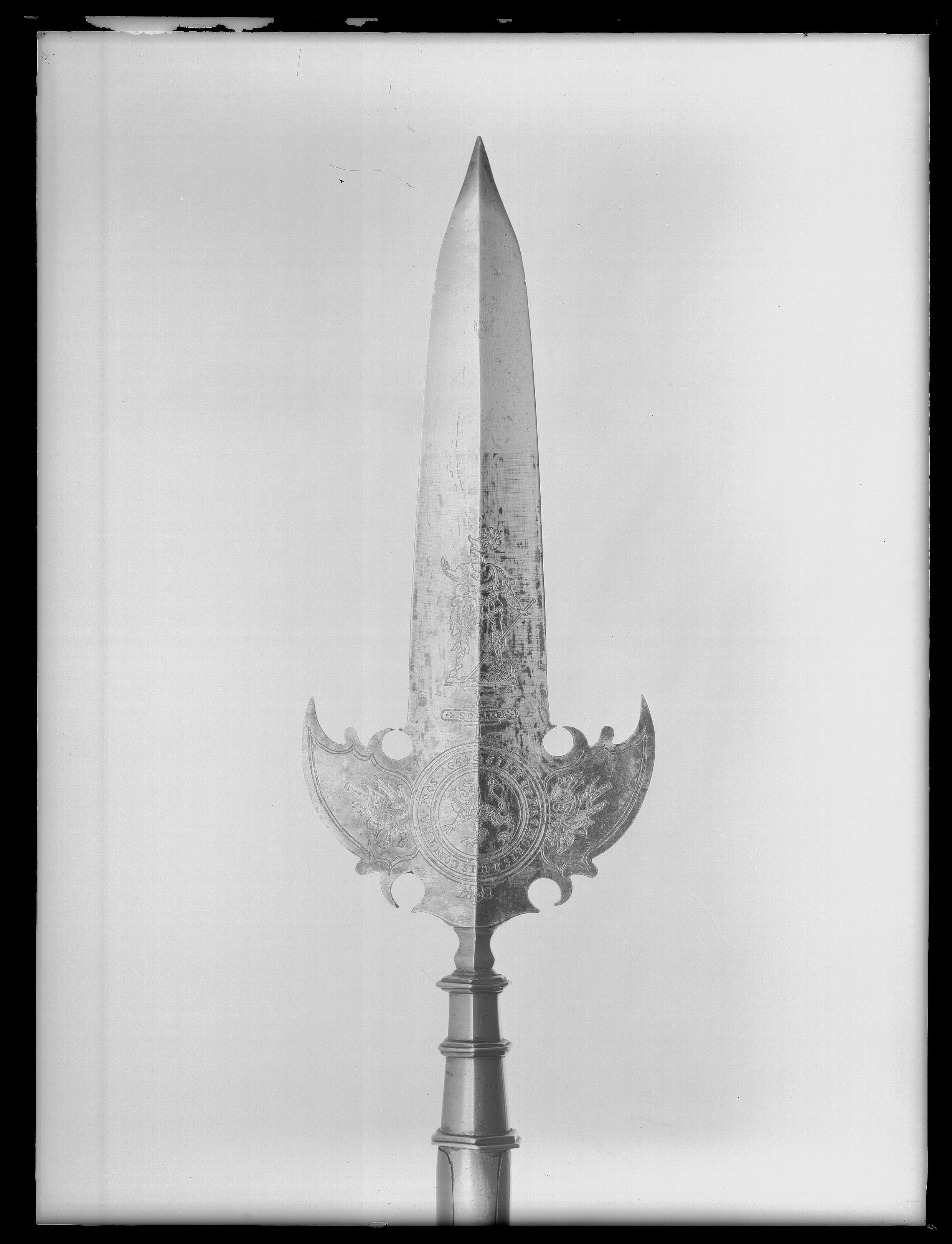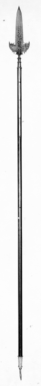 Klinga och holk i ett stycke. Klinga med längsgående mittås och mötande, jämnbreda skär, blånerad till två tredjedelar från basen. Etsad och förgylld ornering i form av på båda sidor en krigargestalt, därnedanför en liggande oval med på ena sidan text: "SOLI DEO" och på den andra otydliga, s-formiga tecken. Klingans bas med två symmetriskt utsvängda vingar med konturerade baspartier. På basens båda sidor två koncentriska cirklar med text: "SI DEUS PRO NOBIS QUIS CONTRA NOS 1654". Inom cirkeln ett etsat lejon. Från cirklen utgår mot båda vingarna en trofégrupp. Utmed kanterna dubbla, etsade linjer. Mellan klinga och holk en vulstformig, sex sidighals. Holk sexsidig, uppåt avsmalnande , upptill och nedtill en sexsidig fläns, däremellan ytterligare en fläns. Utgående från holkens nederdel, två 346 mm långa skenor infällda i skaftet och fästade med vardera fyra nitar. Skaft av brunt, polerat ädelträ (mahogny?) med runt tvärsnitt. Doppsko, h: 124 mm, sexsidig, nedåt avsmalnande, upptill och nedtill en sexsidig fläns och därnedanför en fyrsidig spets.