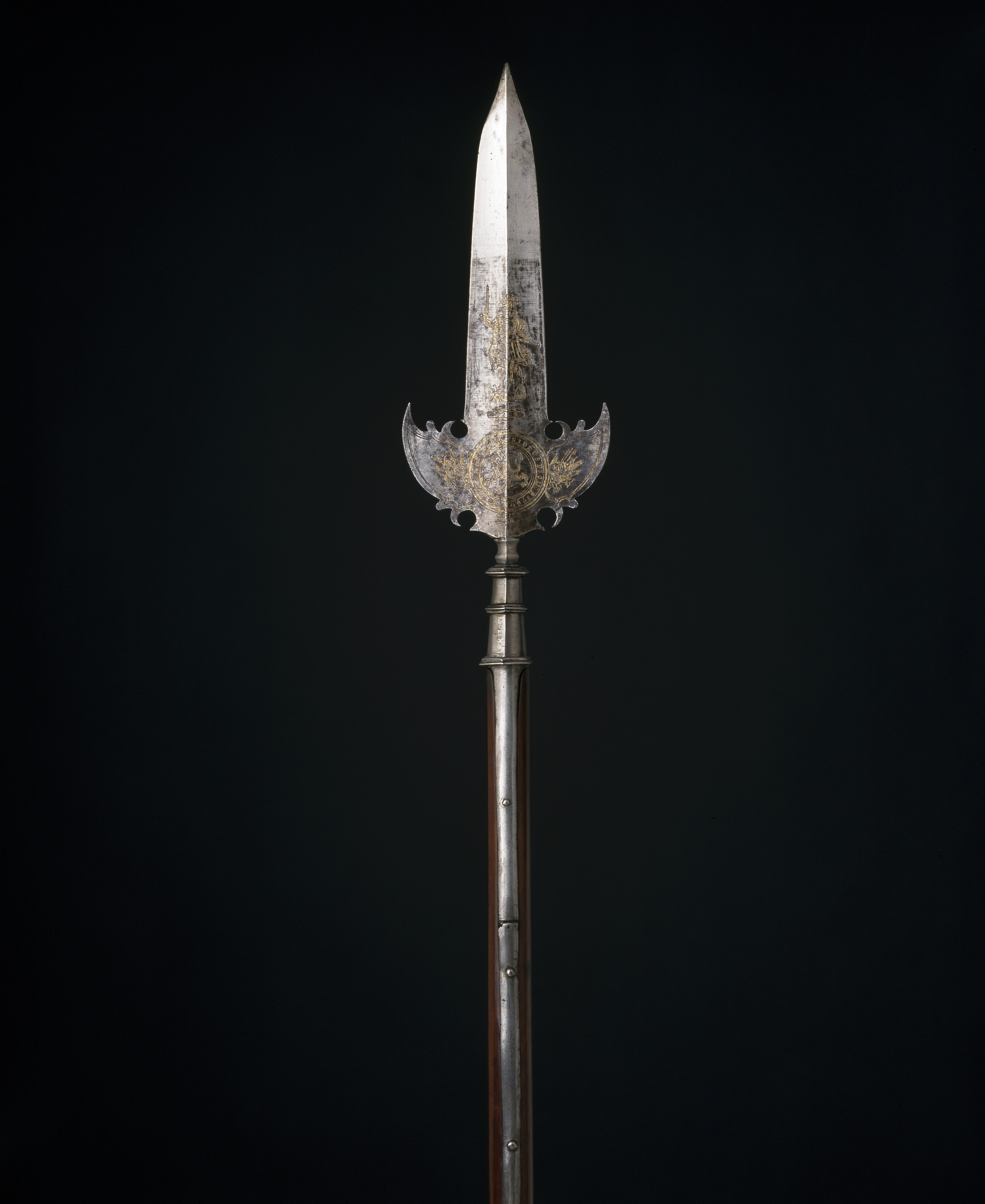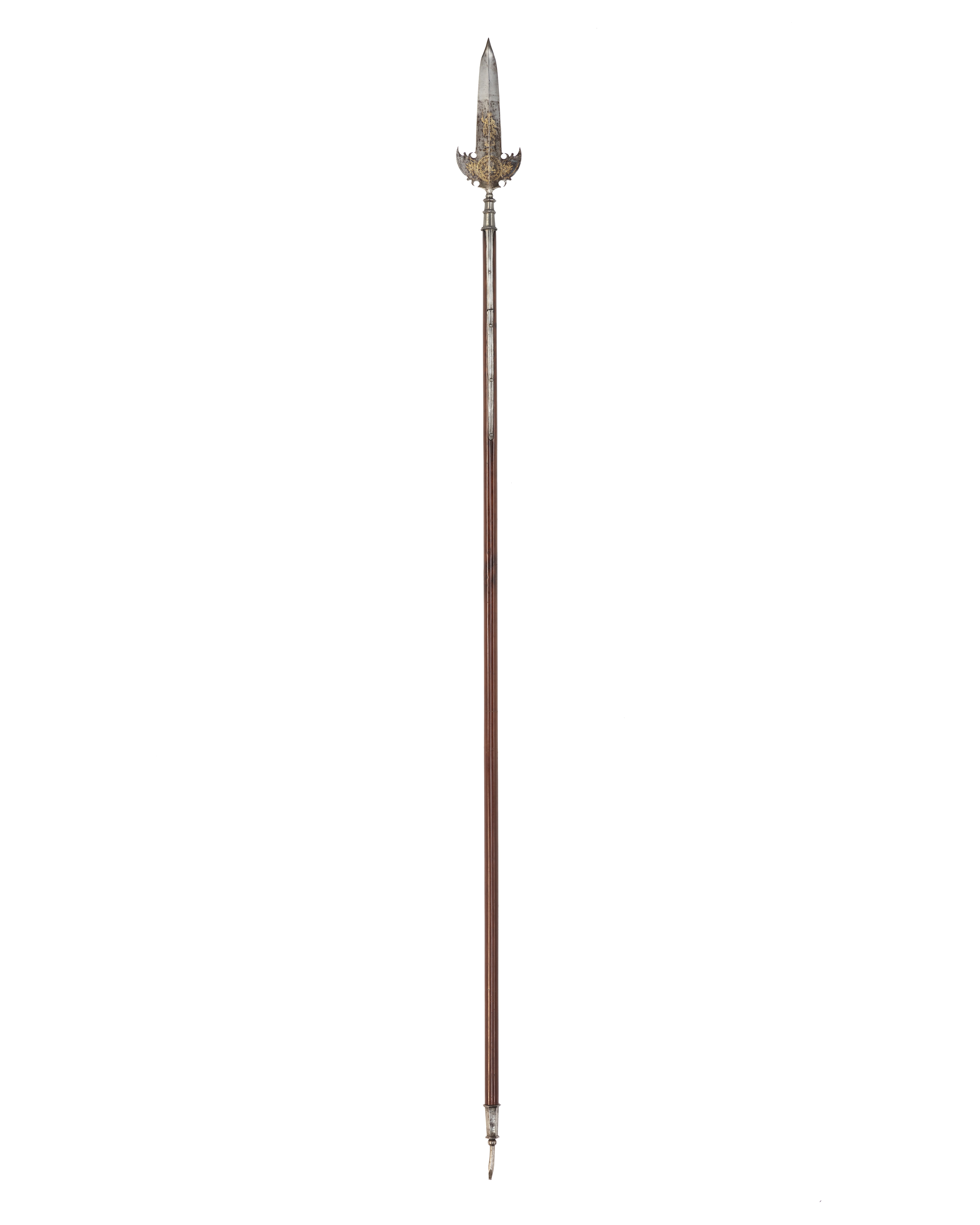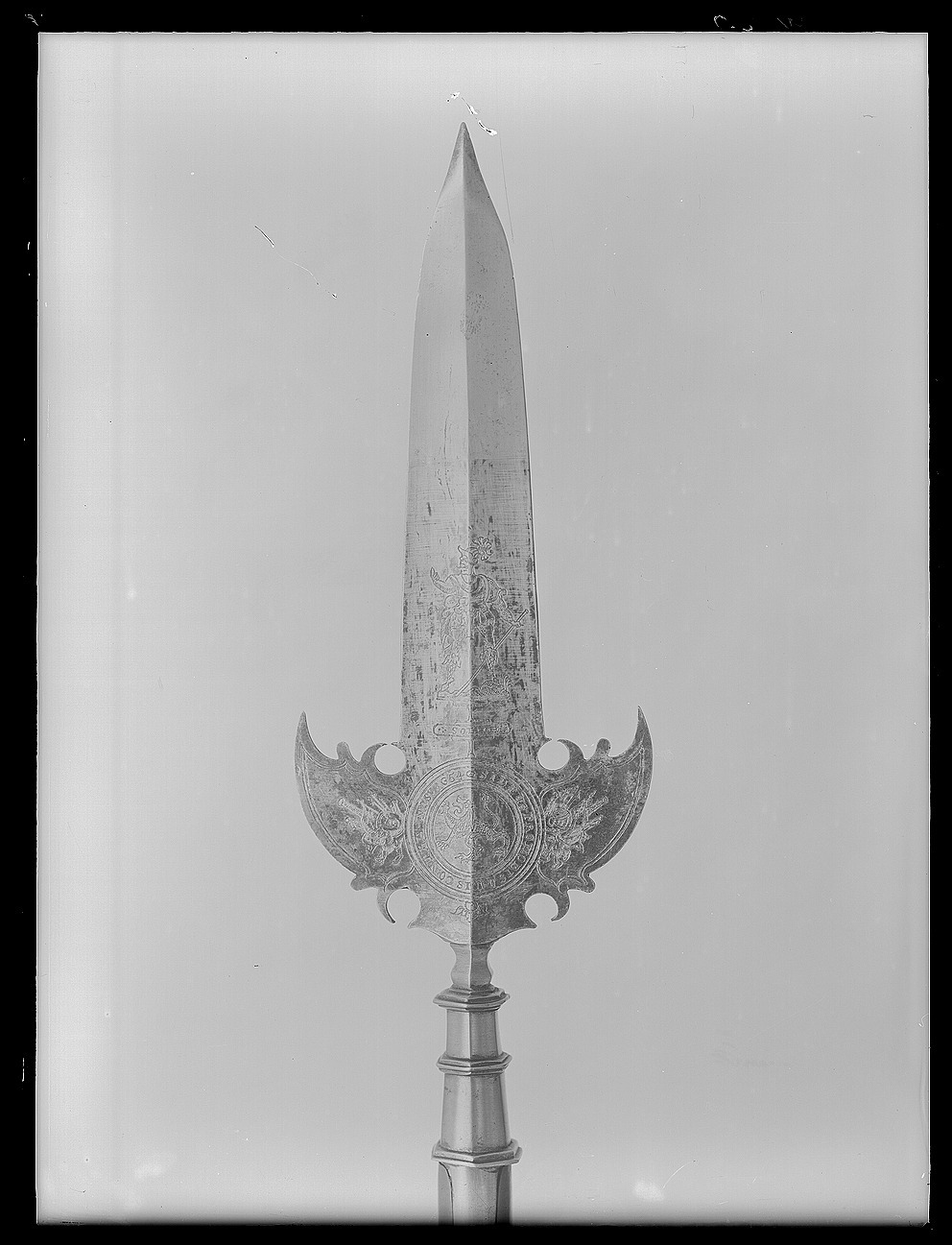 Klinga och holk i ett stycke. Klinga med längsgående mittås och mötande, jämnbreda skär, blånerad till två tredjedelar från basen. Etsad och förgylld ornering i form av på båda sidor en krigargestalt, därnedanför en liggande oval med på ena sidan text: "SOLI DEO" och på den andra otydliga, s-formiga tecken. Klingans bas med två symmetriskt utsvängda vingar med konturerade baspartier. På basens båda sidor två koncentriska cirklar med text: "SI DEUS PRO NOBIS QUIS CONTRA NOS 1654". Inom cirkeln ett etsat lejon. Från cirklen utgår mot båda vingarna en trofégrupp. Utmed kanterna dubbla, etsade linjer. Mellan klinga och holk en vulstformig, sex sidighals. Holk sexsidig, uppåt avsmalnande , upptill och nedtill en sexsidig fläns, däremellan ytterligare en fläns. Utgående från holkens nederdel, två 346 mm långa skenor infällda i skaftet och fästade med vardera fyra nitar. Skaft av brunt, polerat ädelträ (mahogny?) med runt tvärsnitt. Doppsko, h: 124 mm, sexsidig, nedåt avsmalnande, upptill och nedtill en sexsidig fläns och därnedanför en fyrsidig spets.