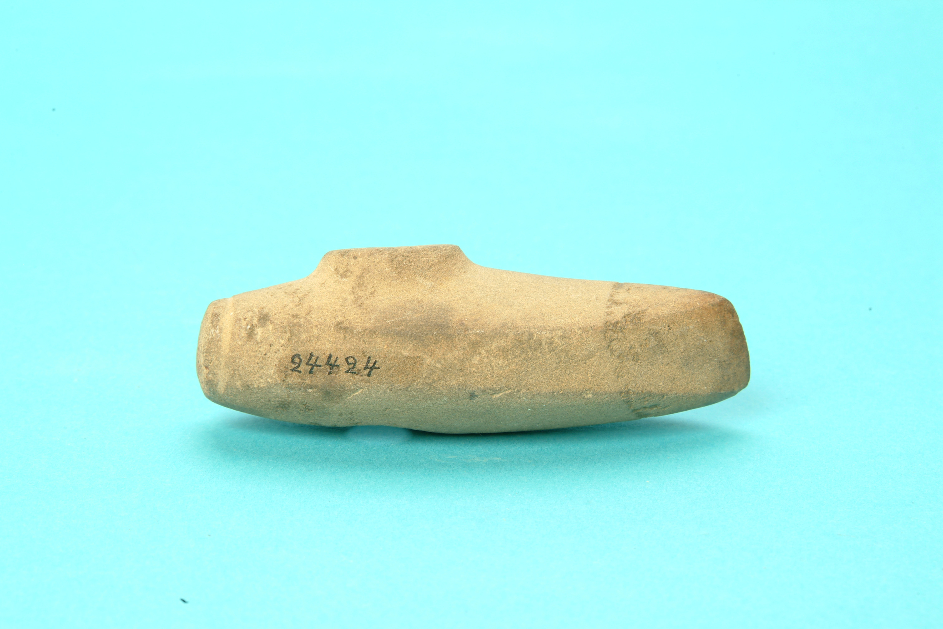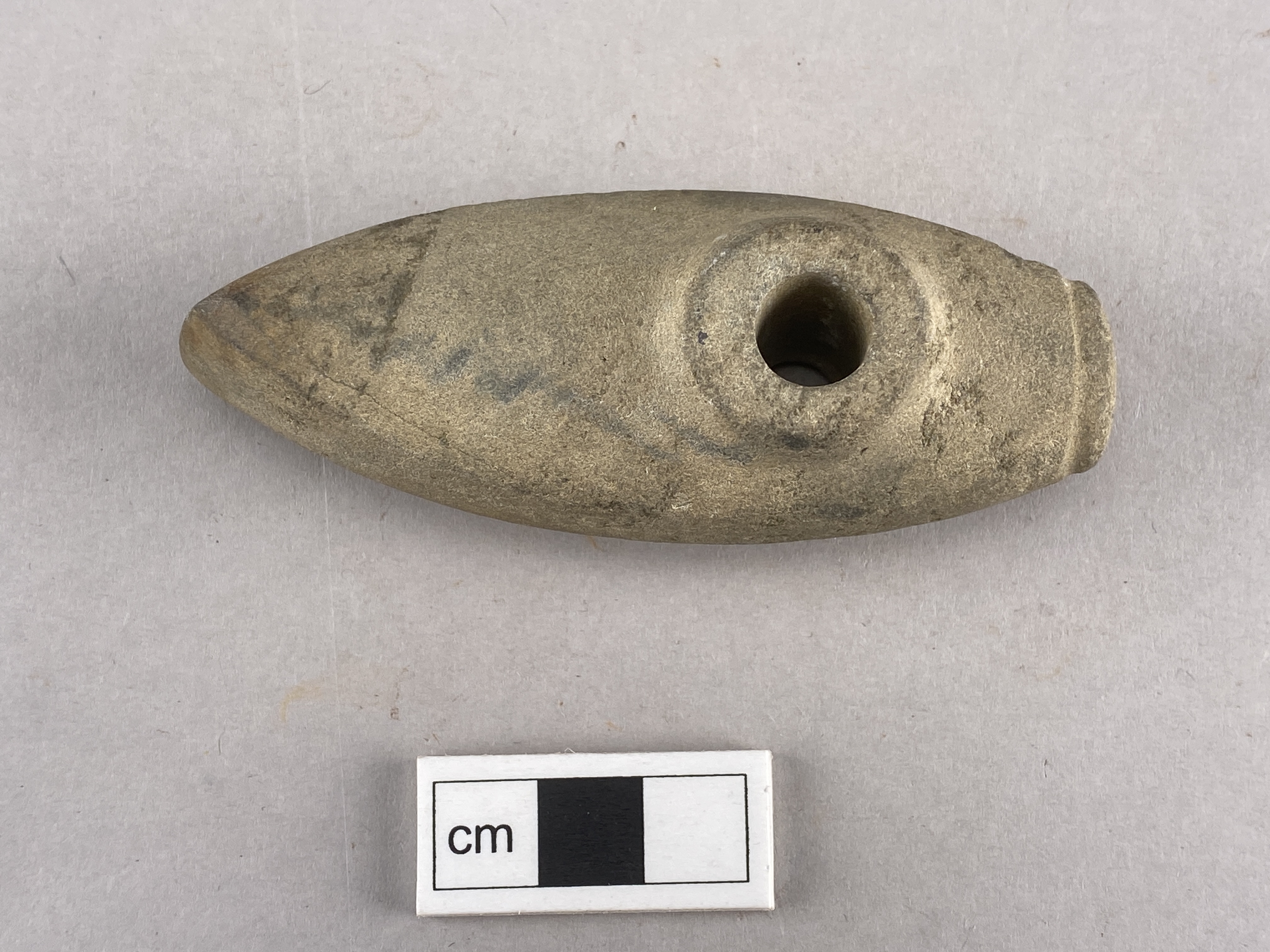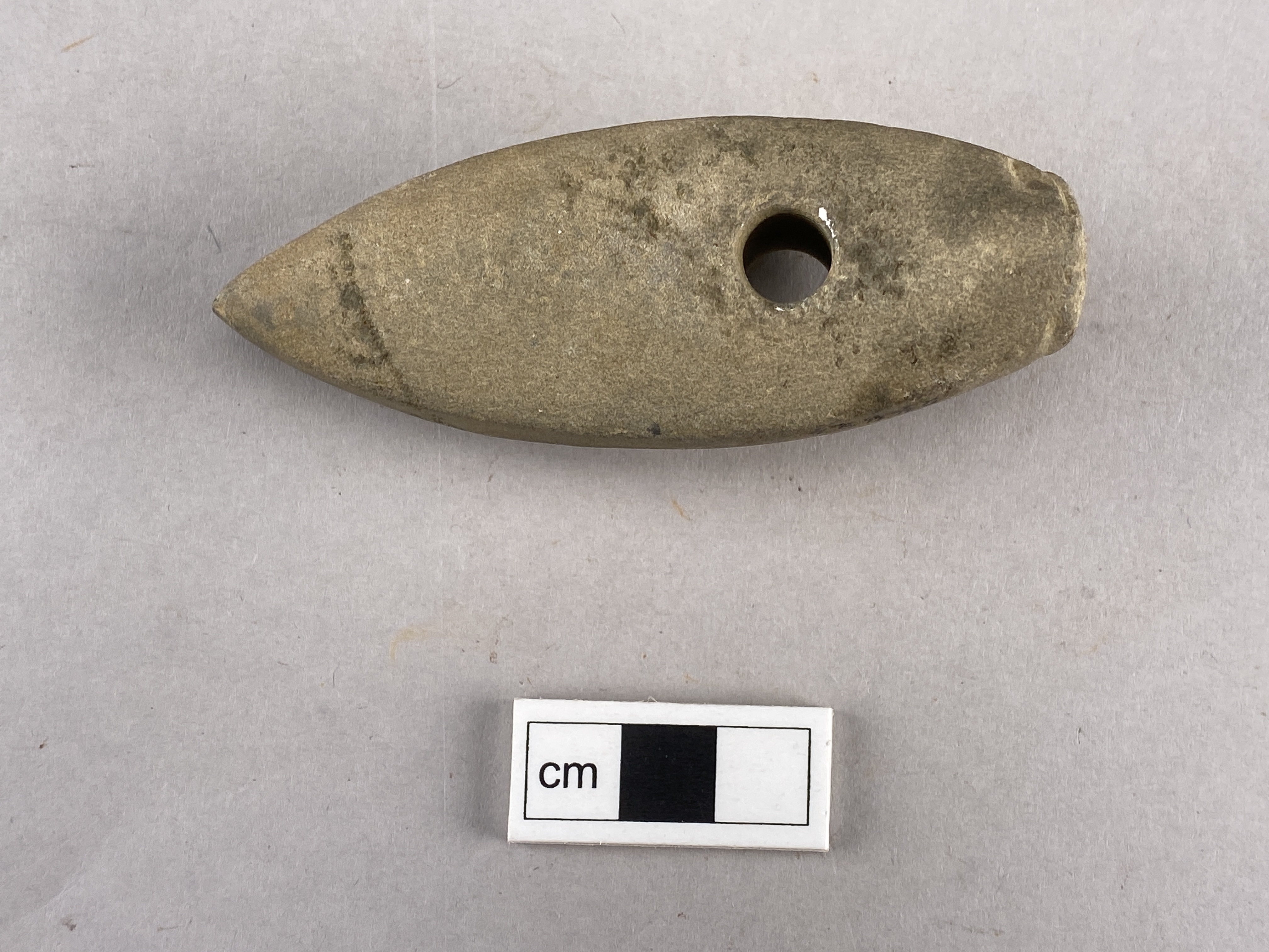 Miniatyrbåtyxa av grönsten med skafthål. Nackknoppen är avsatt med en ristad linje. Över- och undersida är välvda. Eggsidorna är plana och löpande från egg till nacke. Slipad.