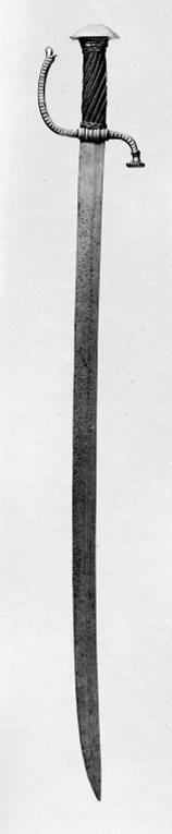 Fäste av stål. Knapp formad som en stympad låg pyramid med rektangulärt tvärsnitt, sidorna horisontellt räfflade; nederdelen insvängd, slät; vid framkantens mitt en halvcirkelformig inskärning. Pareranordning i form av en öppen bågformig handbygel och en nedåtböjd bakre parerstång med ytteränden profilerad och utsvängd till en oval skiva; ornering i form av tätt liggande tvärgående korta räfflor. Kryss brett, lågt och vertikalräfflat. Kavel med ovalt tvärsnitt, spiralräfflad och klädd med svärtat skinn, i räfflorna lindning med kedjeliknande flätad tunn ståltråd, upptill och nedtill en flätad krans av tvinnad tunn ståltråd. Klinga något böjd, eneggad med plan rygg, intill denna en grund c.10 mm bred hålkäl. På baspartiets insida en rad av fem punsad bågornament utmed hålkälen.