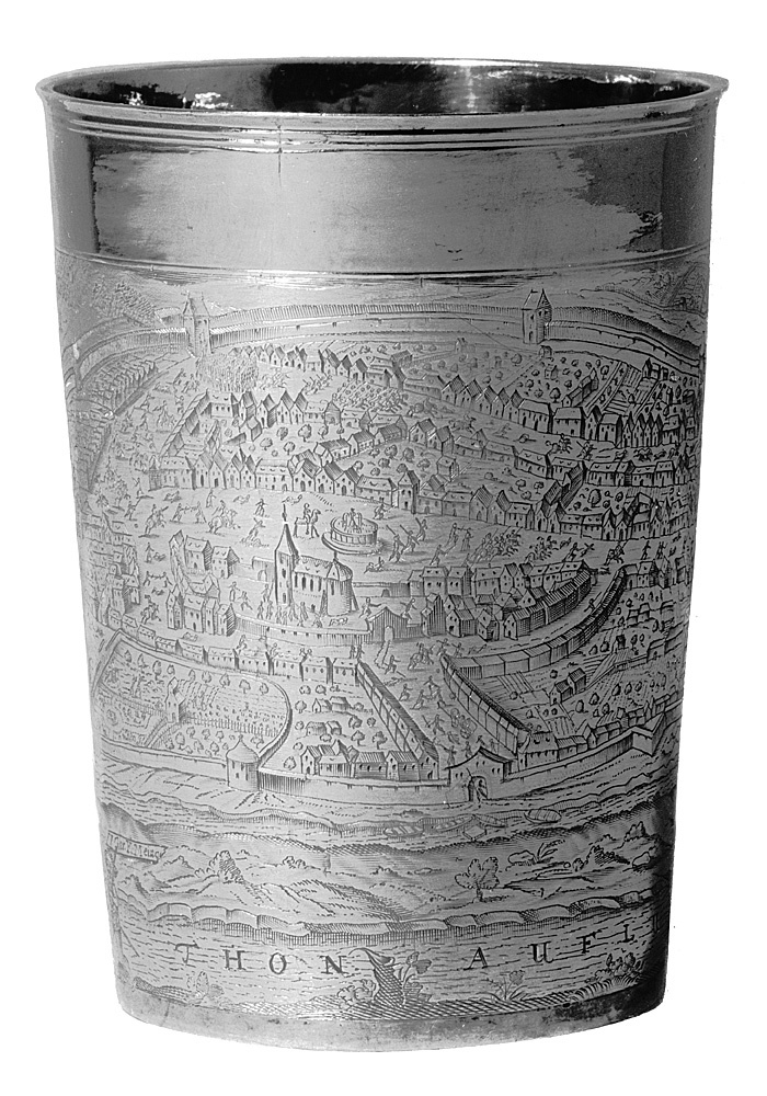 Delvis förgylld. Runt livet graverad framställning av svenskarnas erövring av Donauwörth vid floden Donau den 27 mars 1632. - " - Parcel gilt. Round the body an engraved depiction of the Swedes capturing Donauwörth on the Danube on 27 th March 1632. Inköpt av Wilhelmina von Hallwyl för 175 kr.