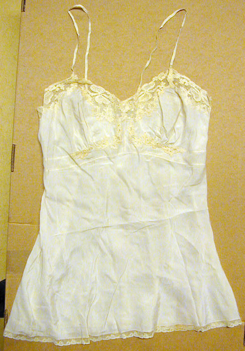 Linne av vitt siden. Kort, utsvängd. Figursydd upptill. Runt om upptill tyllspets. Broderade blomrankor går ner över bröstet. Veckad över bröstet. Kraftiga sömmar under bysten. Smala axelband, b: 6 mm. Maskinknypplad spets nedtill. I vänster sida etikett: "Helen Stuart // MADE IN ENGLAND". Märkning på etikett: 38.