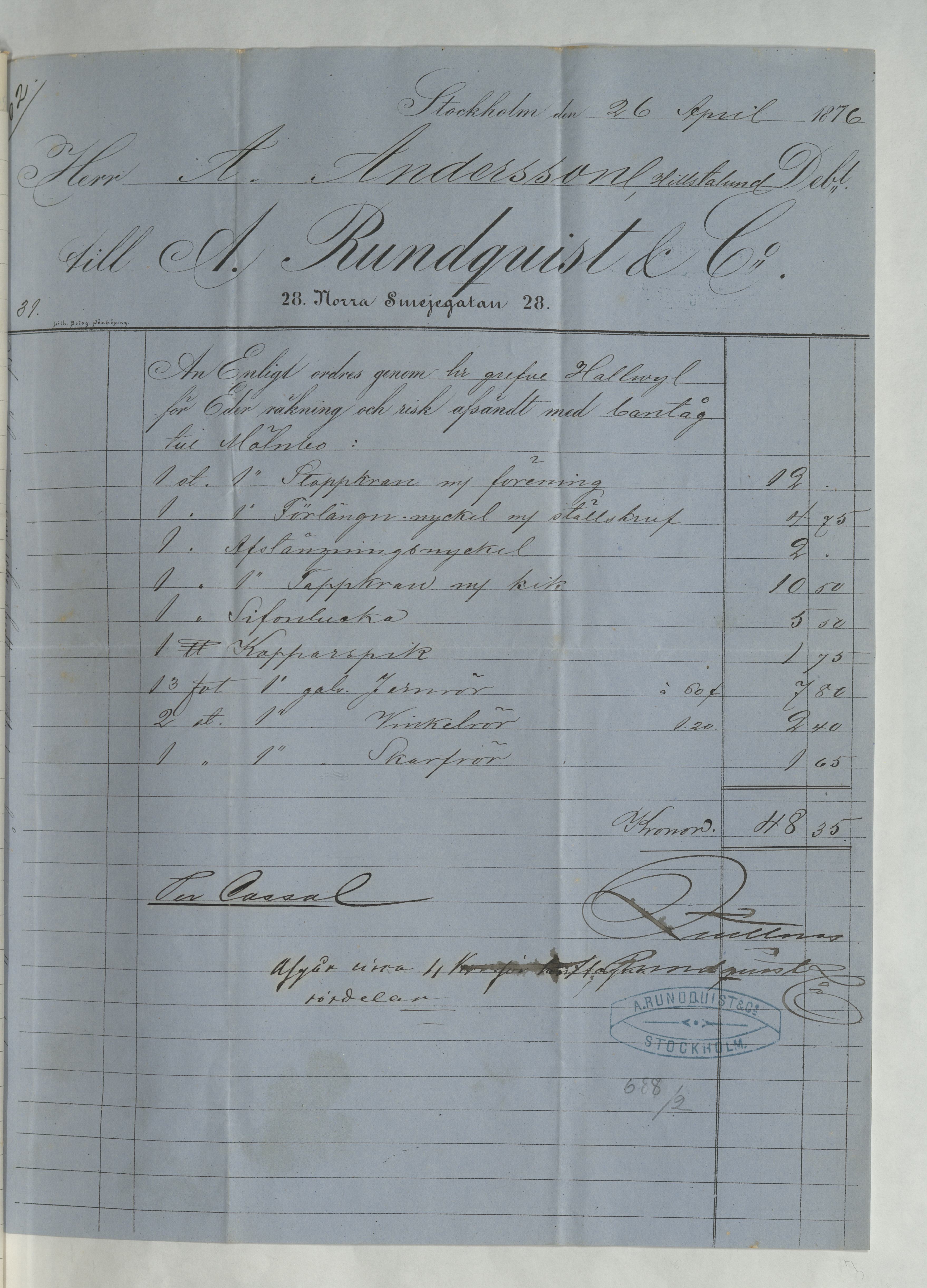 Kvitto från A. Rosberg & Co, ang "rörarbeten", till Greve W. von Hallwyl på Erikslund. Totalsumma 48:35Kr. Stockholm 26 april 1876.