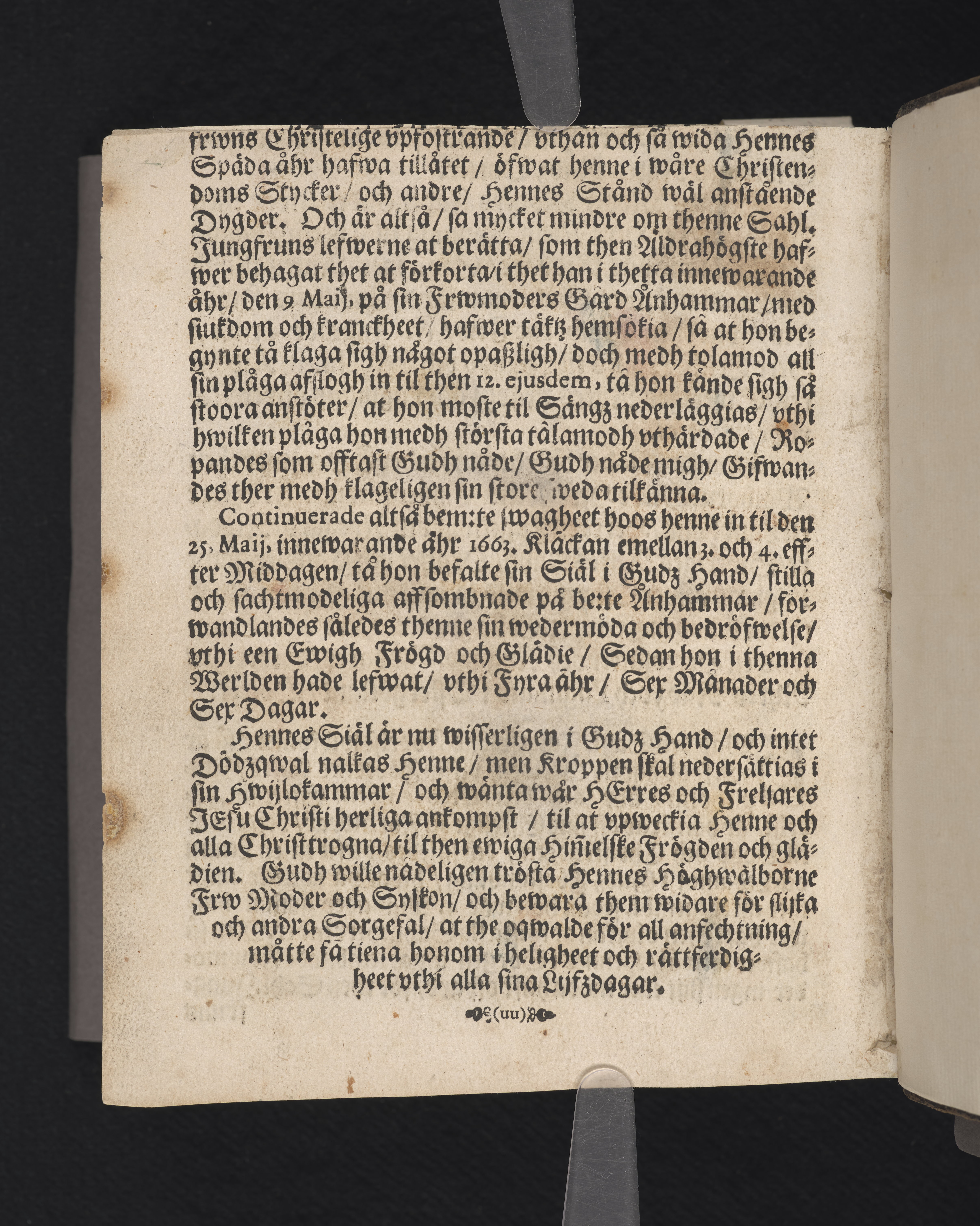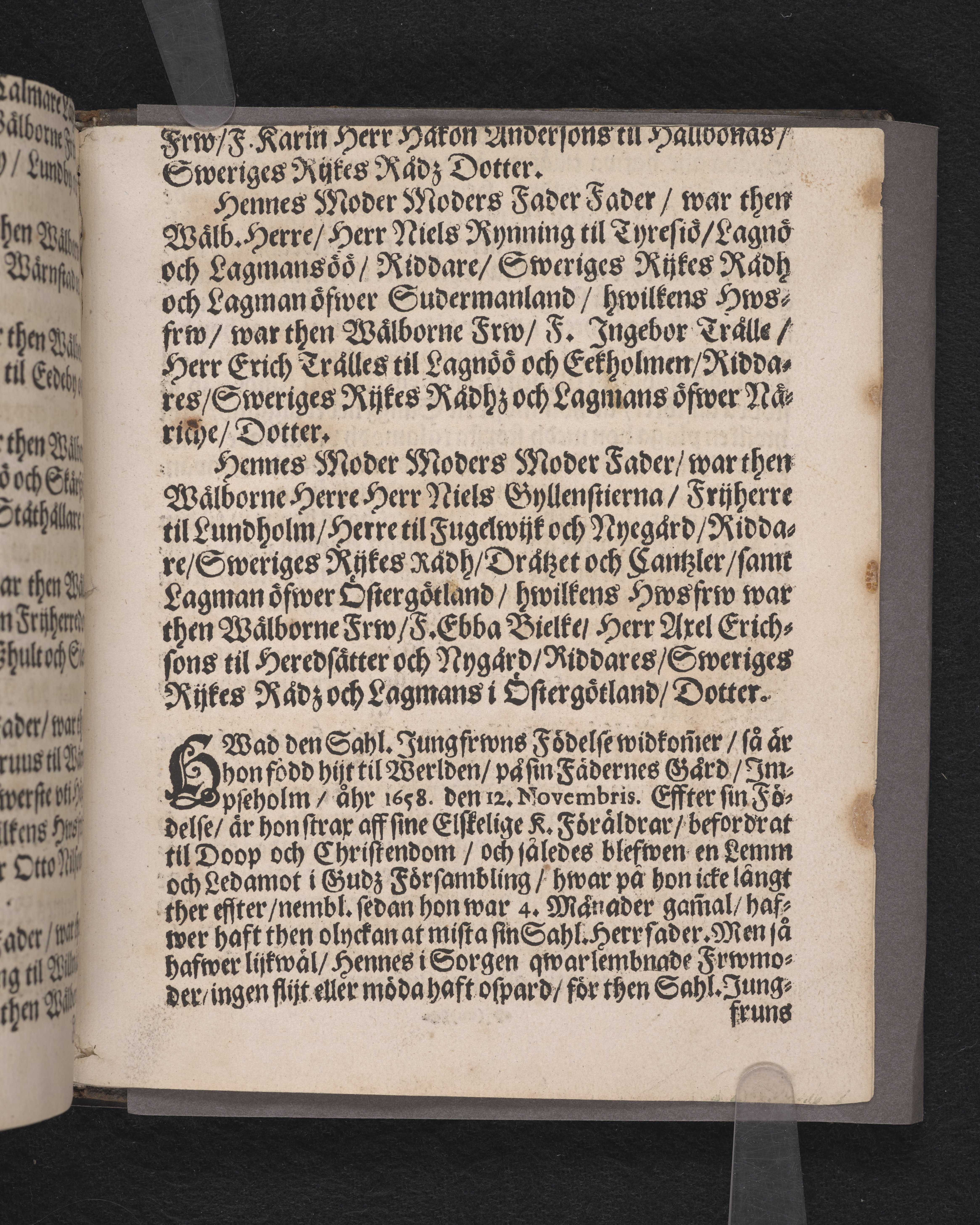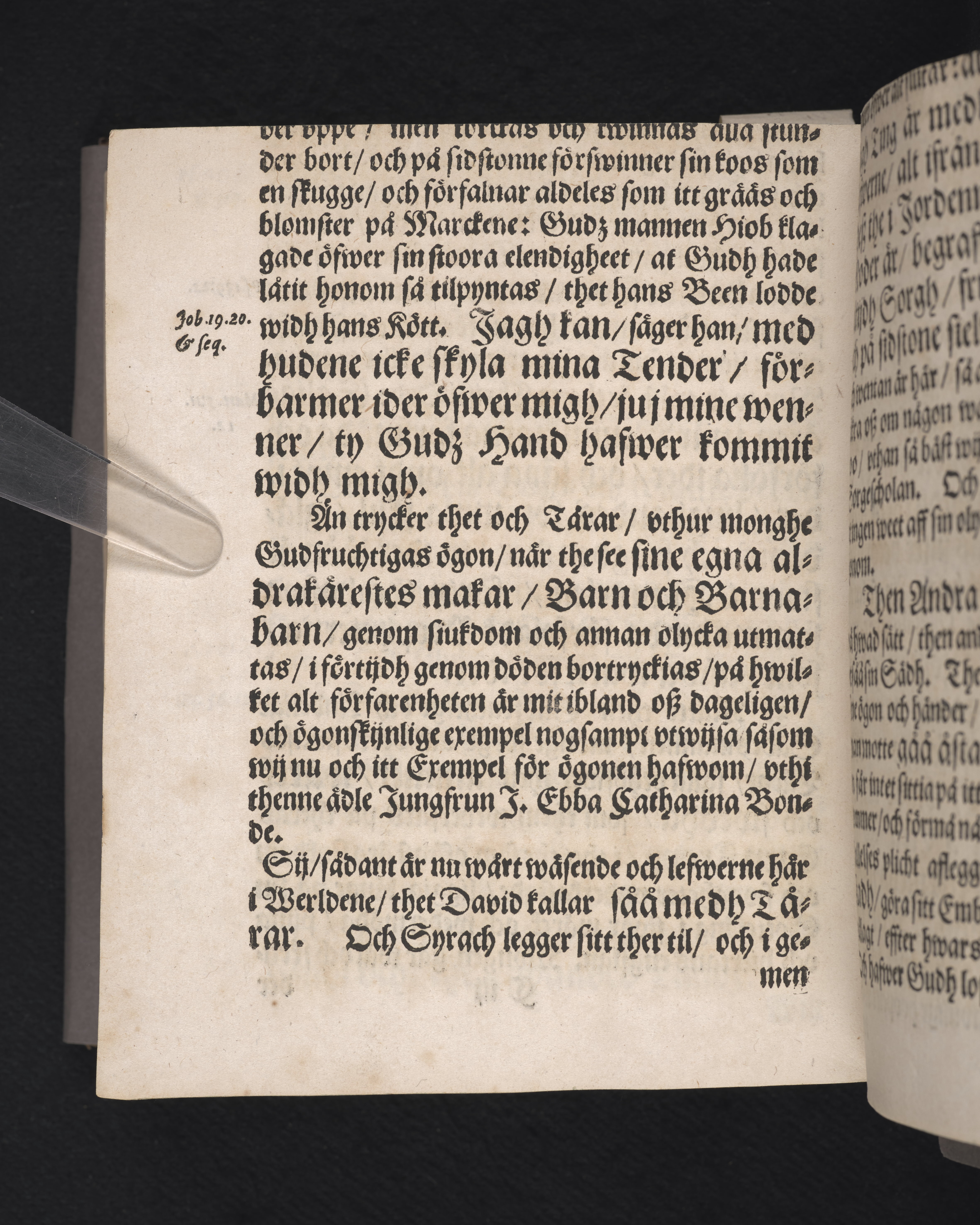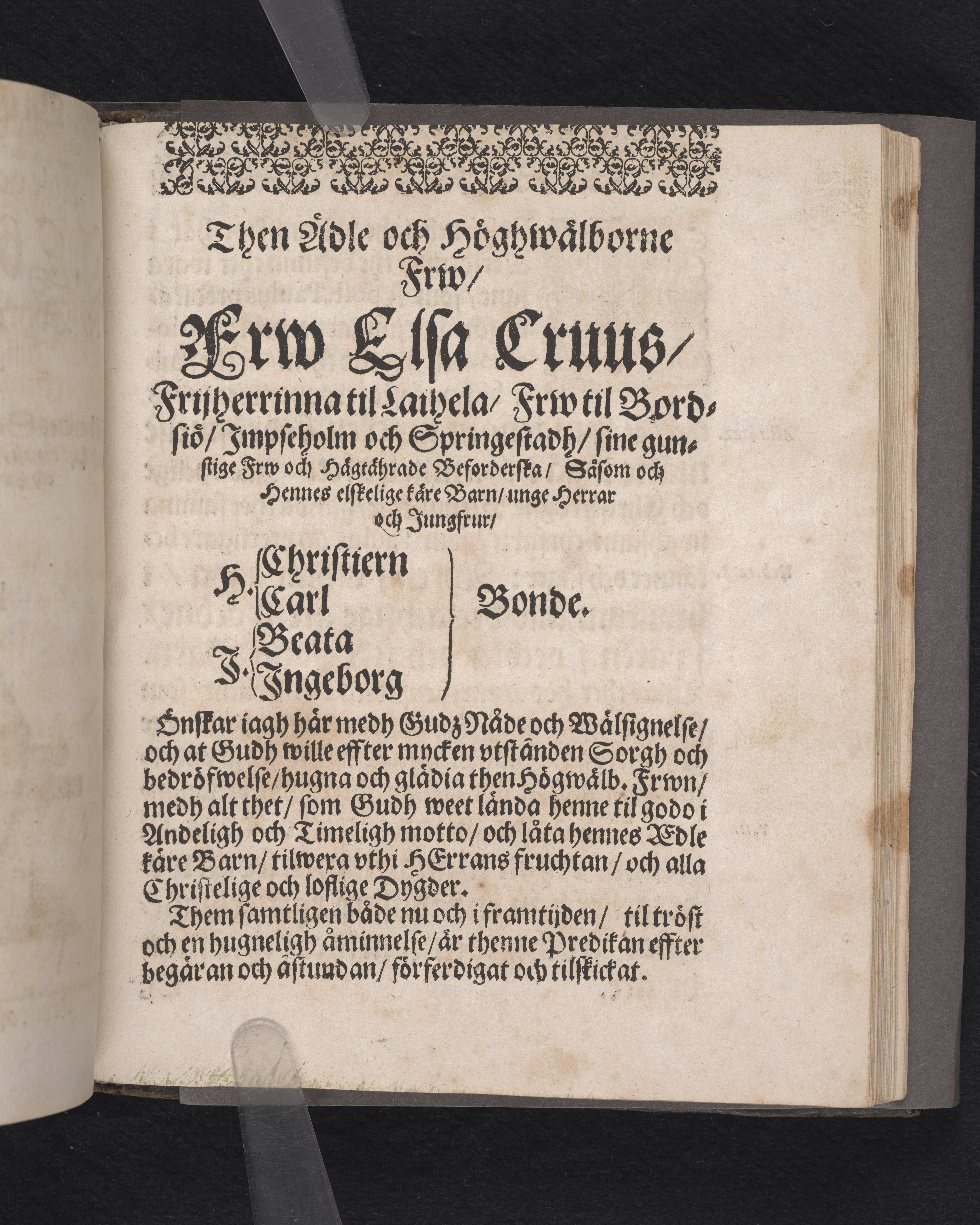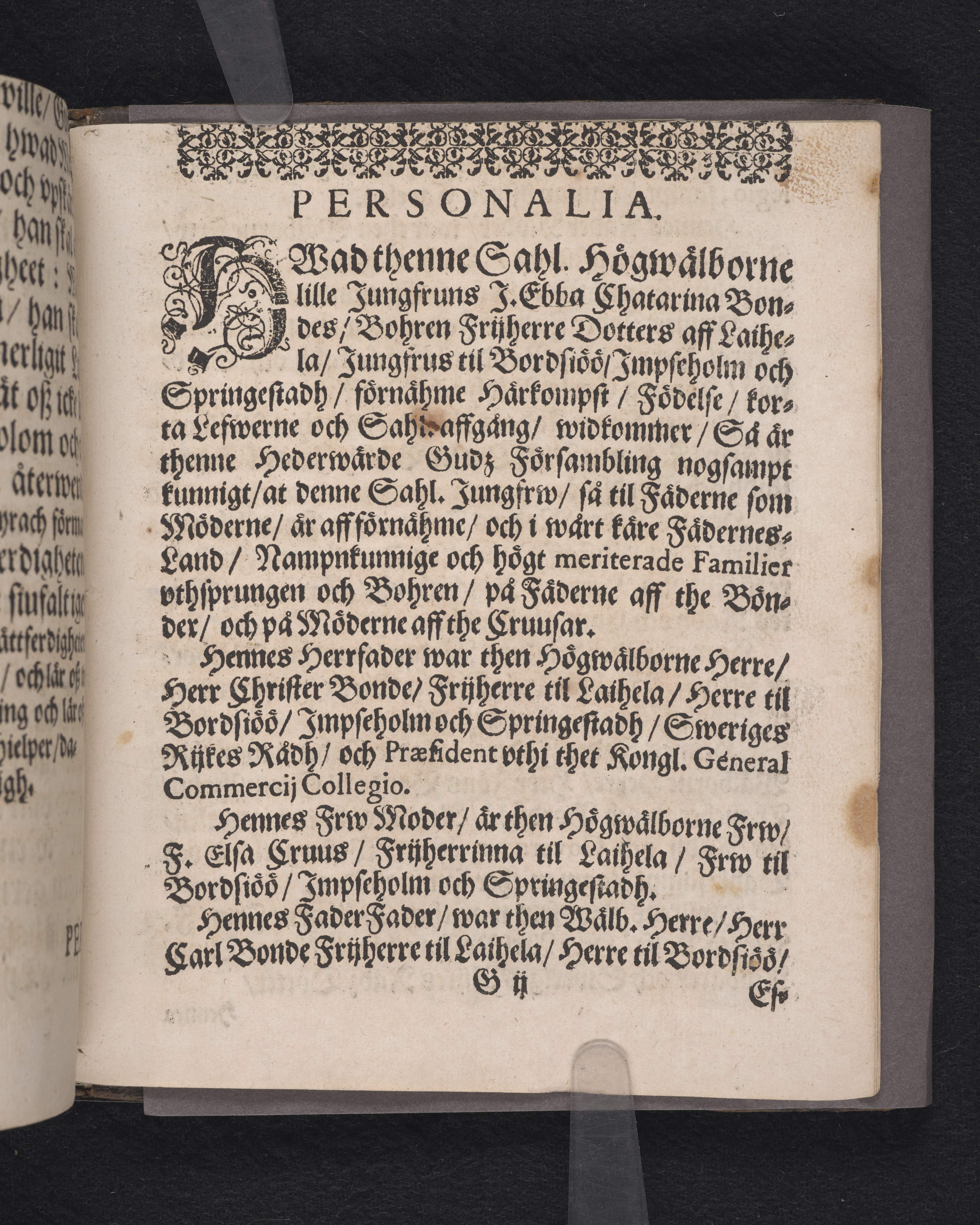 En christeligh lijkpredikan, öfwer then ädle och högwälborne jungfru, J. Ebba Catharina Bonde, bohren friherre dotter til Laihela ... Tå hennes salige lekamen, medh tilbörligh ehre- och lijk process, bleff nedersatt i sin sahl. herrfaders graff och hwijlokammar vthi Kåhrbo sockne kyrckia, 17. Julij 1663. Hållen ther sammastädes aff D. Oluff Laurelio. Biskop i Wästeråås. Stockholm, tryckt af Ignatio Meurer kongl. booktr. Anno 1664.