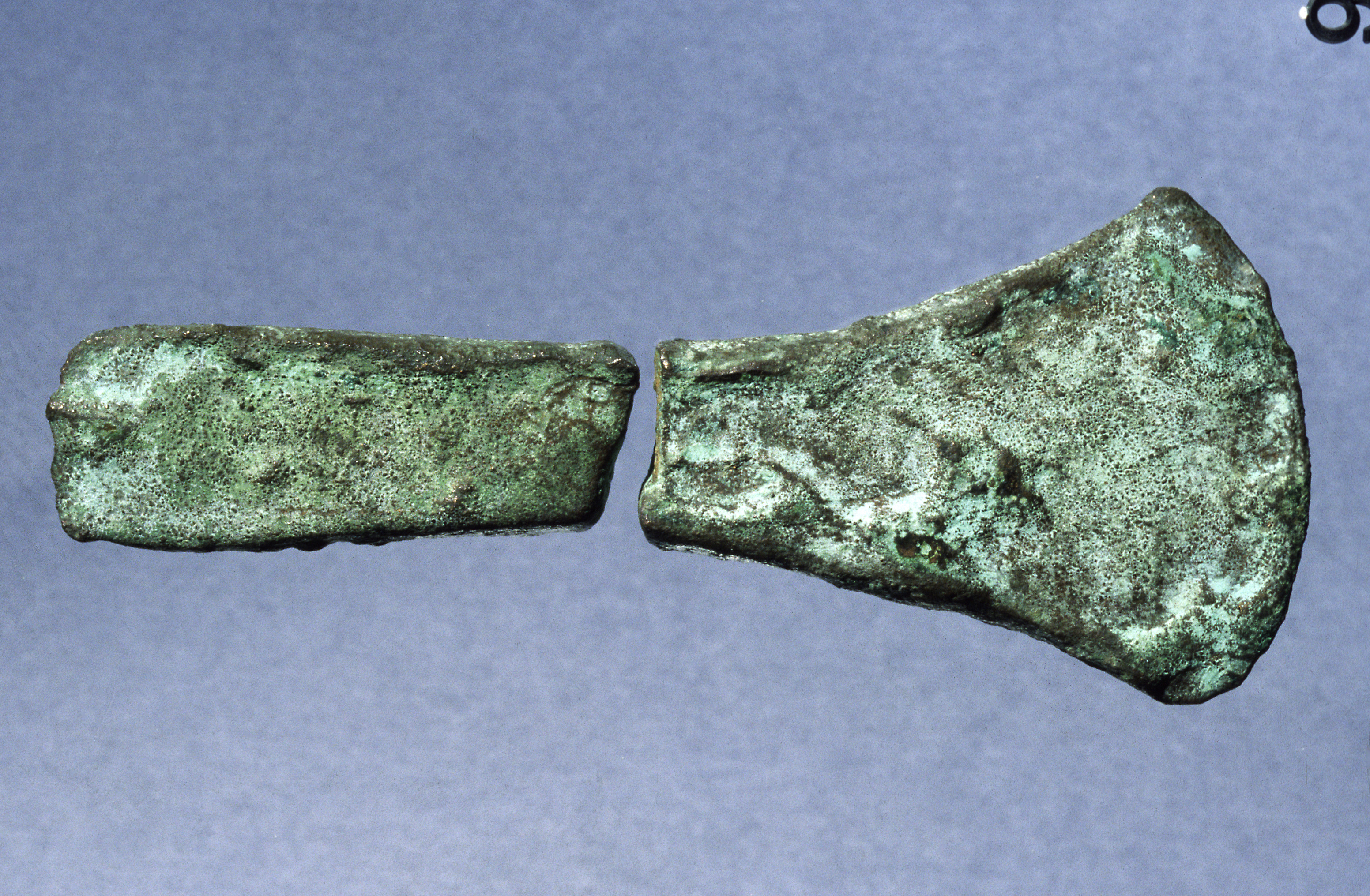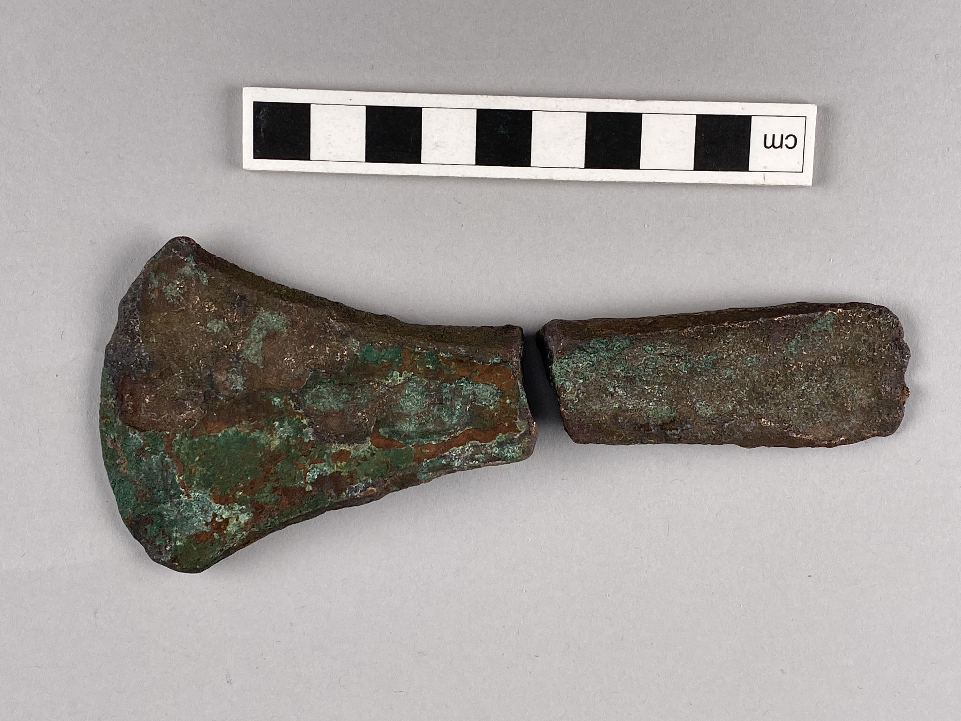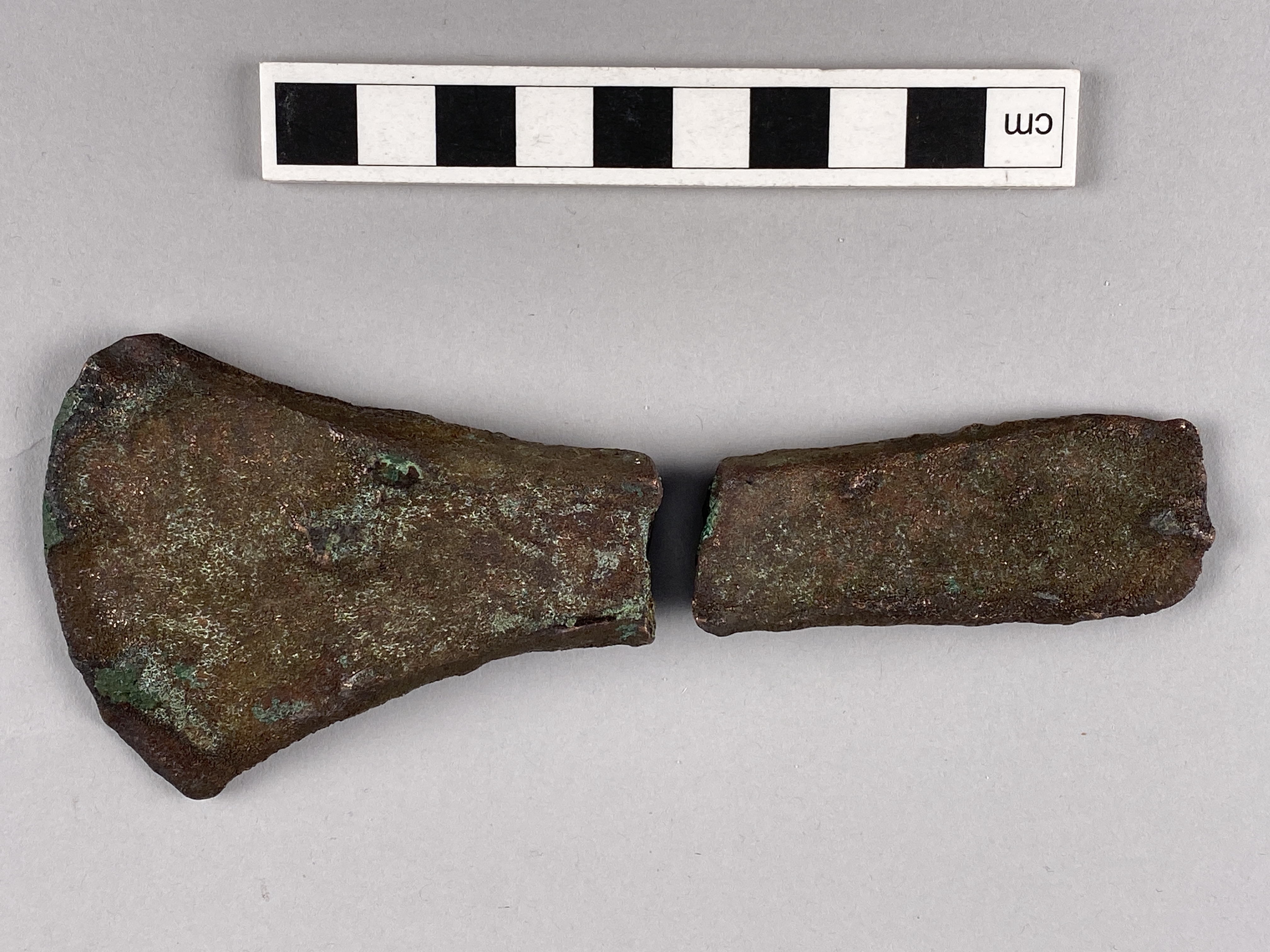Kantyxa av brons i två delar. Yxan har svagt markerade kanter.
