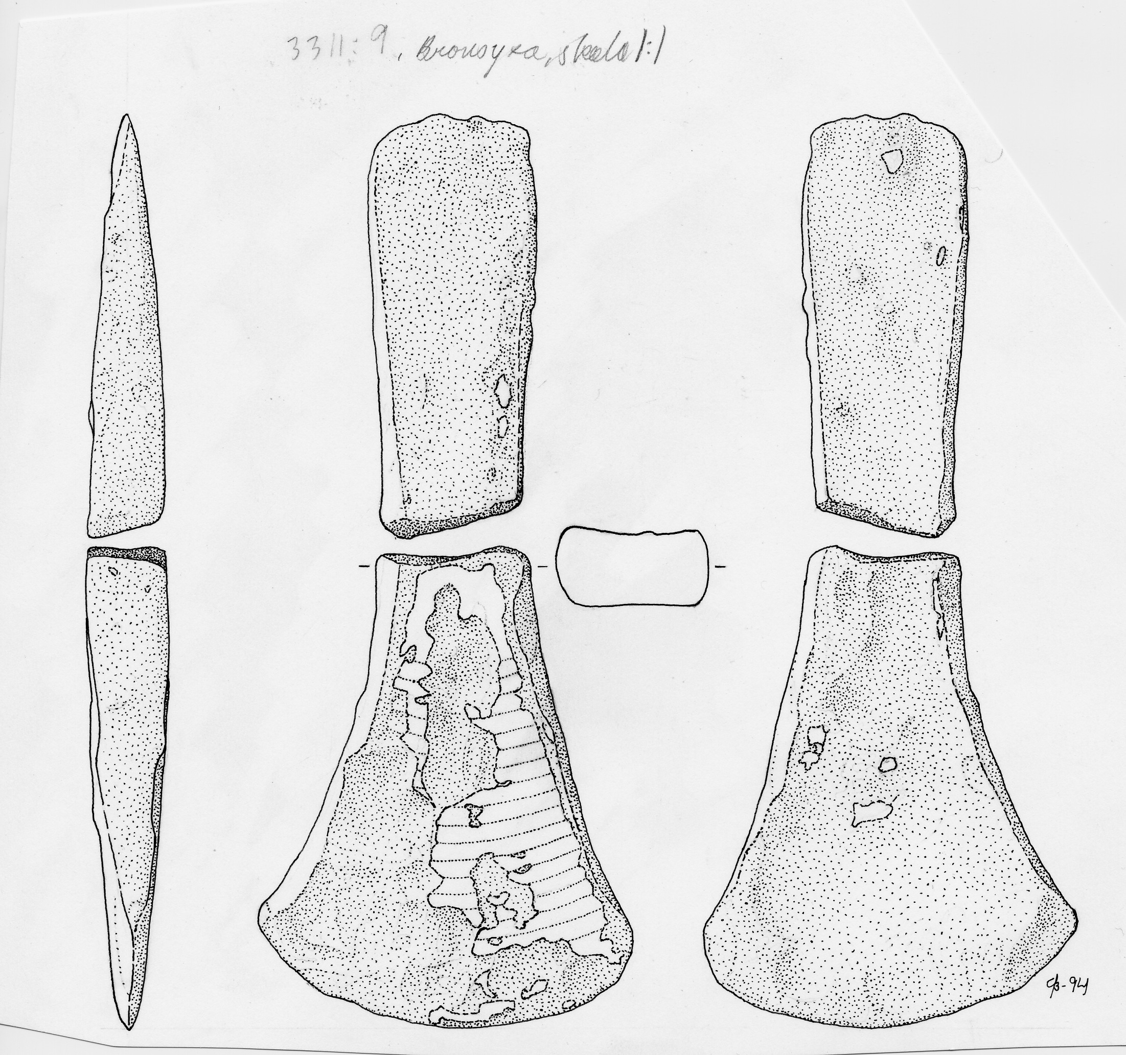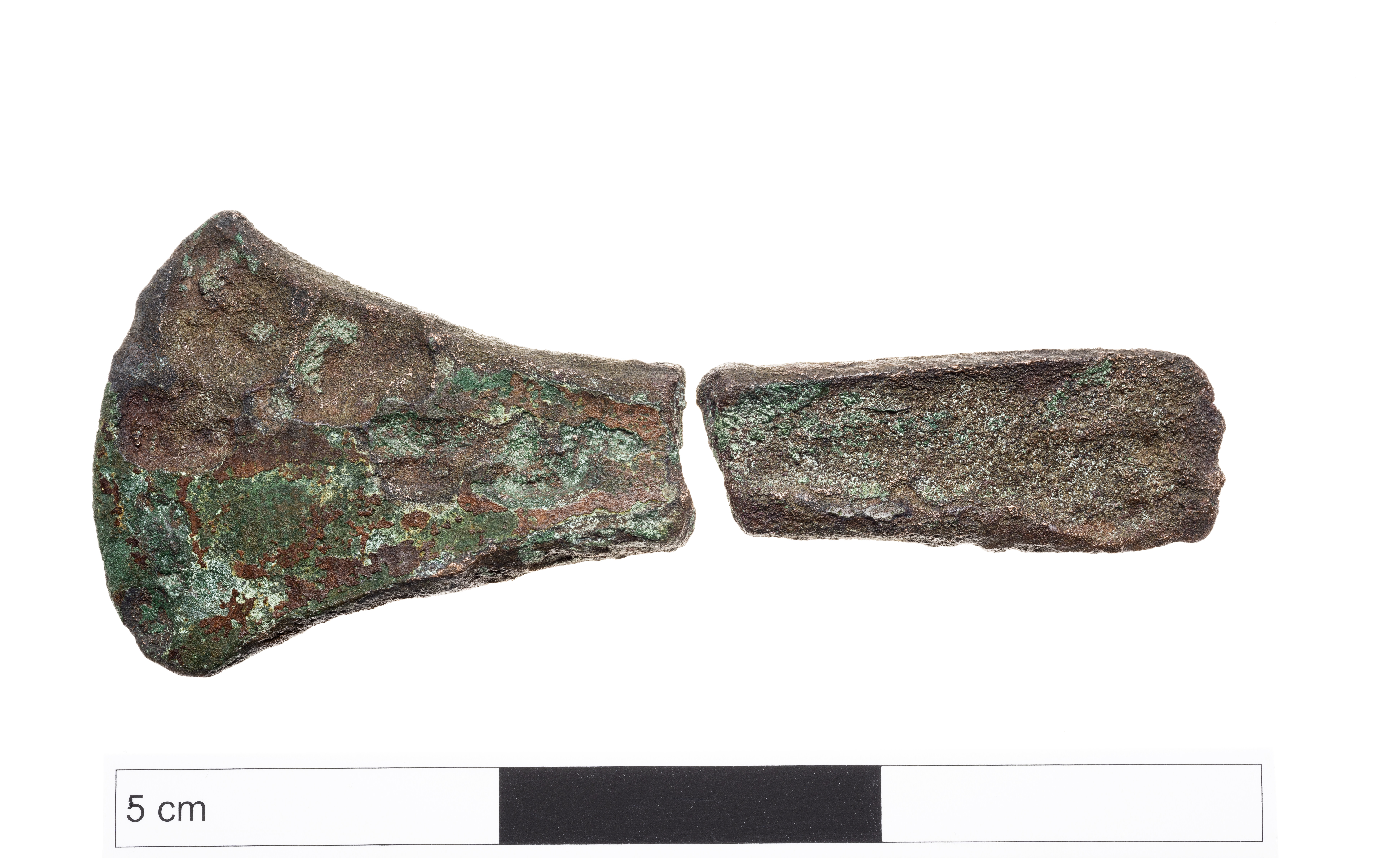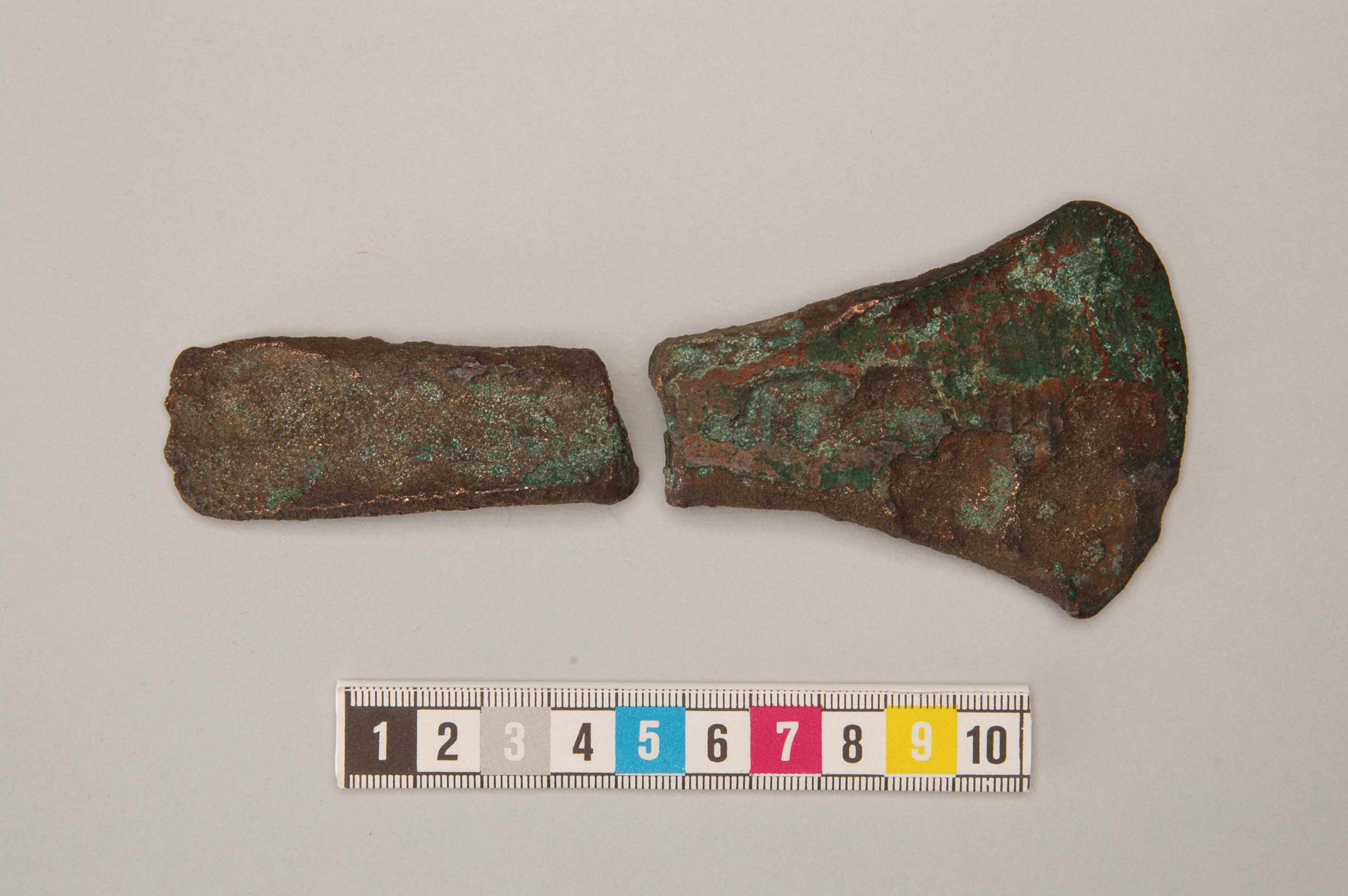 Kantyxa av brons i två delar. Yxan har svagt markerade kanter.