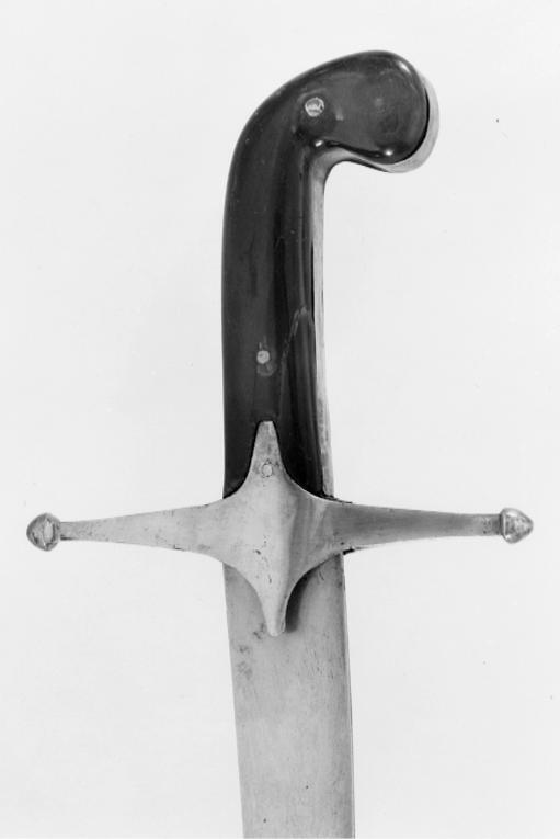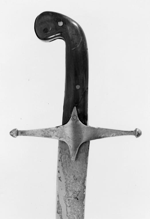 Fäste med framåtböjd överdel klätt med fastnitade plattor av mörkt horn med skena av förtent stål runtom på fram- och baksidan. Raka parerstänger av stål med fyrkantigt tvärsnitt och knoppformiga ändar i ett med styrskenor. Klinga av stål, 33 mm brett, eneggad, böjd, med två hålkälar, en längre och en kortare längs ryggen. På utsidan nära fästet thugra. Märkt med nr 282.