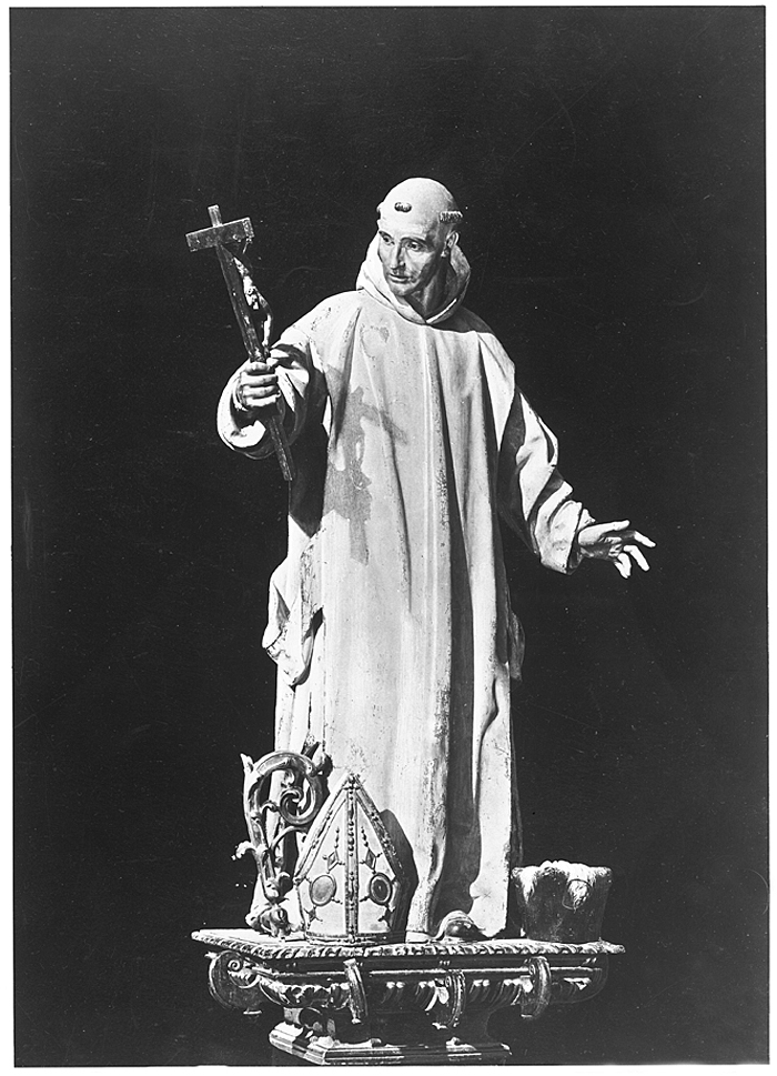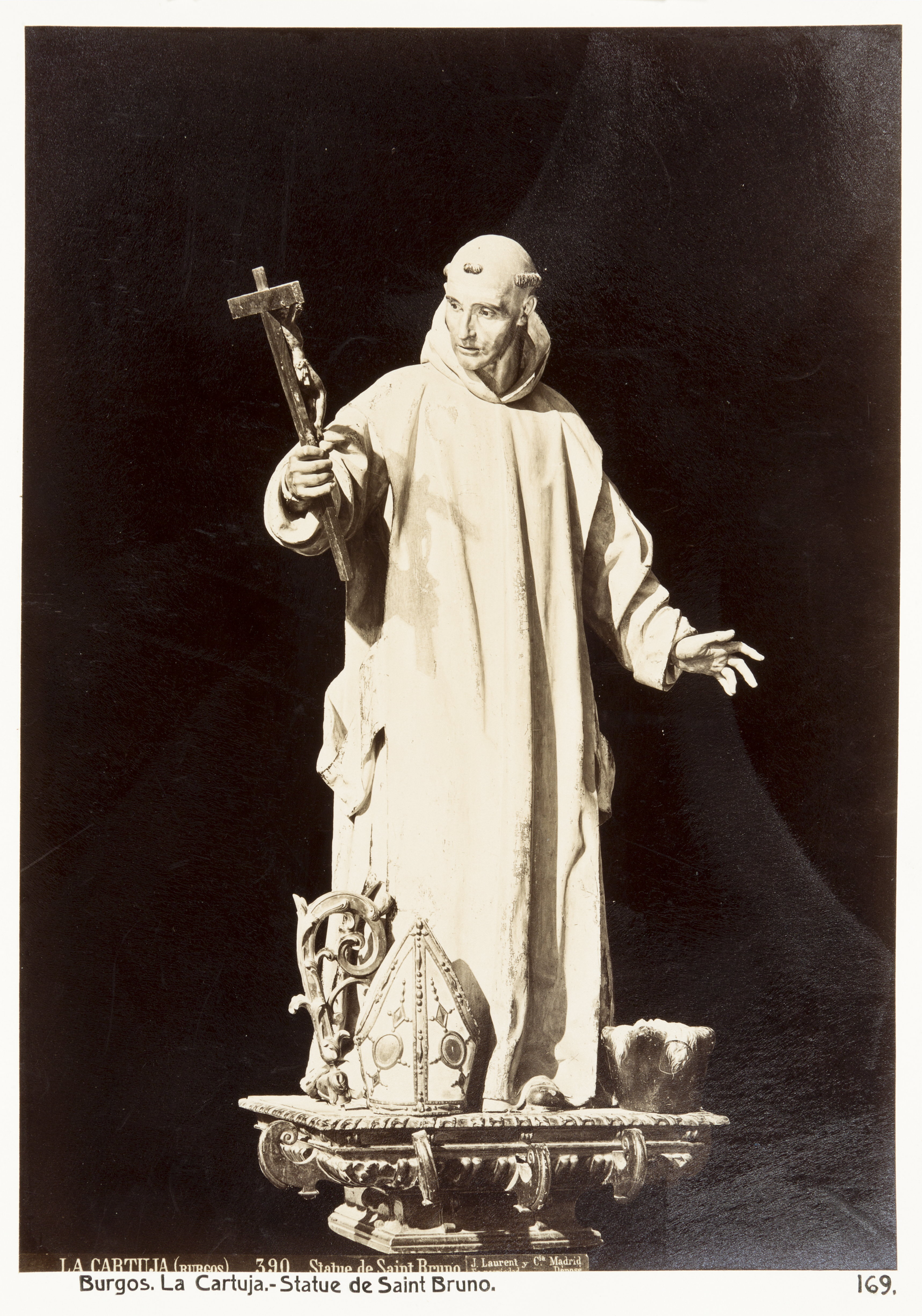 Foto av staty av Sankt Bruno i kartusianklostret La Cartuja, Burgos. Foto från resa genom Spanien, Portugal och Marocko, 18 mars-5 juni 1895. Fotografierna LXVI:J.01.-169. är inköpta av Wilhelmina von Hallwyl, f. Kempe i Barcelona, Tarragona, Valencia, Córdoba, Sevilla, Granada, Málaga, Tanger, Ronda, Madrid, Toledo, Lissabon, Salamanca och Burgos. Med på resan var maken Walther von Hallwyl, modern Johanna Kempe, f. Wallis samt fröken Ida Uhse. Uppgifterna kommer från fröken Ida Uhses reseanteckningar.