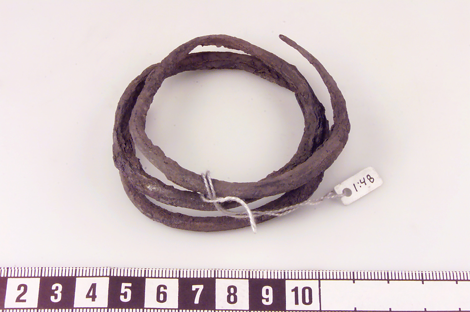 Spirallagd i två och ett halvt varv. Fyrsidig ten. Kraftigt korroderad. Ändarna spetsiga.