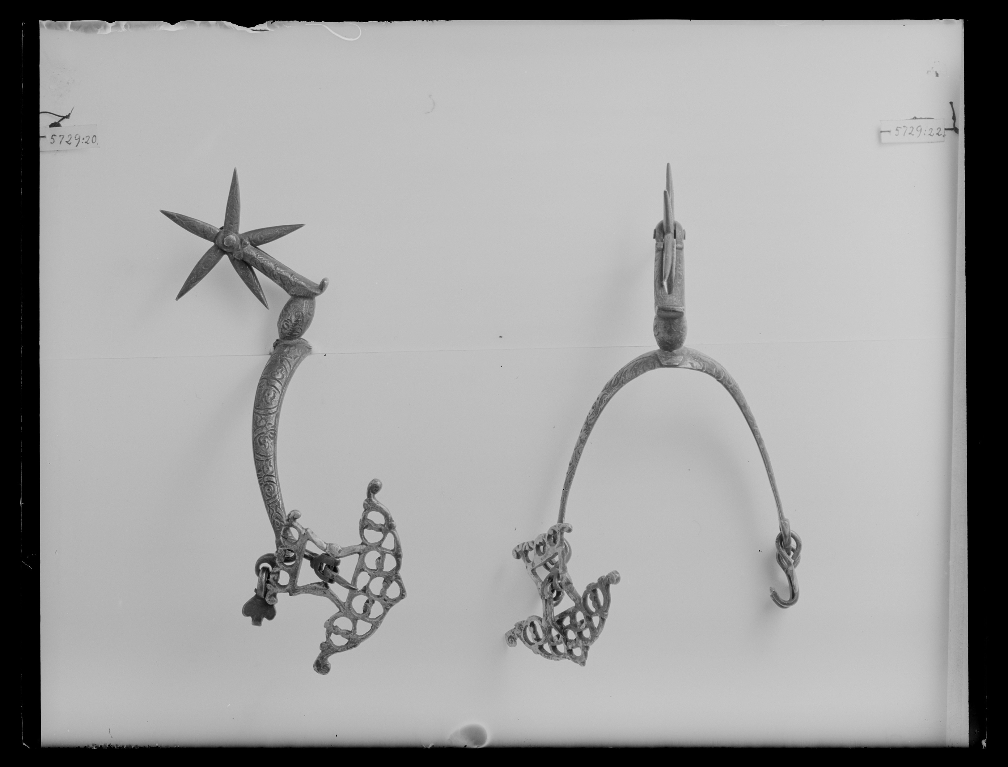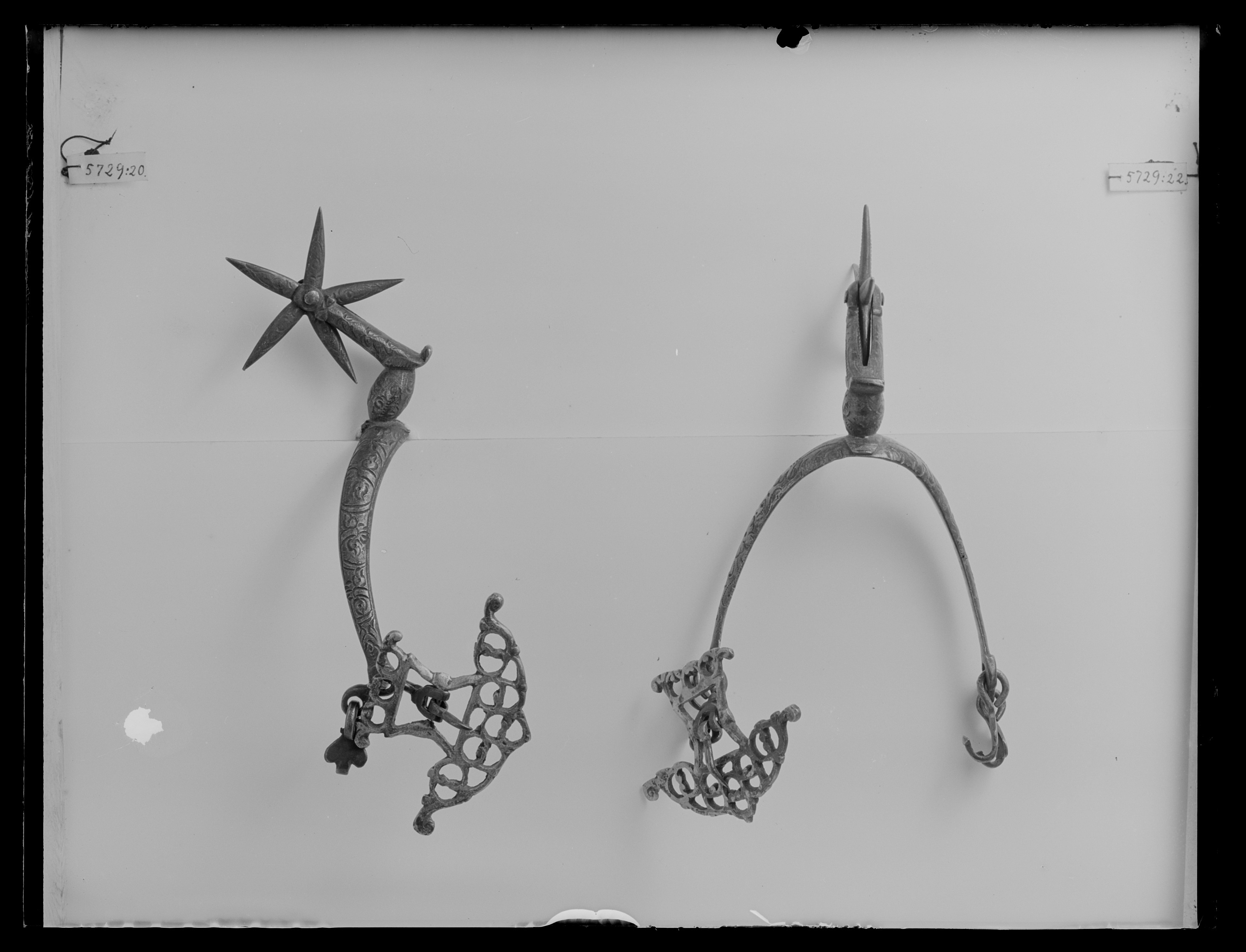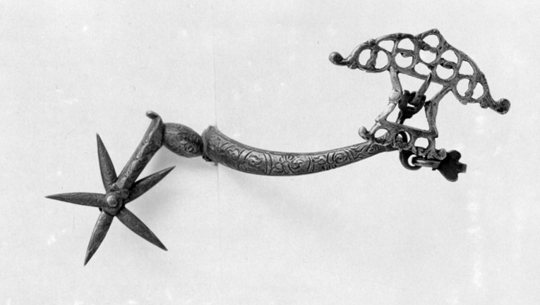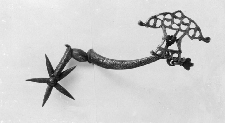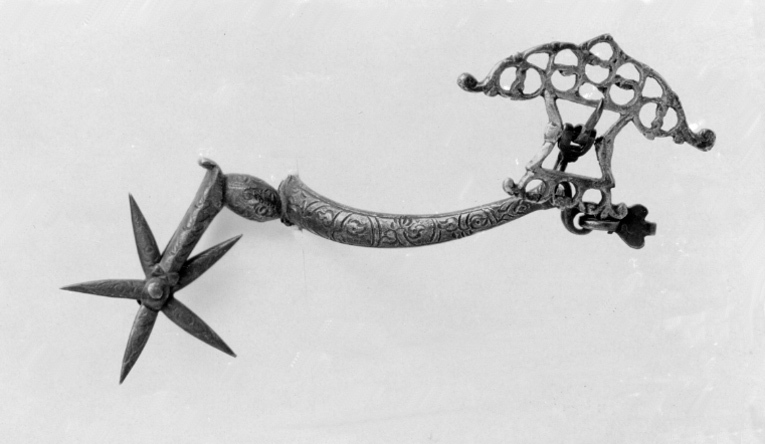 Sporre av stål. U-formade något böjda skänklar med konvex utsida ciselerad med bladornament, smalnande mot ändarna som är nedböjda med två hål. I dessa på ena sidan två hakar på andra sidan i nedre hålet en hake, i övre hålet en stor genombruten sölja av försilvrad mässing, l: 48 mm, b: 72 mm. Hals, böjd i vinkel med oval halsfot, ciselerade bladornament. Femuddig, ciselerad klinga.