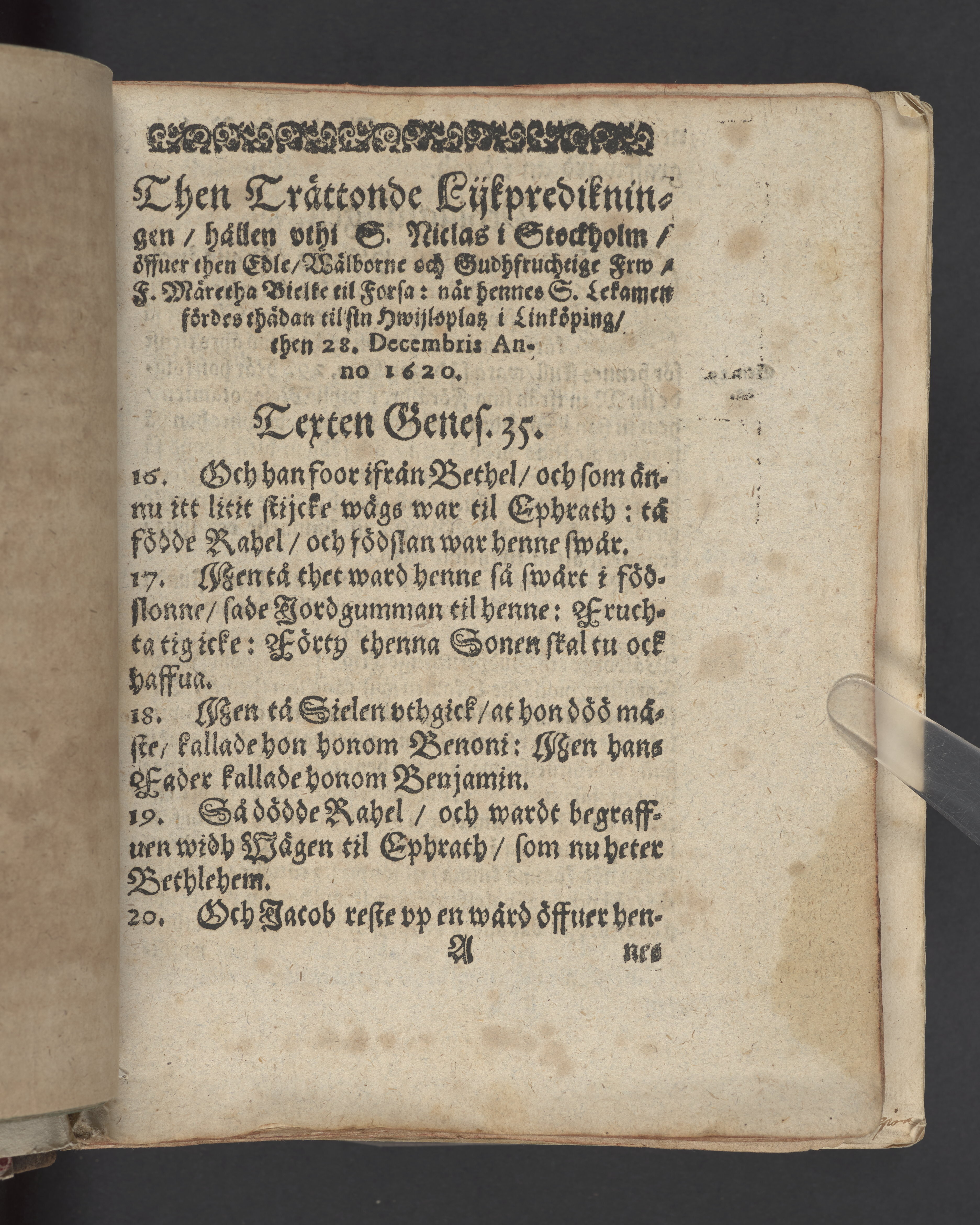 Then trättonde lijkpredikningen, hållen vthi S. Niclas i Stockholm, öffuer ... frw, f. Märetha Bielke til Forsa ... i Linköping, then 28. decembris anno 1620.