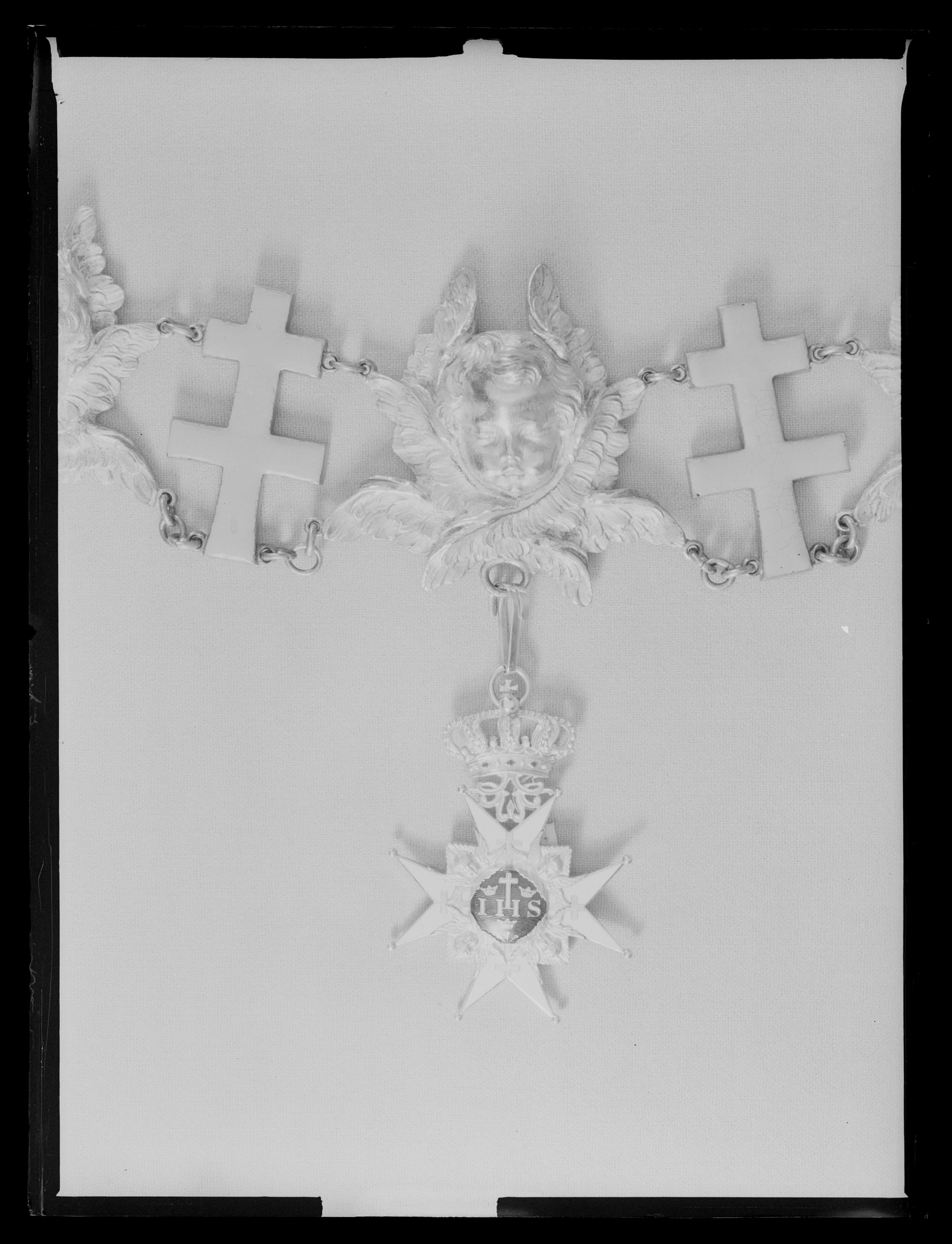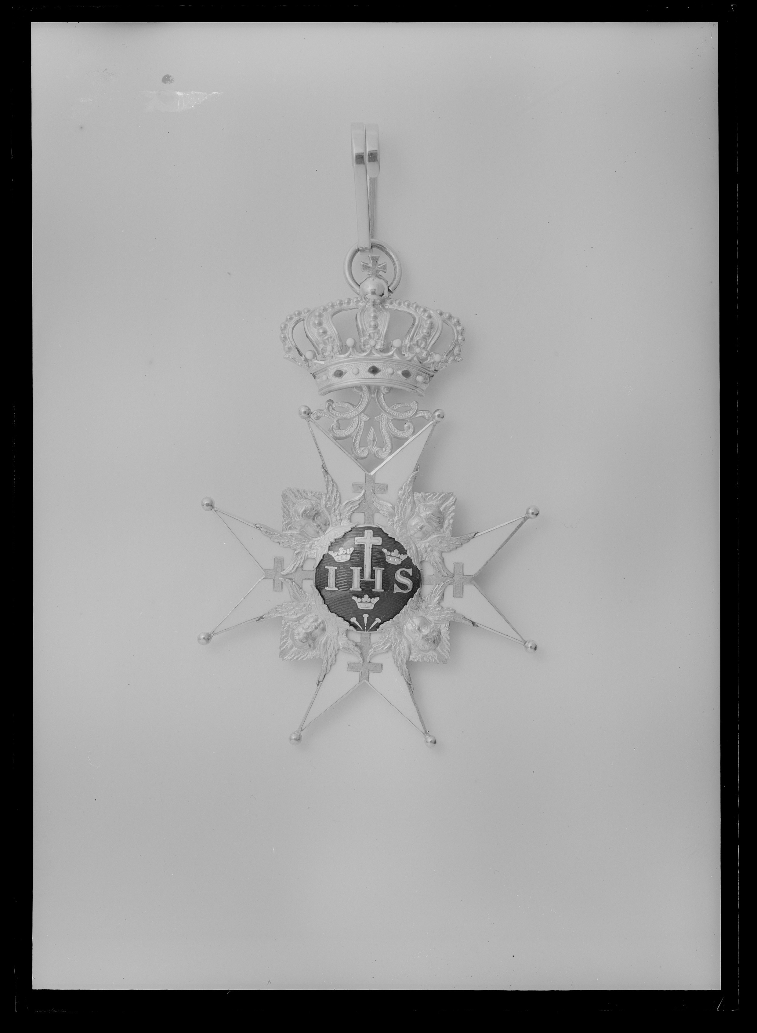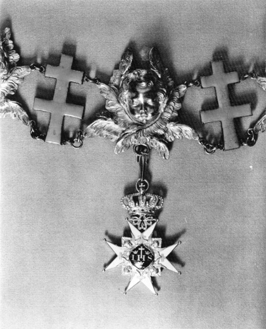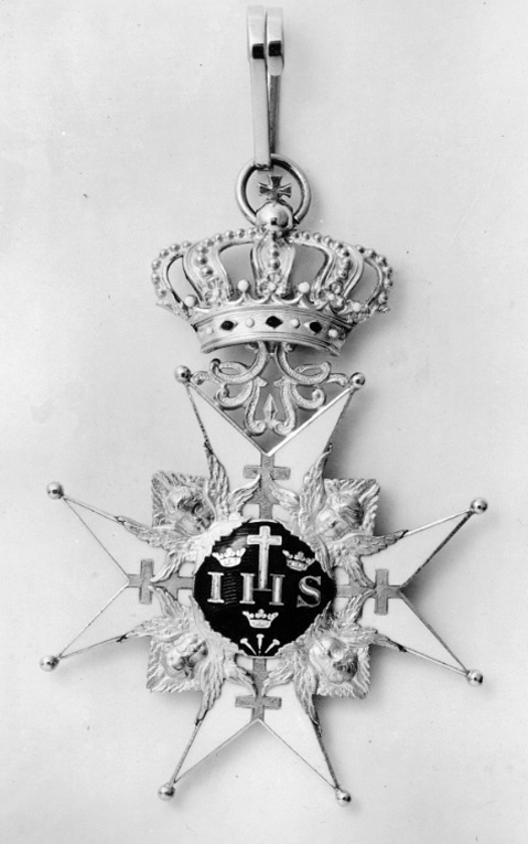 Vitemaljerat malteserkors av guld, kulor på spetsarna, på korsarmarna patriarkkors av guld. Välvd medaljong täckt med blå emalj, däri IHS samt kors av vit emalj, tre kronor och tre spikar av guld. Frånsidans medaljong välvd och täckt med blå emalj, däri i guld F R S. Mellan den övre korsarmens spetsar ett genombrutet rankverk av guld, däri fäst med scharner en kunglig krona av guld samt vit, röd och grön emalj, igenom äpplet draget en ring.
