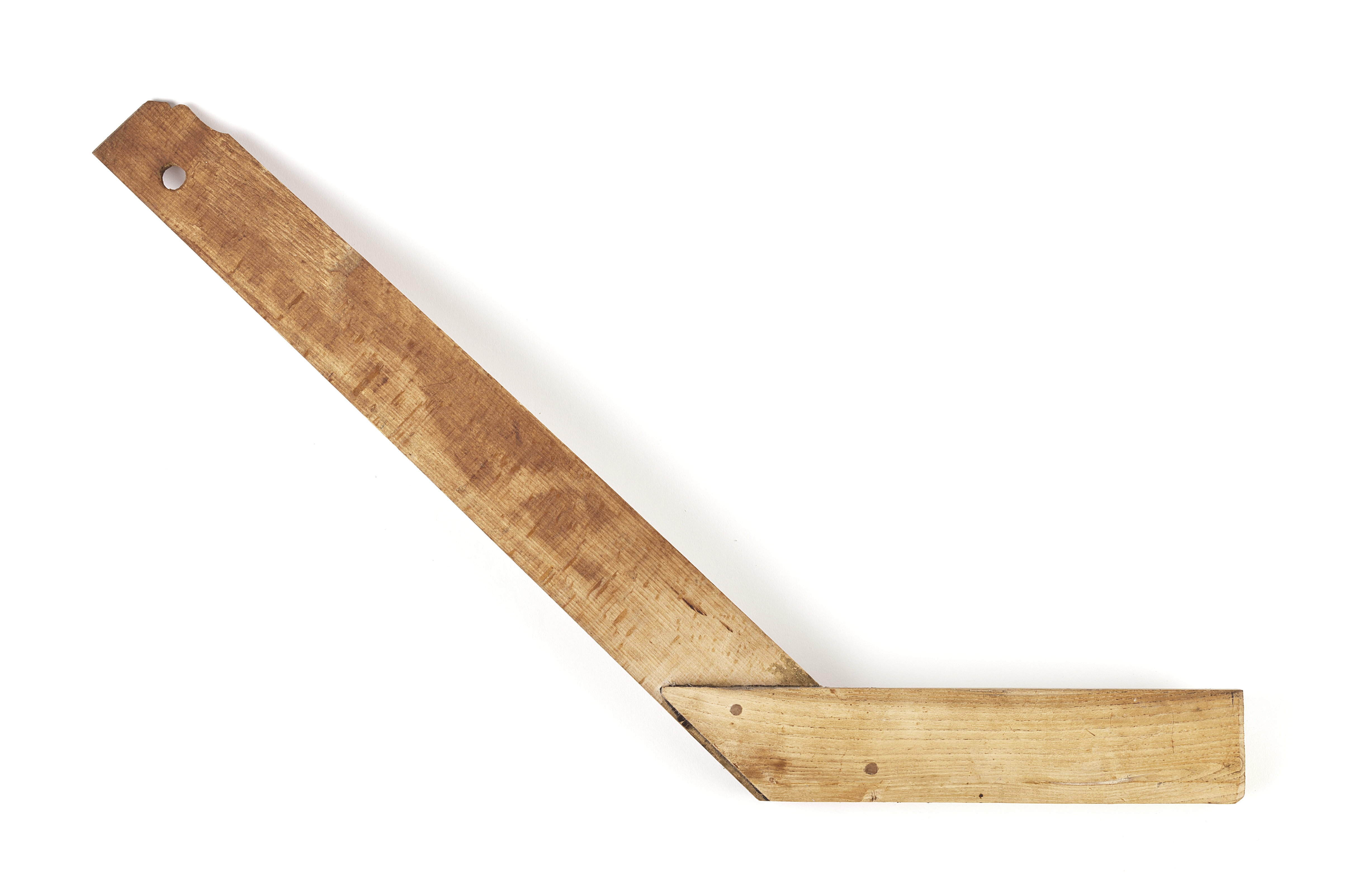Med vinkel av lönn(?) och kloss av alm. Vinkeln lätt profilerad i änden. Klossens längd 340 mm.