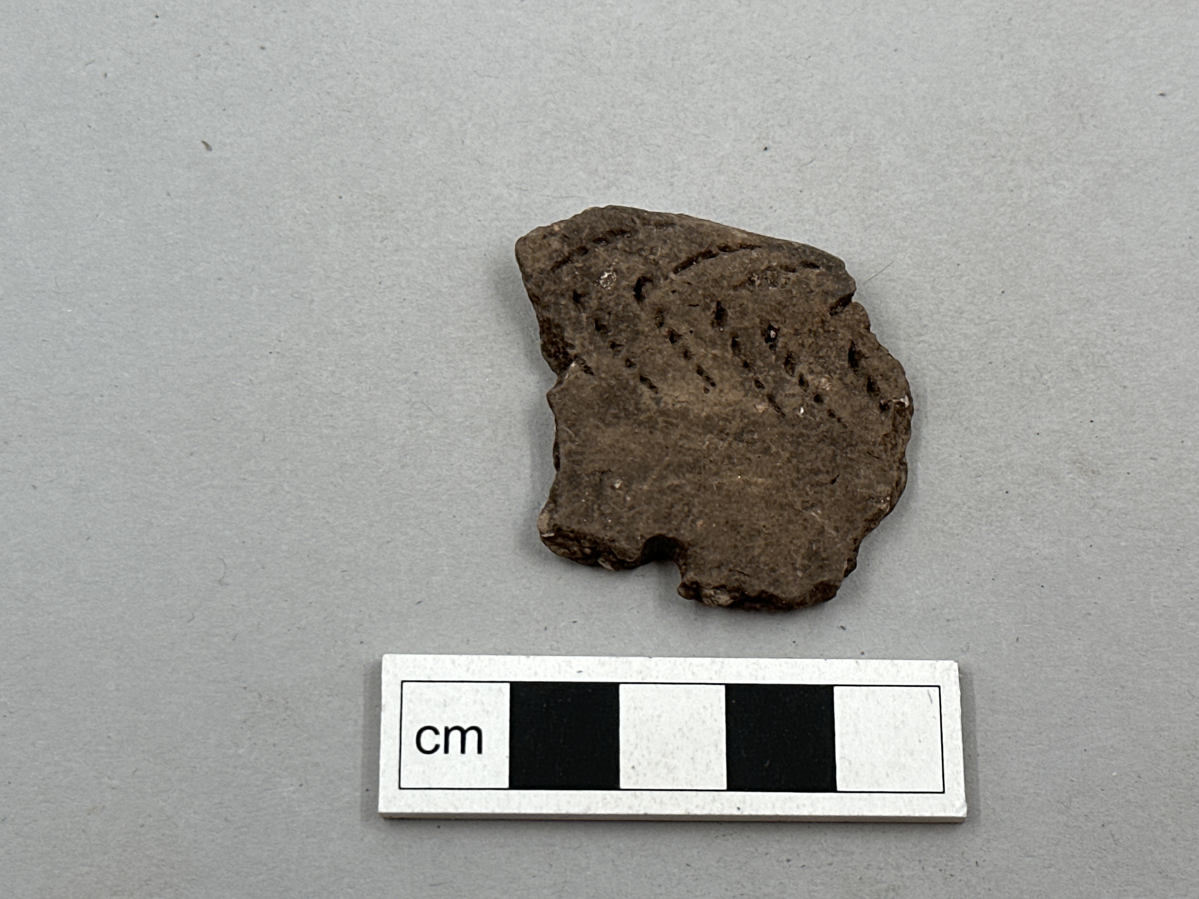 Gättad fastgods fragment med snedställd kamstämpel dekor vid skuldran samt gropdekor under skuldran.