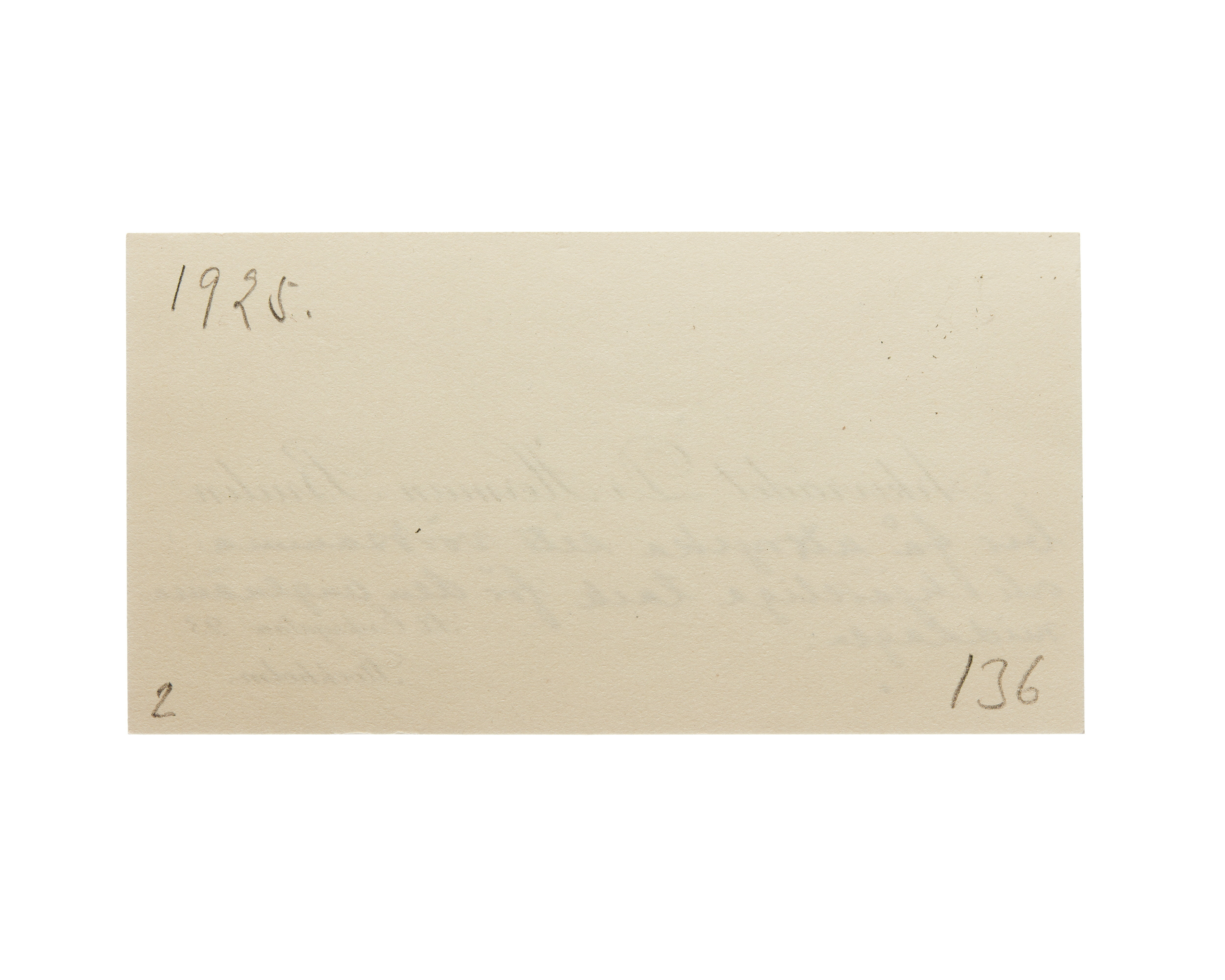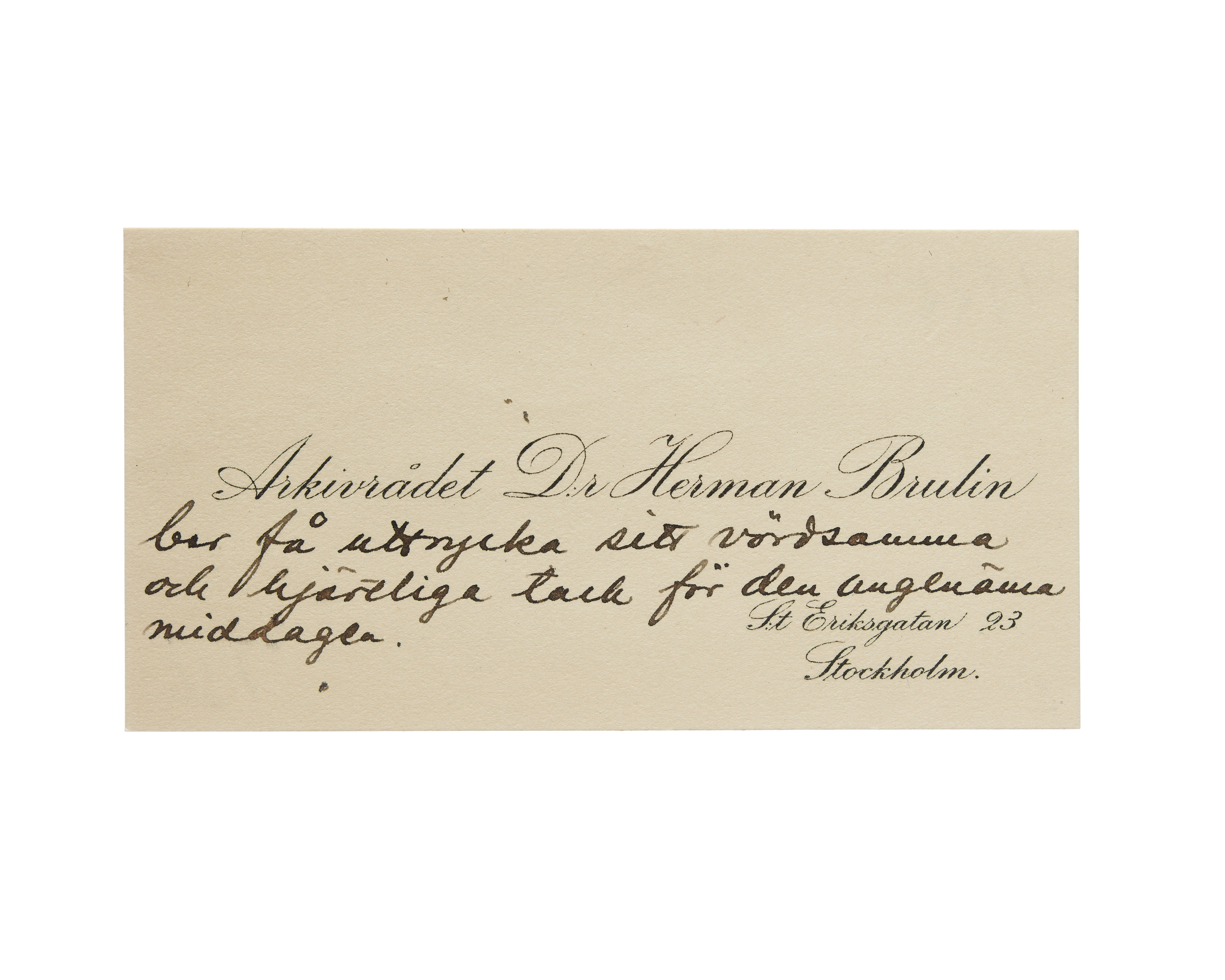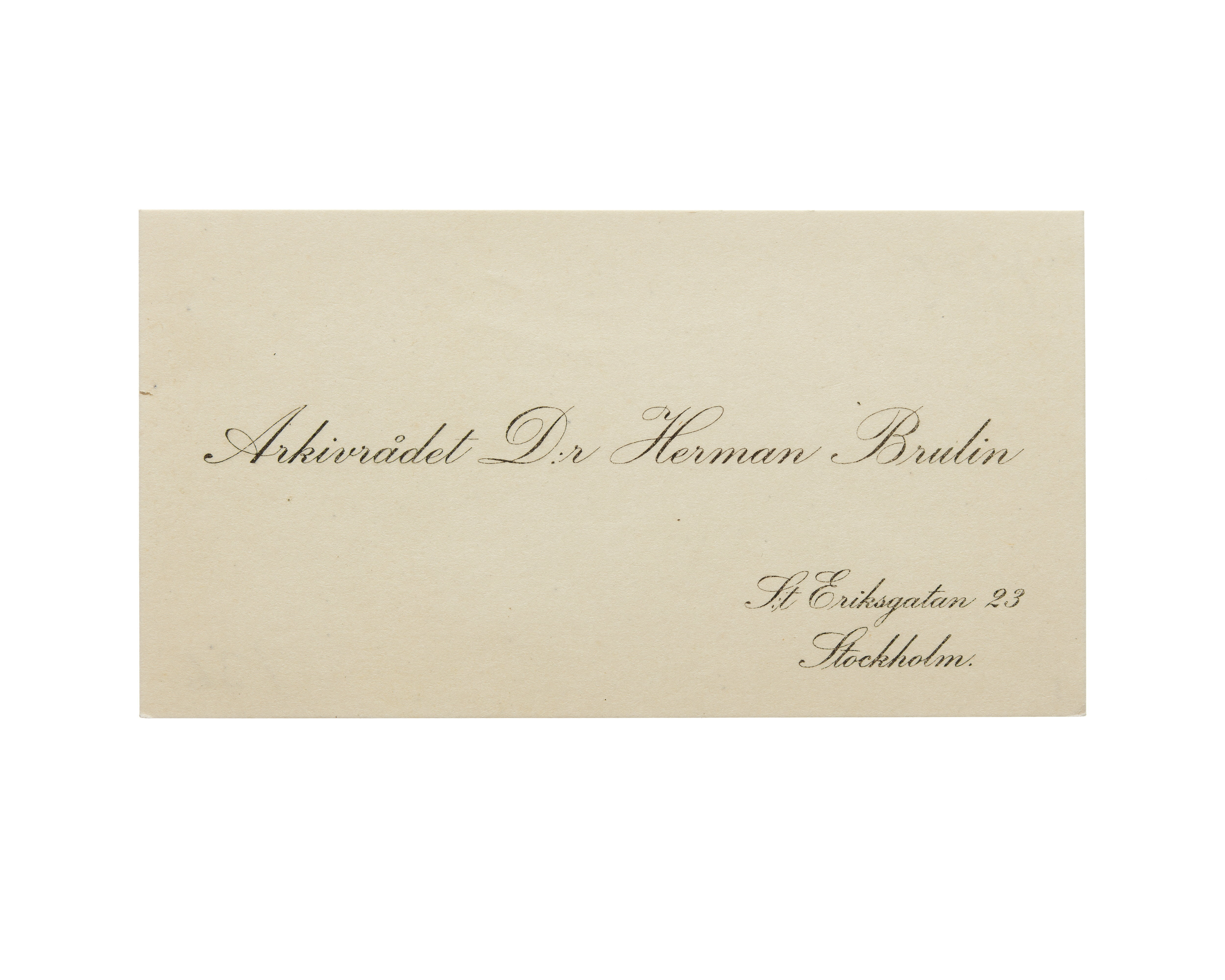 Två visitkort från Fil.dr Arkivrådet Herman Brulin. Första kortet daterat 1925, adress (nedre högra hörnet) S:t Eriksgatan 23, Stockholm. Handskrift (nedanför namnet) "Ber att få uttrycka sitt vördsamma och hjärtliga tack för den angenäma middagen". Andra kortet daterat 1925, adress (nedre högra hörnet) S:t Eriksgatan 23, Stockholm.