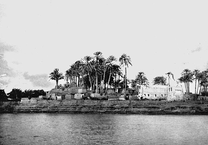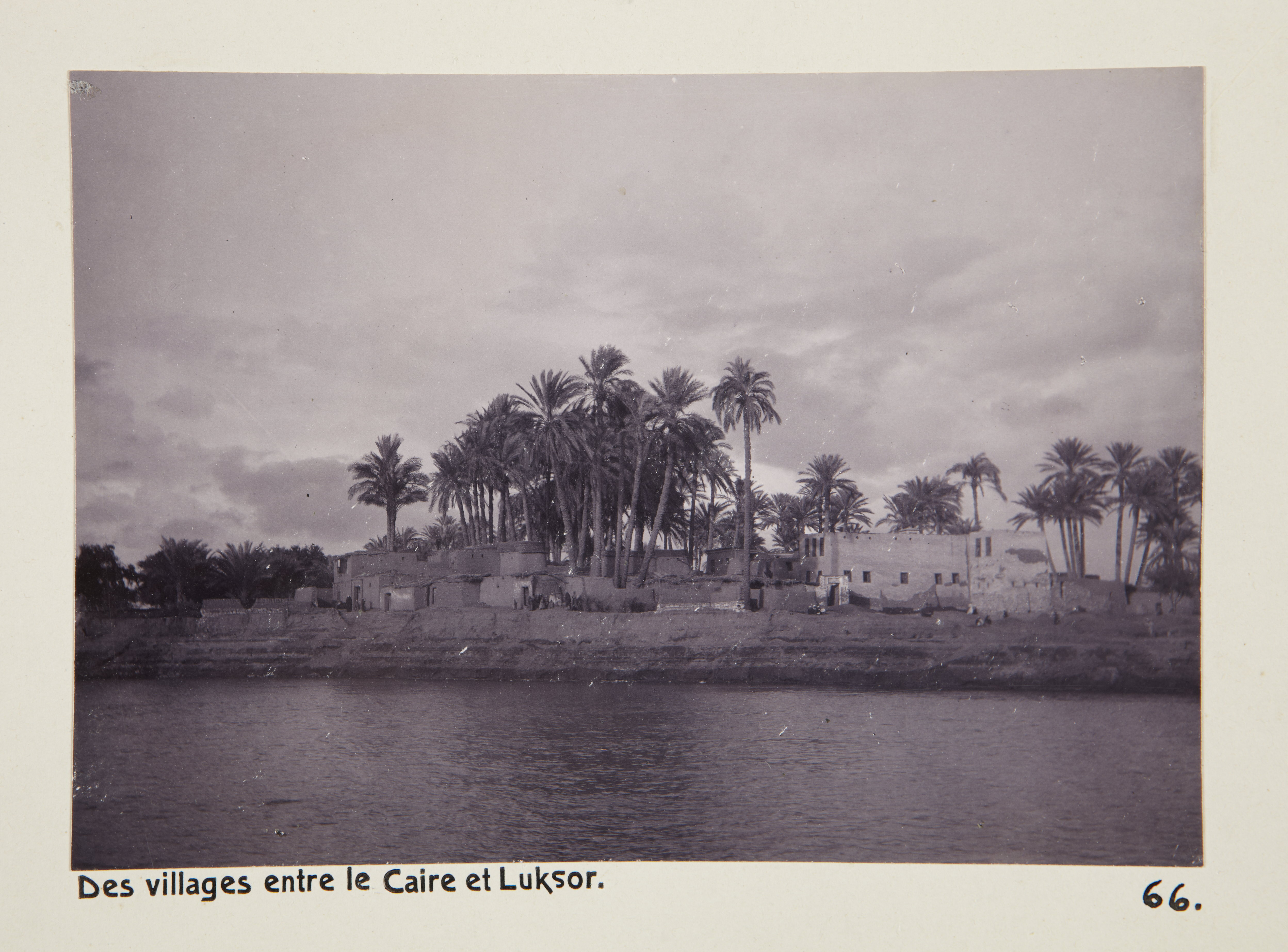 Byar mellan Kairo och Luxor, Egypten. Text på fotografiet: Des villages entre le Caire et Luksor. Fotografierna LXVI:M.01.- 201. kommer från resan till Egypten och Sudan som Wilhelmina och Walther von Hallwyl gjorde vintern 1900-1901. De lämnade Sverige den 5 november 1900 och fortsatte från Egypten till Palestina den 28 mars 1901. Med på resan var döttrarna Ellen med maken Henric de Maré och Irma med maken Wilhelm von Geijer. Wilhelminas sällskapsdam, fröken Ida Uhse reste också med. Under en del av resan anslöt sig ledamoten av Internationella domstolen i Kairo, assessorn Otto Conrad Waldemar Cedercrantz med makan Anna Elisabeth. Vid resan uppför Nilen hade Walther von Hallwyl hyrt ångfartyget Columbia med besättning. Båtresan startade i Kairo 27 december 1900, gick ända till Wadi Halfa varifrån man reste vidare med tåg till Khartum och tillbaka till Wadi Halfa. Båten vände åter i riktning mot Kairo, men det verkar som att sällskapet tog tåg sista biten, från Luxor. Henric och Ellen de Maré samt fru Cedercrantz lämnade båten redan då de passerade Luxor första gången. Resten av sällskapet återvände till Kairo den 1 mars. Fotografierna LXVI:M.01.-120. togs av resenärerna själva, de största av Ellen de Maré, de mellersta av Wilhelmina von Hallwyl och de minsta av Wilhelm von Geijer. Resten köptes av professionella fotografer i Kairo, de flesta från Studio Photogr. Artistique G. Lekegian & Cie. Alla uppgifter kommer från Ida Uhses reseanteckningar.