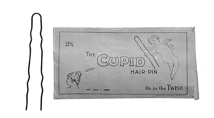 HÅRNÅLAR, 12 st i kuvert Av svartlackerad rundstavig järntråd, vågiga ett stycke från båda ändarna. Längd: 7 cm K u v e r t (original): Av gulvitt papper. Rektangulärt, På kuvertet i brunt figurer samt text på engelska. Längd: 10,2 cm; bredd: 5,2 cm Inköpta av Wilhelmina von Hallwyl i början av 1900-talet. Dylika hårnålar framlades i Stora kapprummet vid större fester till användning för gästerna.