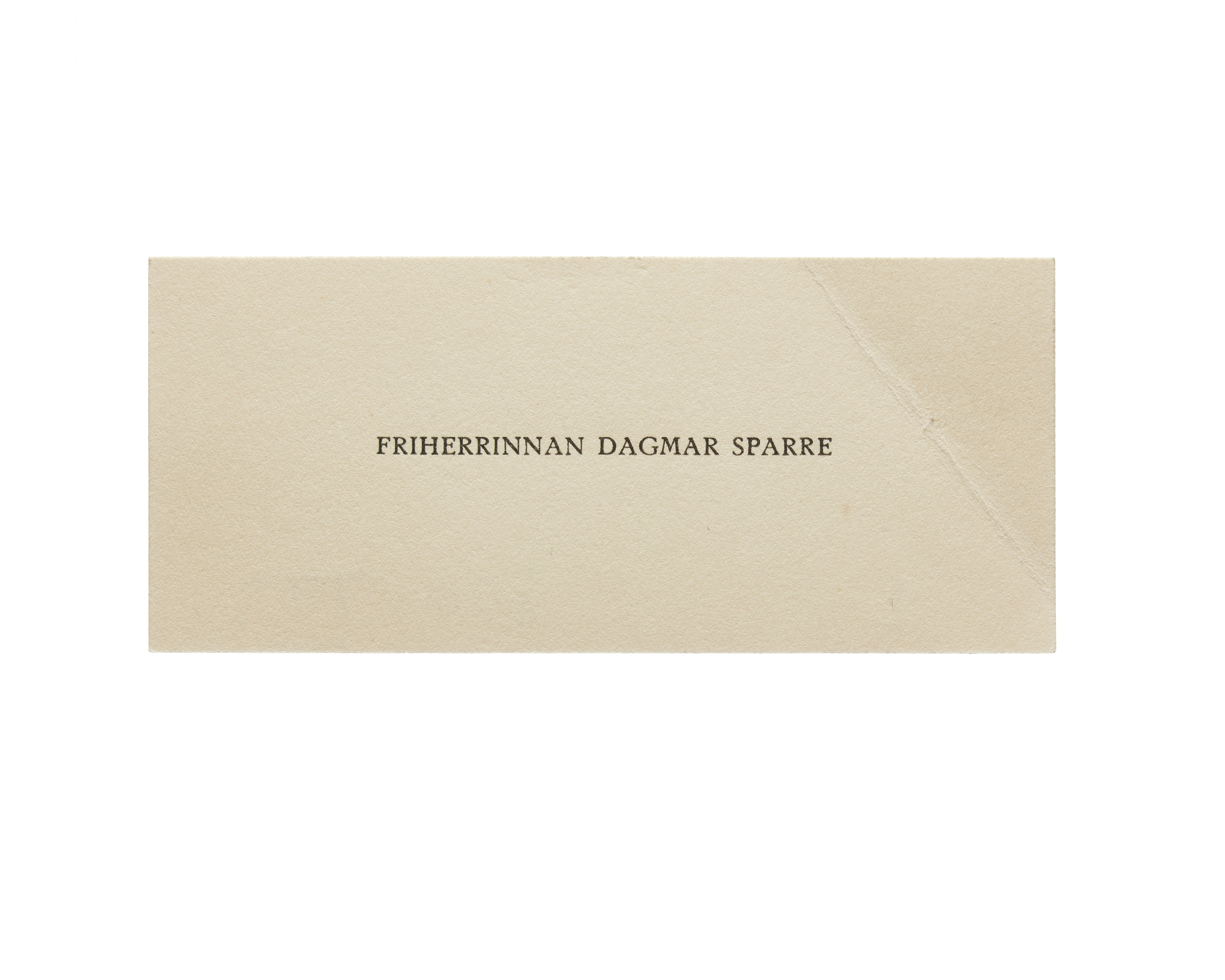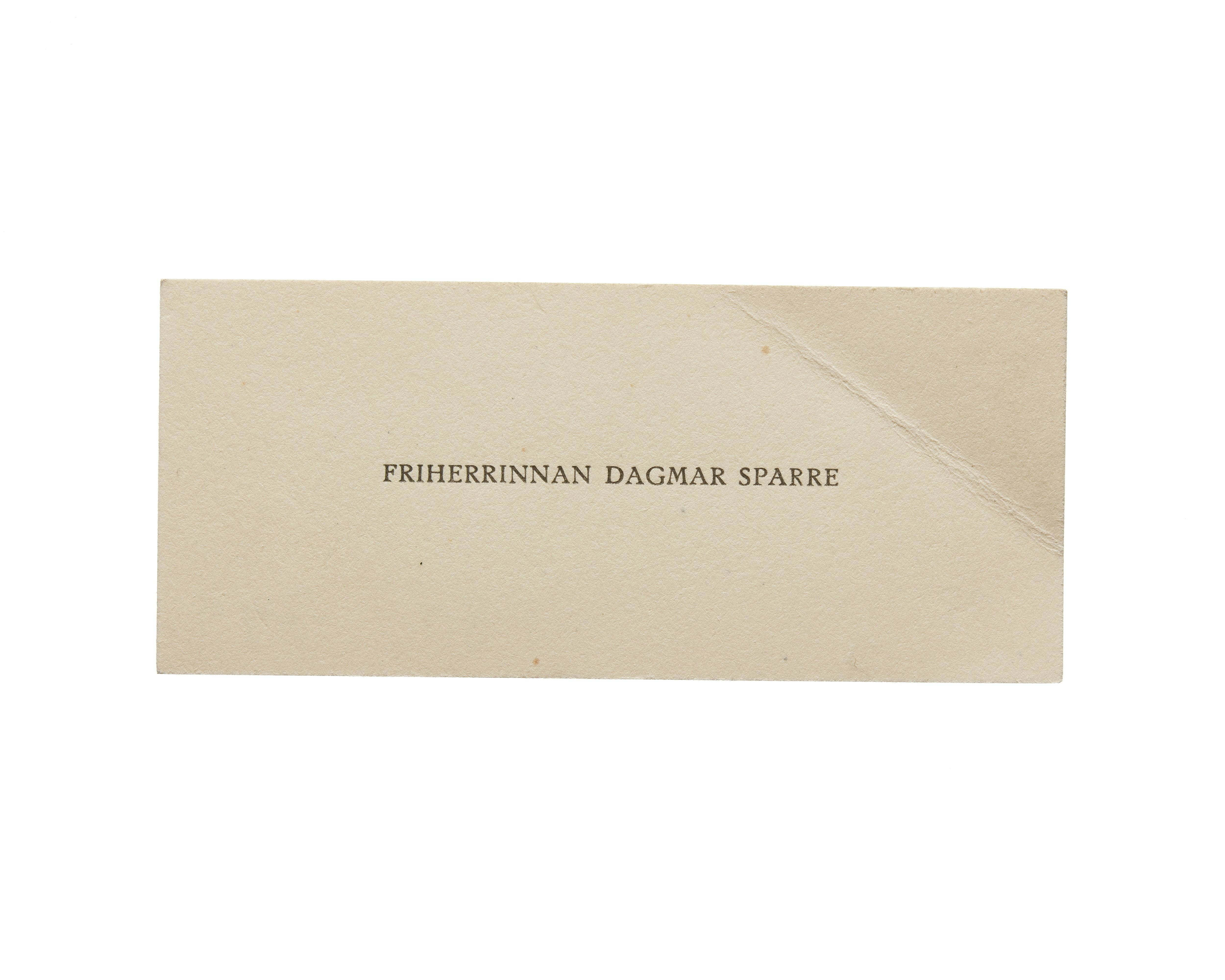 Fyra visitkort från Friherrinnan Dagmar Sparre. Första kortet daterat 1921, vikt i övre högra hörnet. Andra kortet daterat 1927, vikt i övre högra hörnet. Tredje kortet daterat 1930, vikt i övre högra hörnet. Fjärde kortet är utan datum, vikt i övre högra hörnet.