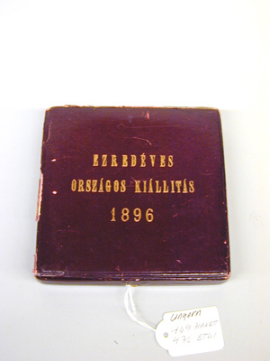 Kvadratiskt etui av papp, utvändigt klätt med röd skinnimitation, på undersidan grönsvart mönsterpressat papper. På locket i guldtryck: "EZREDEVES ORSZAGOS KIALLITAS 1896" (nationella tusenårsutställningen 1896). Locket invändigt klätt med vitt siden, underdelen klädd med gulgrön sammet, urtag för plaketten. Fjäderlås och två gångjärn av mässing.
