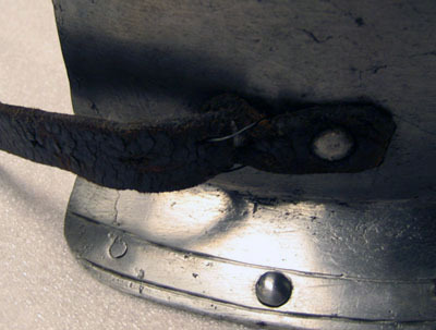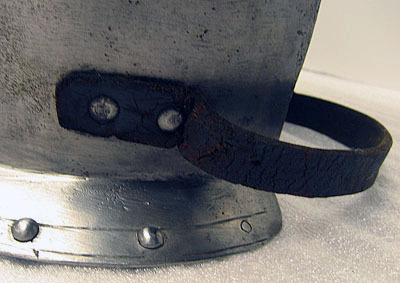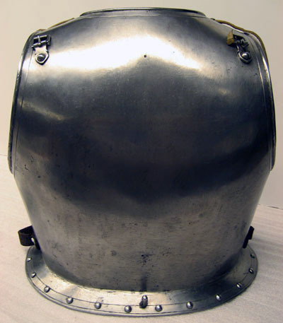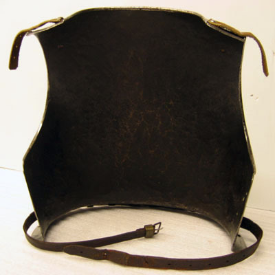 Driven ur ett stycke stålplåt, utsidan blankpolerad och insidan brunsvart. Väld med förhöjningar över skulderbladen och rundade urtagningar för nacke och armar. Över axlarna läderband, l 125 mm, fästade med en nit. Nedanför dessa mot ryggen en nitad sölja av stål med rektangulär ram och konturerad, spetsig ände. Nertill välvd krage, b 32 mm, riktad utåt och nedåt med i mitten ett spärrstift, h 25 mm, med cirkulärt tvärsnitt. I sidorna 20 mm från nedre kant en läderrem fäst med två nitar. På höger sida med sölja av stål och rektangulär hälla av mässing. Alla yttre kanter omvikta och rundsmidda med skuren kantlinje. På kragen även nitar i rad.