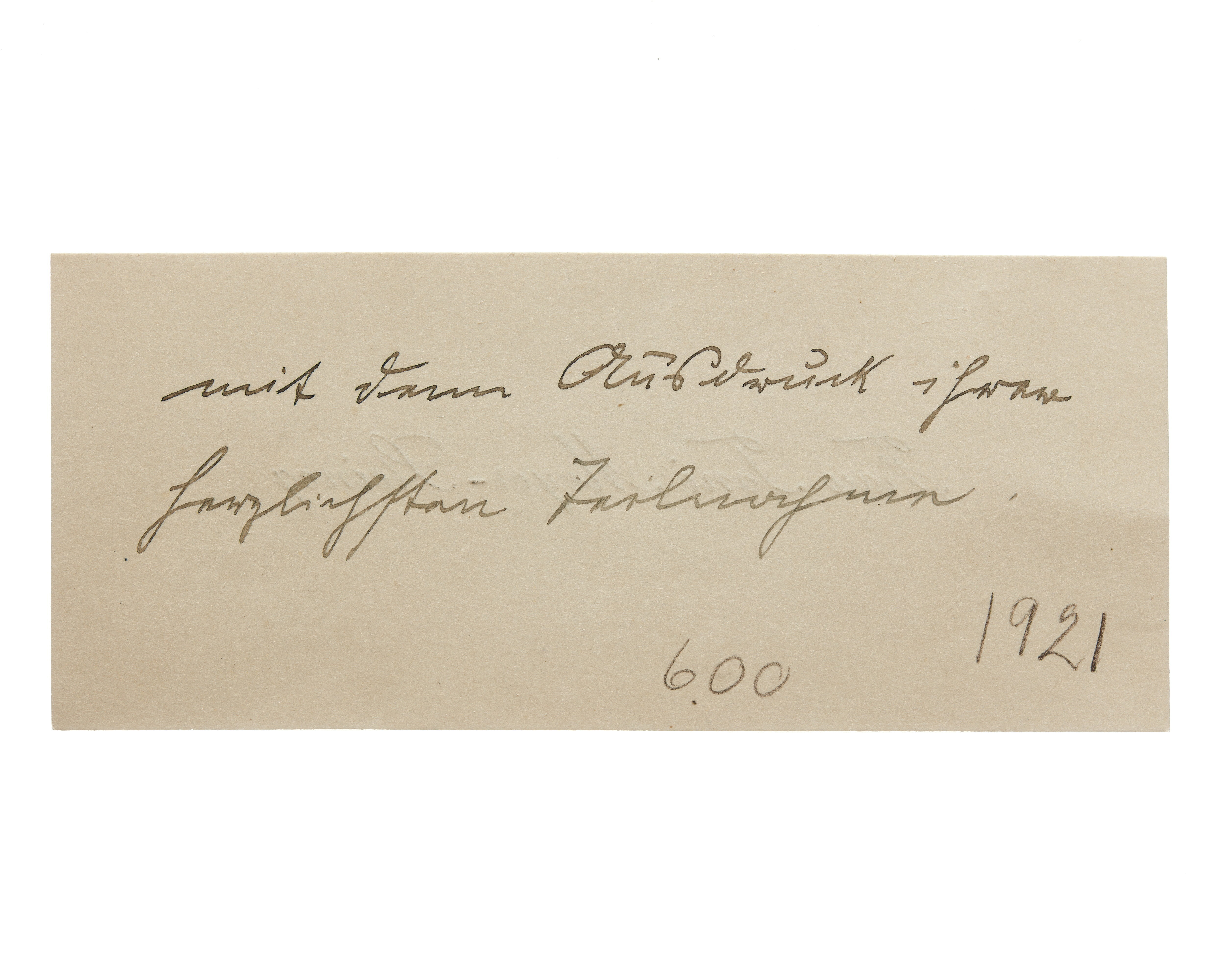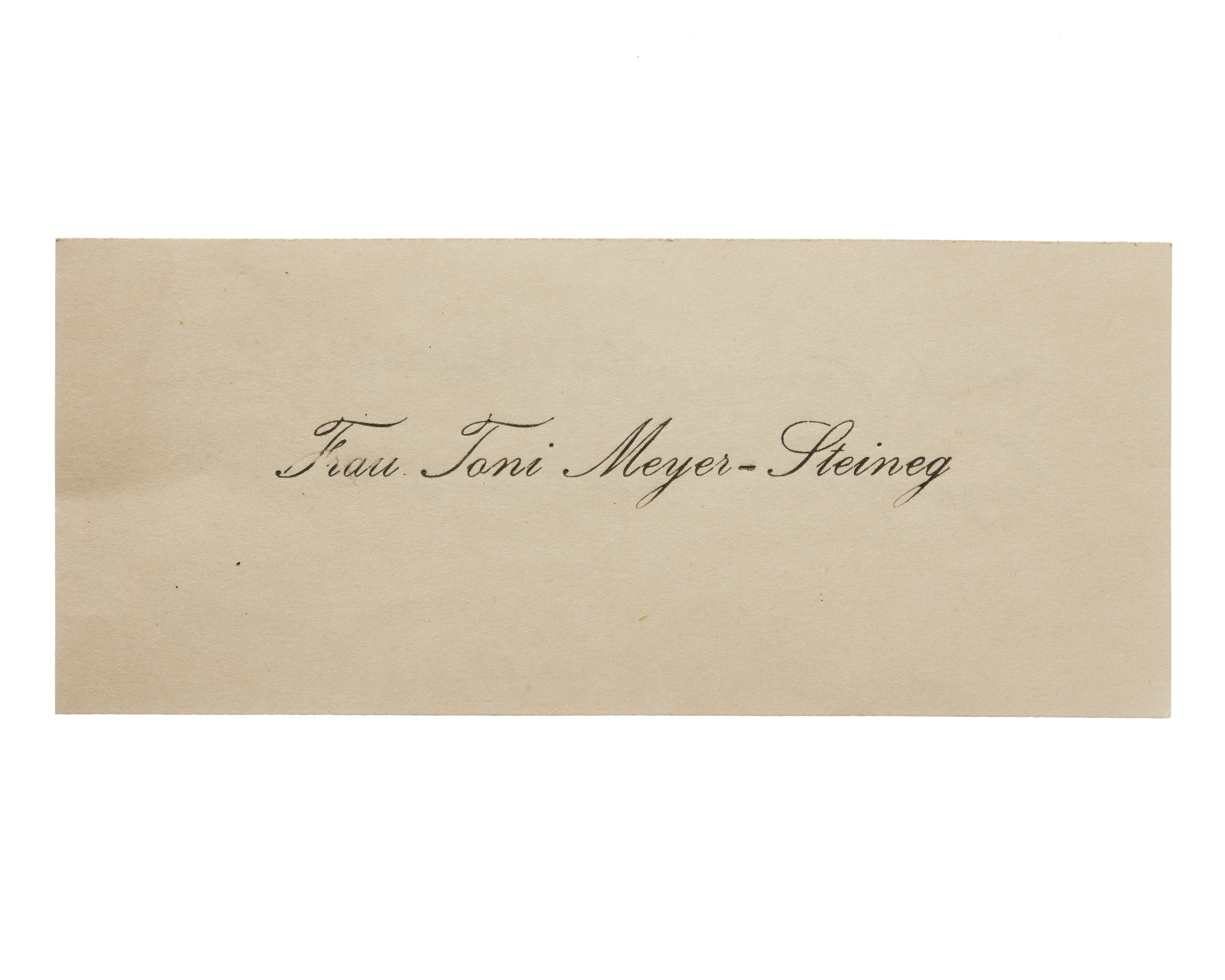 Ett visitkort från frau Toni Meyer-Steineg, daterat 1921. Handskrift ".....".