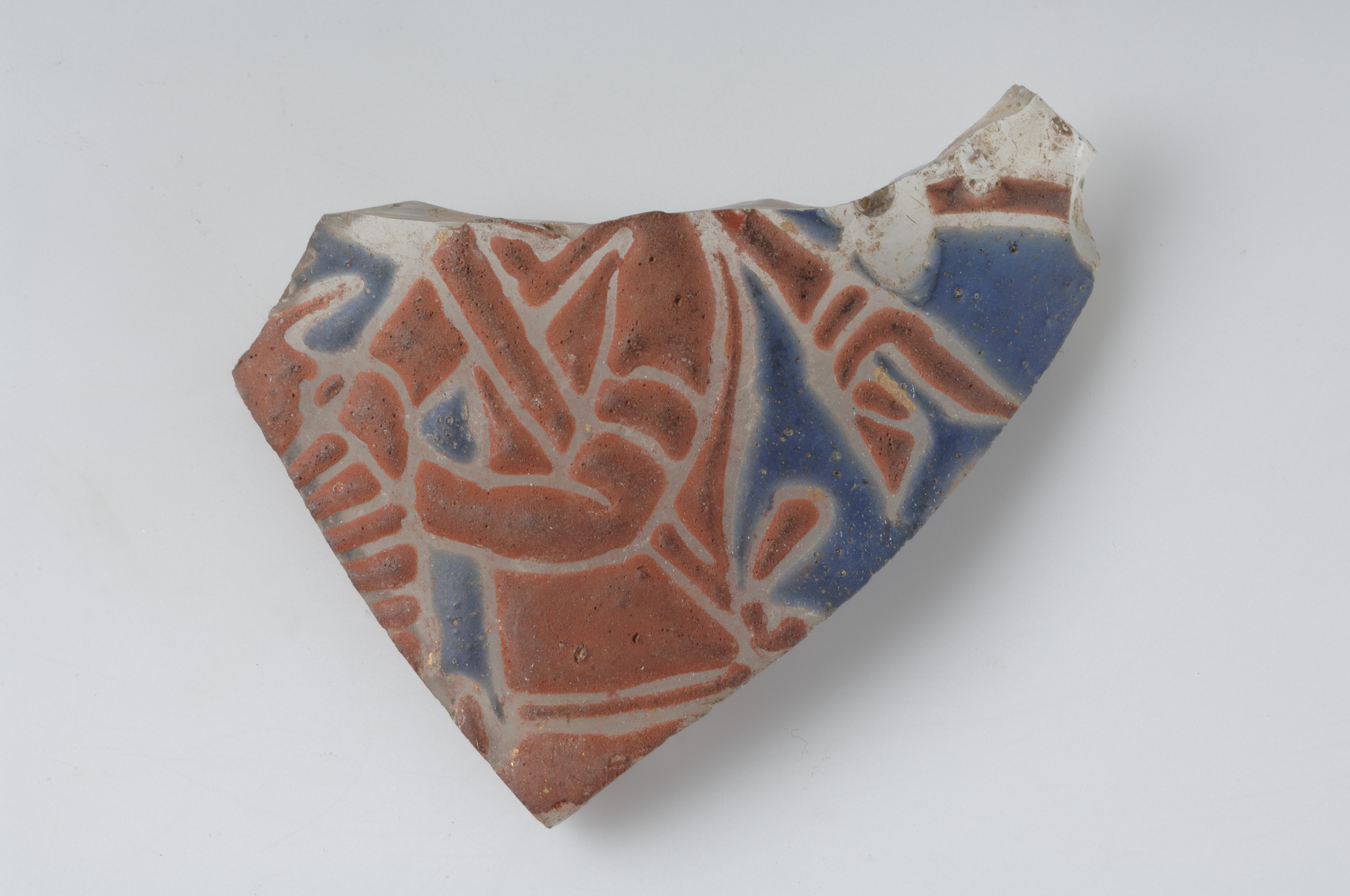 Del (bål, armar mm) av en ryttare i rött på blå botten, i konturlinjer mm spår av guld. Enl. Carl Lamm, proveniens Syrien, förmodligen Aleppo, c. 1260.