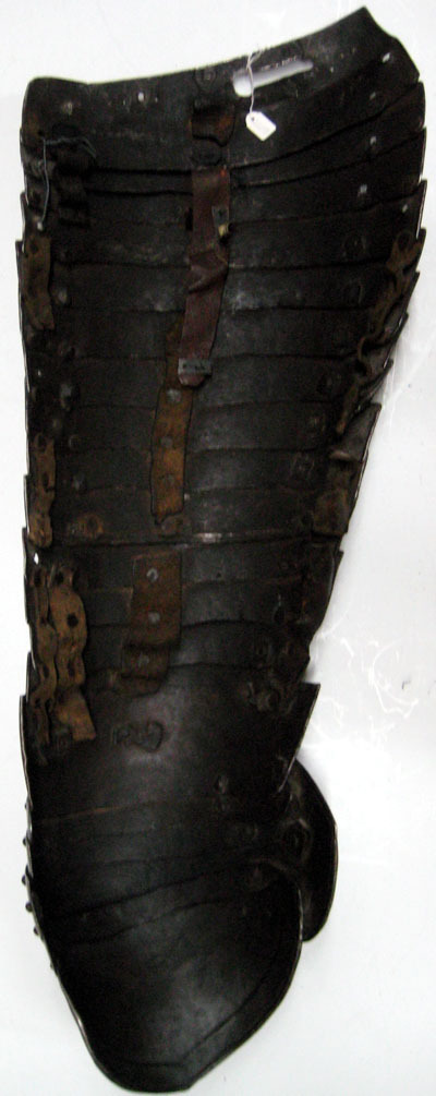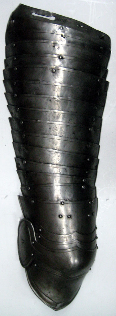 Stålblank stålplåt, insidan svartbrun, om 20 välvda skenor fästa i omlott med nitar i förlängda nithål och tre läderband på insidan. Närmast rektangulär till formen, avsmalnande nedåt med tillspetsad nederkant. Ytterkanten och innerkanten omvikt och rundsmidd. 6:e skenan nedifrån har en kantlinje samt två par sidställda nitar på mitten och i ytterkanten. Övriga har bara kantlinje längst skenans överkant. Översta skenan har nyckelhålshål och en liten utskjutande tapp med ett hål i. Jämte fästhålet finns en markering i form av 6 vertikala linjer på en rad samt två tomma nithål och tre punsade hål. Översta skenan även invikt på mitten ca 45 grader. 11 skenan uppifrån har två nithål i form av nyckelhål och sjätte skenan nedifrån har två sidställda nitar på mitten. Bucklans vinge är närmast ovalformad och har en förhöjd mittyta. Knäspetsen har en försänkt bård.