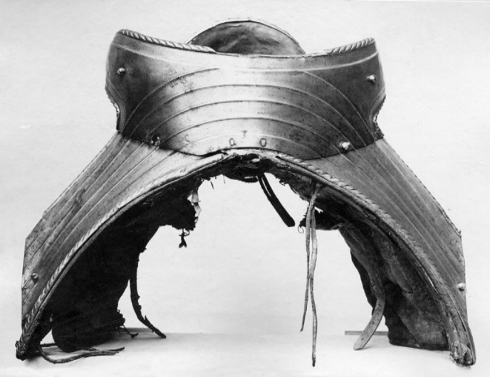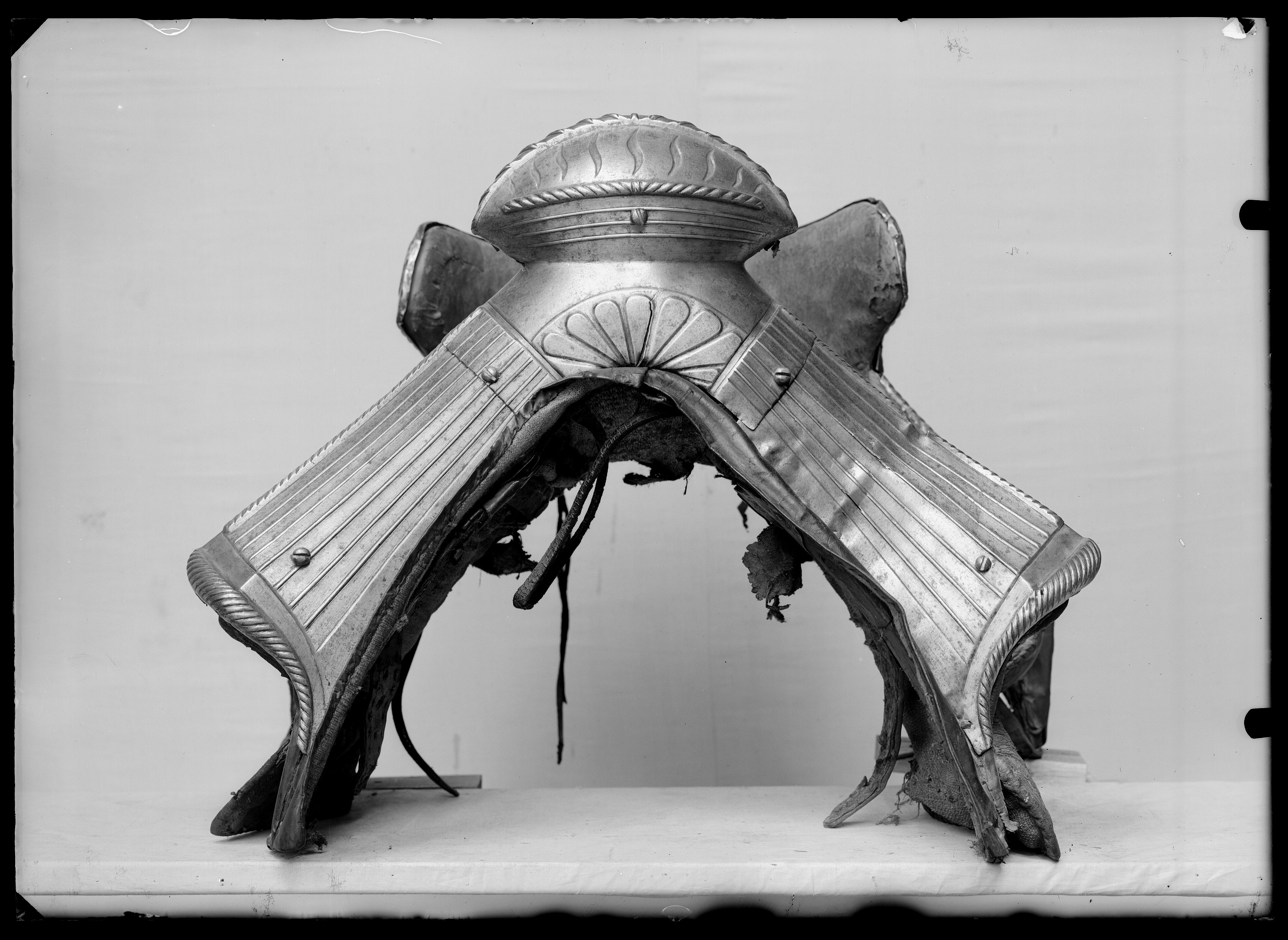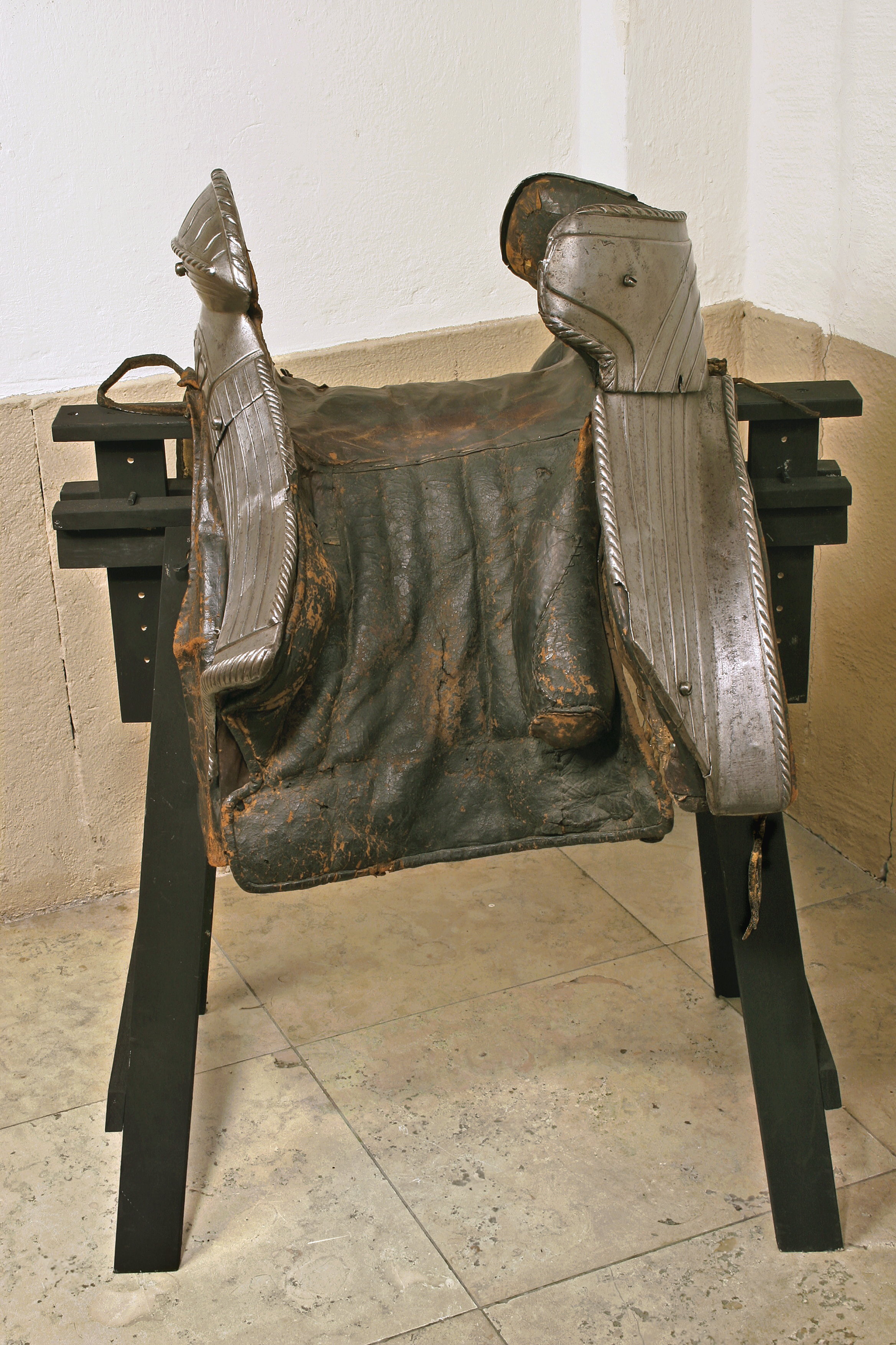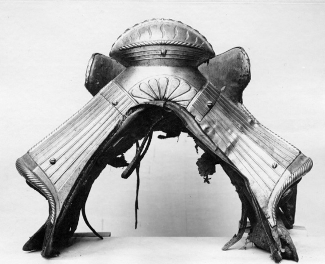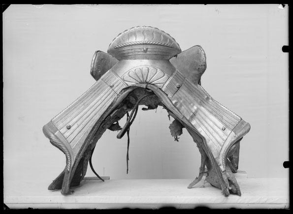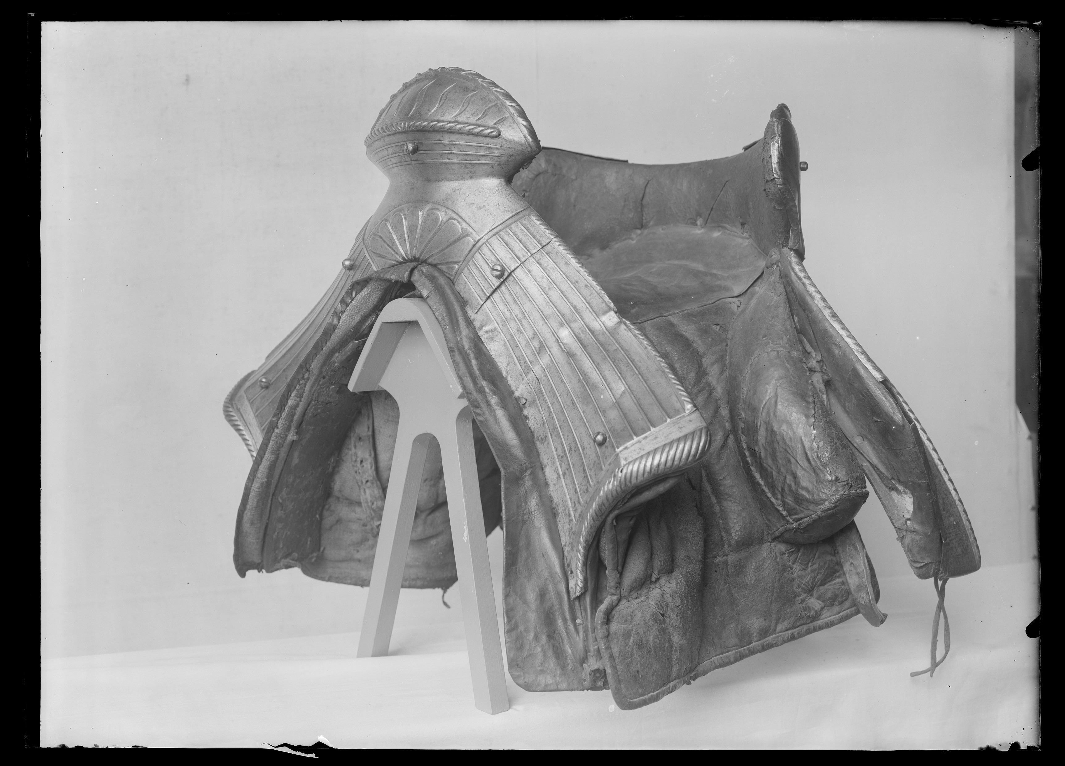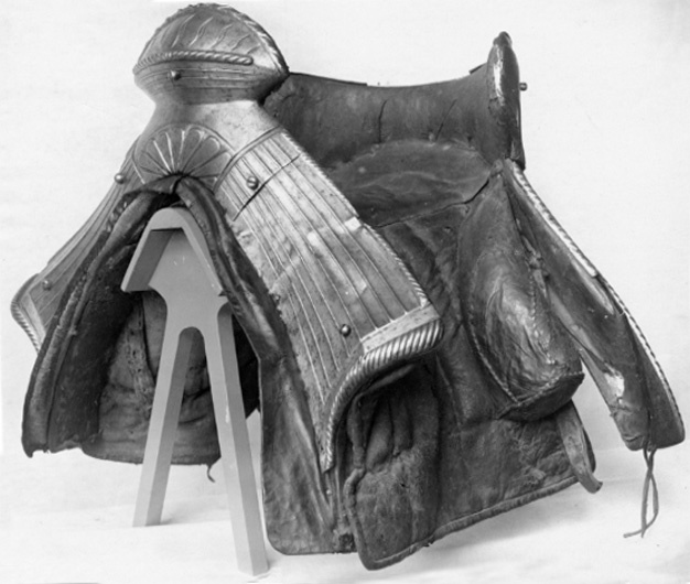 Harnesksadel överdragen med svartmålat läder. Rektangulära, stoppade kåpor fodrade med grov oblekt väv. Fram- och bakbommar beklädda med stålbeslag i drivet arbete med breda räfflor och repstavsformiga kanter. Räfflorna på frambommen tätare än på bakbommen. Innanför repstavskanten på bakbommen samt nedtill på frambommen blank bård. På frambommens mittparti palmettornament i relief. Stor oval sadelknapp med räfflor, nedsänkta S-formade slitsar samt repstav. Bakbommen utformad med två flikar, s.k. "Krippen", som griper runt ryttarens bäcken samt, innanför bommen, cylindriska stödbommar (skänkelvulster) klädda med läder. Frambommen har tre stålbeslag, fästade med fem stora skruvar. Bakbommen har två stålbeslag fästade med sex liknande skruvar (en saknas) och två mindre nitar. Framför frambommen läderögla. Stomme av trä med spår av näverklädsel. Trädelarna förbunda med långa järnskenor. I mitten två korsade sadelgjordar. Fyra läderstroppar för sadelgjord. Två krampor för stigläder. Sadeln söndrig med ett flertal hål och sprickor. Tidigare upptagen under Magnus Ladulås rustning tillsammans med stigbyglar nnr 7972-7973 och under 1800-talet utställd i Riddarholmskyrkan i den s.k. kungalängden med rustningar som påstods ha tillhört regenter från Birger Jarl till Gustav II Adolf.
