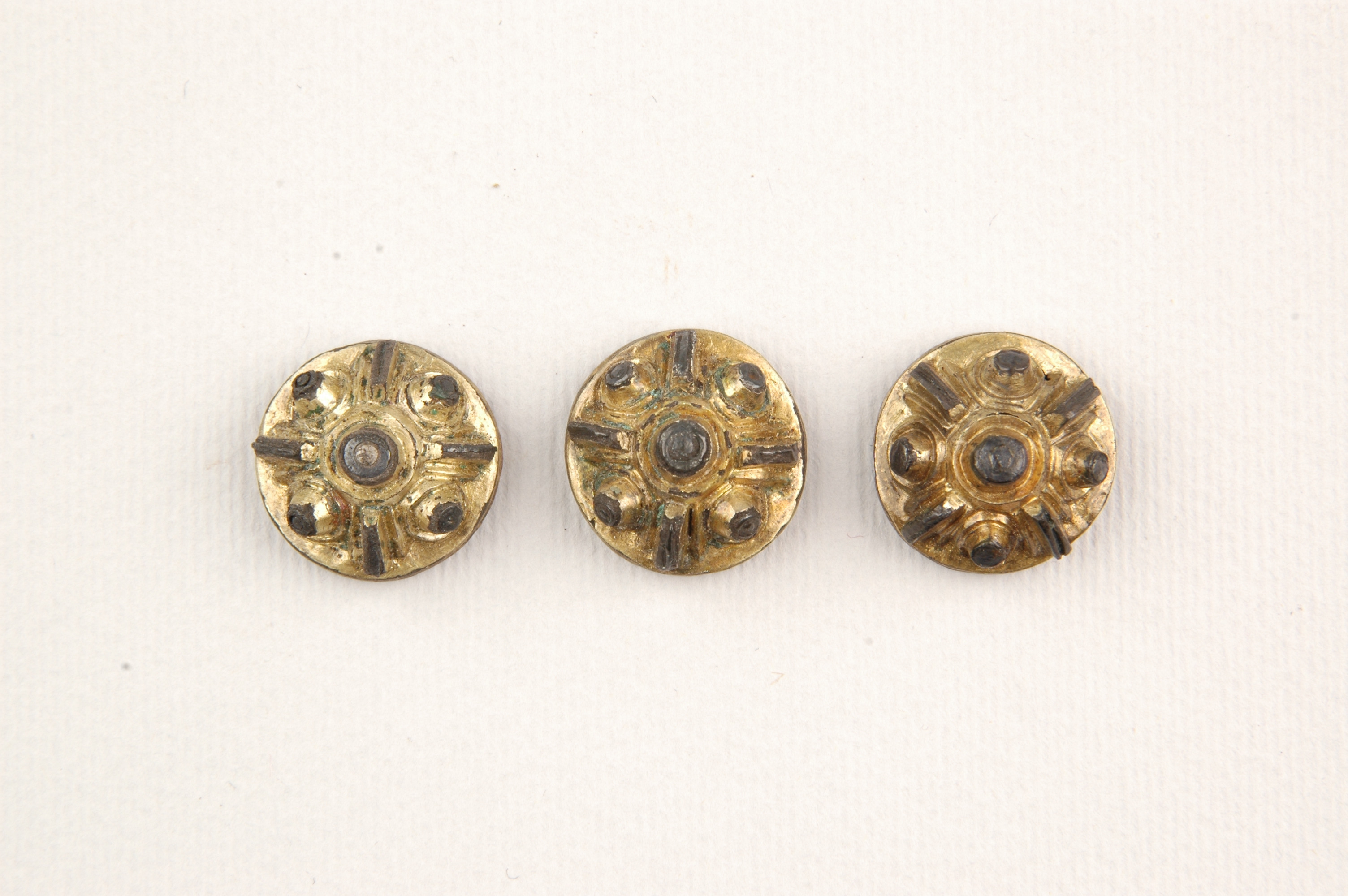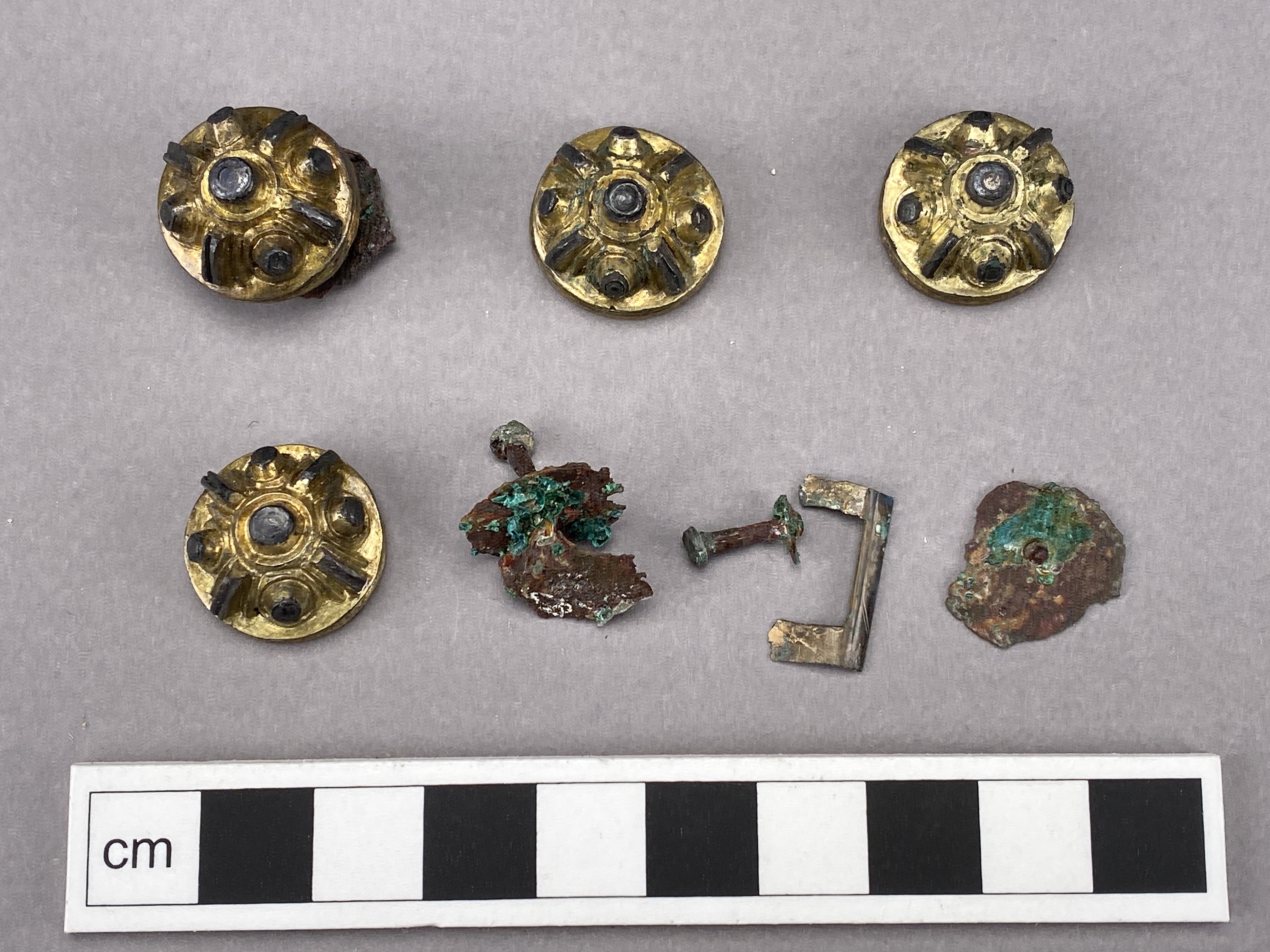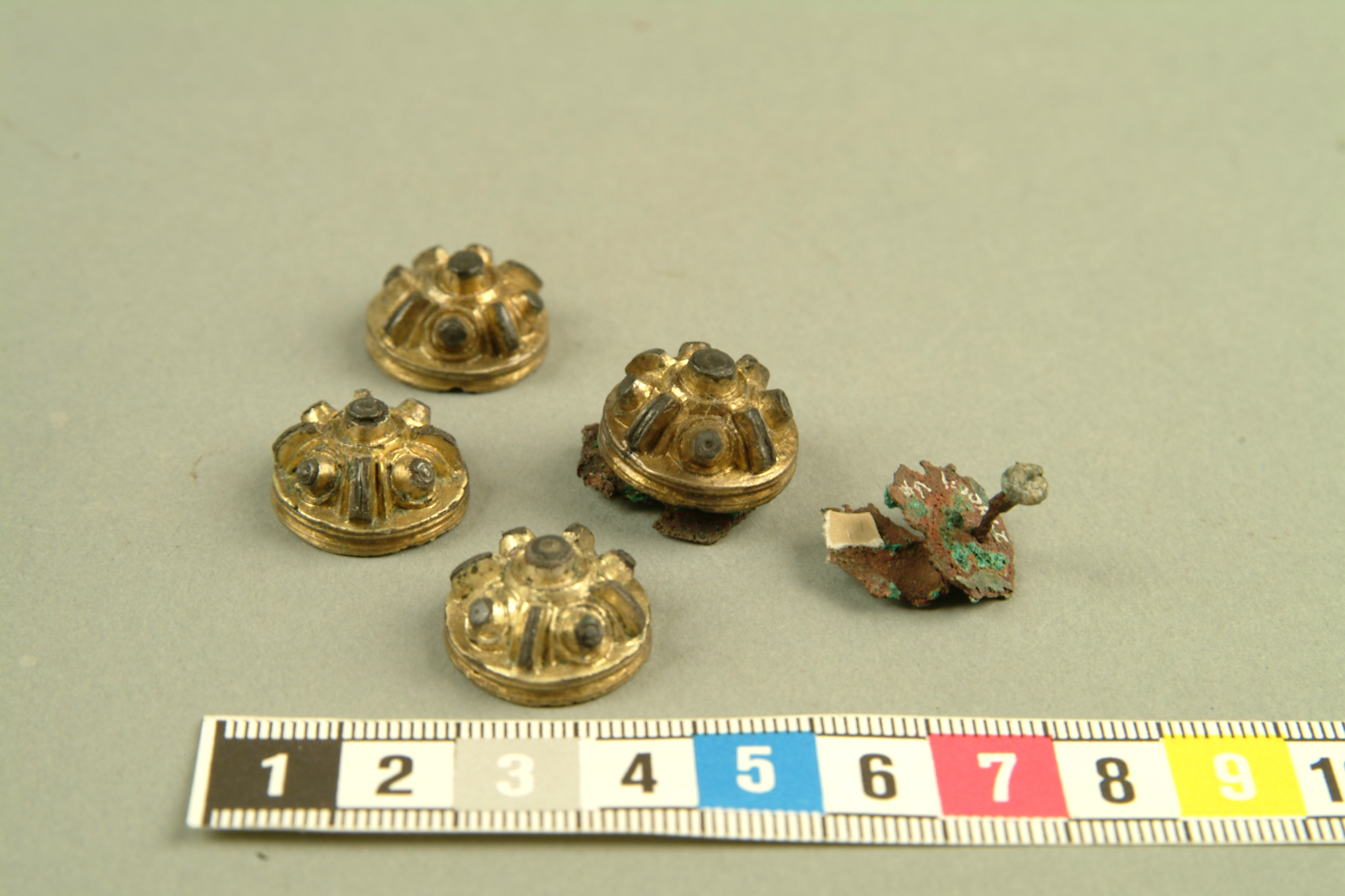 Fyra agraffer av brons och silver, förgyllda. en agraff i delar