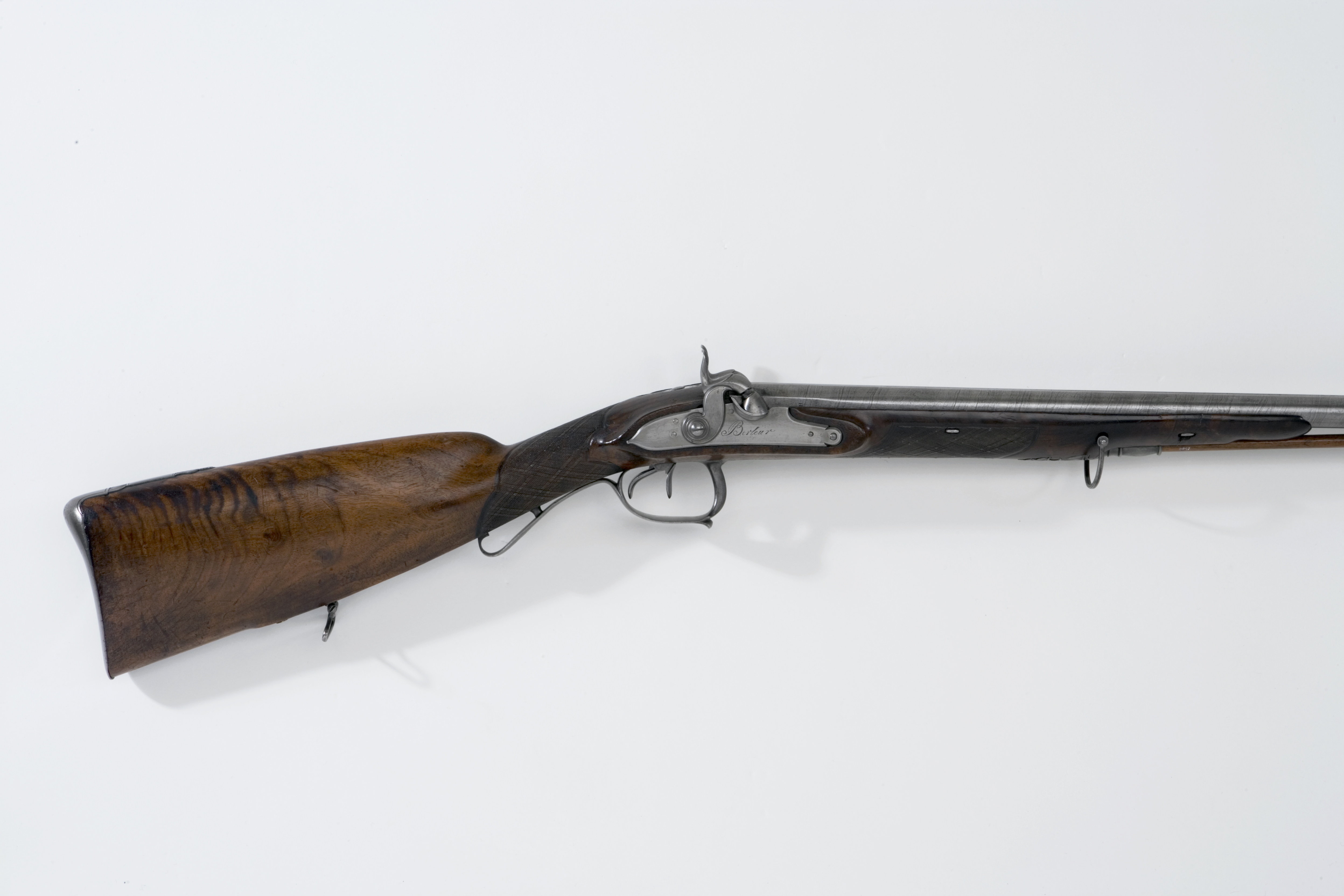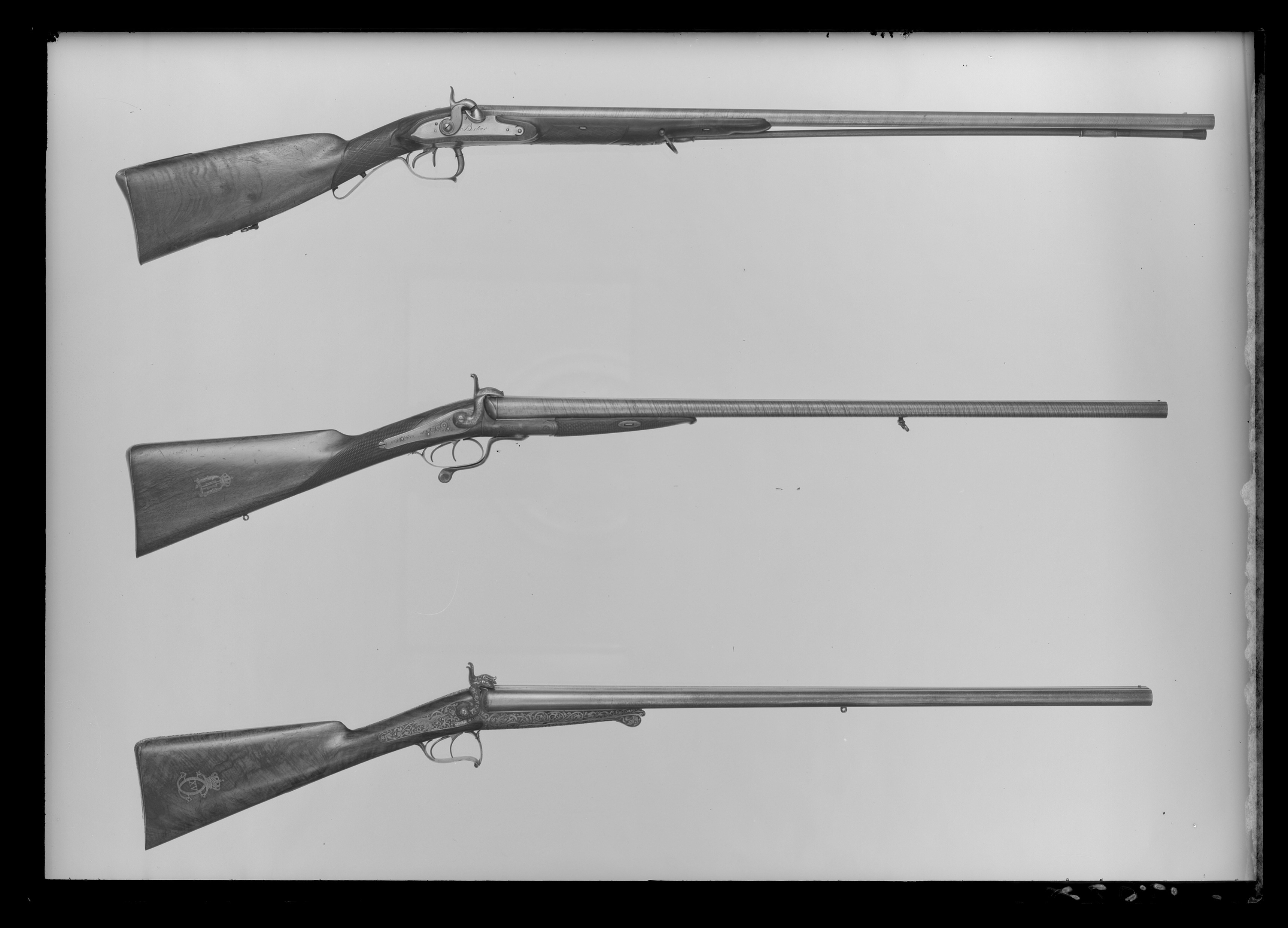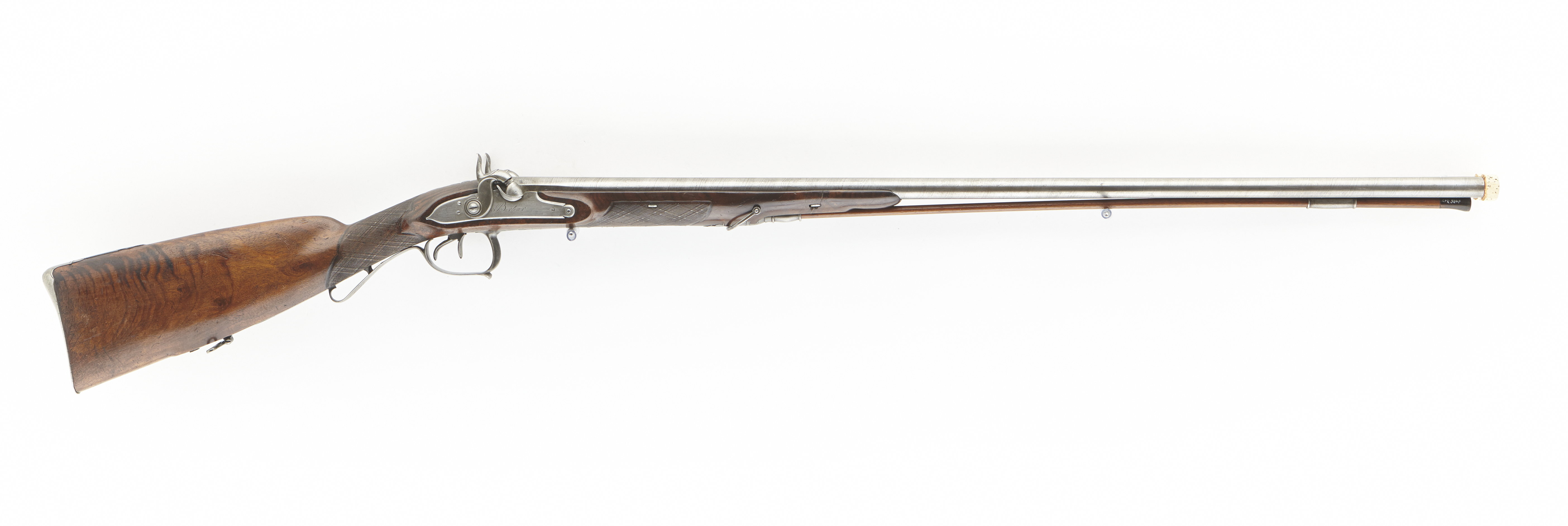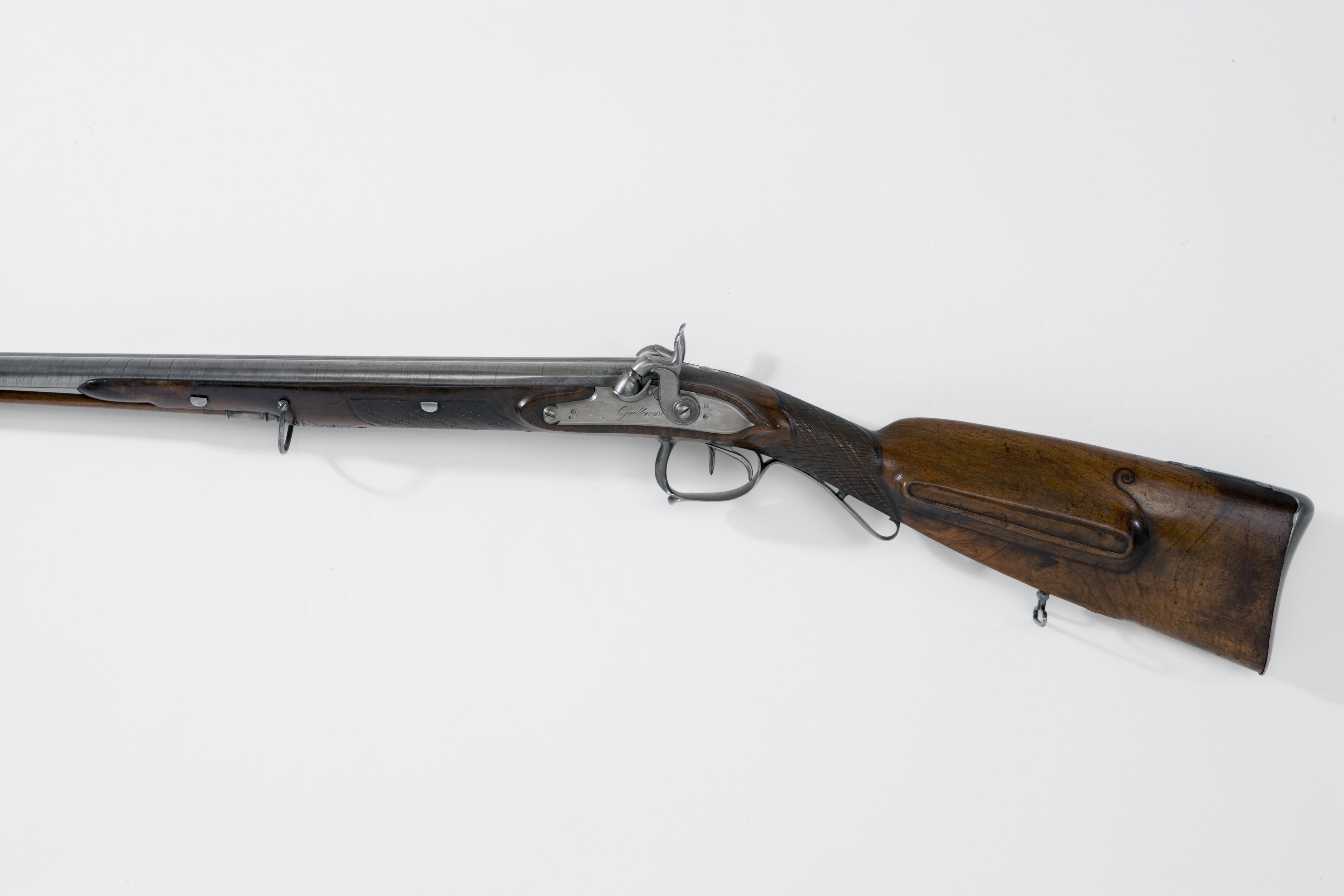 Damaskerad dubbelpipa med överliggande, skålad spång, på kammarens sidor fastlödda snäckor och på undersidan inslaget: "H L" tre gånger, "B P" två gånger samt 44. På h. sida en oval stämpel ELG. En rundad rörka. Baskyl med rundat baskylblad med graverade blad, bladformig ändplatta. Riktmedel: Kraftigt skålat sikte på baskylen. Fästning: Två häften för engelska pipstift. Pipan fäst med baskylhakar samt två engelska pipstift av stål. Två flintlås ändrade till slaglås. Plana låsbleck med fasade kanter, på v. lås graverat: "Guillaume", på h. "Berleur". S-formiga, platta hanar med fasade kanter, runt nötskruvarna svarvade ringar. Nätskurna tumgrepp. Fästning: Två låsskruvar från v. sida. Dubbla avtryckare. Konturerat avtryckarbleck. Brun halvstock av valnöt. Engelsk kolv med kindstöd samt nätskuren kolvhals och förstock, i nätmönstret inslaget stålstift. Under kolven en oval mässingsplåt med graverat nr: 6. Beslag av stål. Bakplåt med flik på kolvryggen. Rundad rörka med profilerad, graverad spets. Varbygeln bakåt utdragen och graverad med blad och blommor. Rund, hög framstolpe, kluven bakstolpe. Fri, delvis dubbel bakre arm med spetsig, bladformig ände. Främre armens avslutning liknande en ananans med bladknippe. Vid spetsrörkan och under kolven u-formiga rembyglar av stål. Tillbehör: Laddstock av trä, l: 845 mm, framtill skodd med konisk hornskoning, l: 26 mm, i andra änden ett mässingsrör, l: 36 mm, med en spiralvriden stålkrats, l: 38 mm.