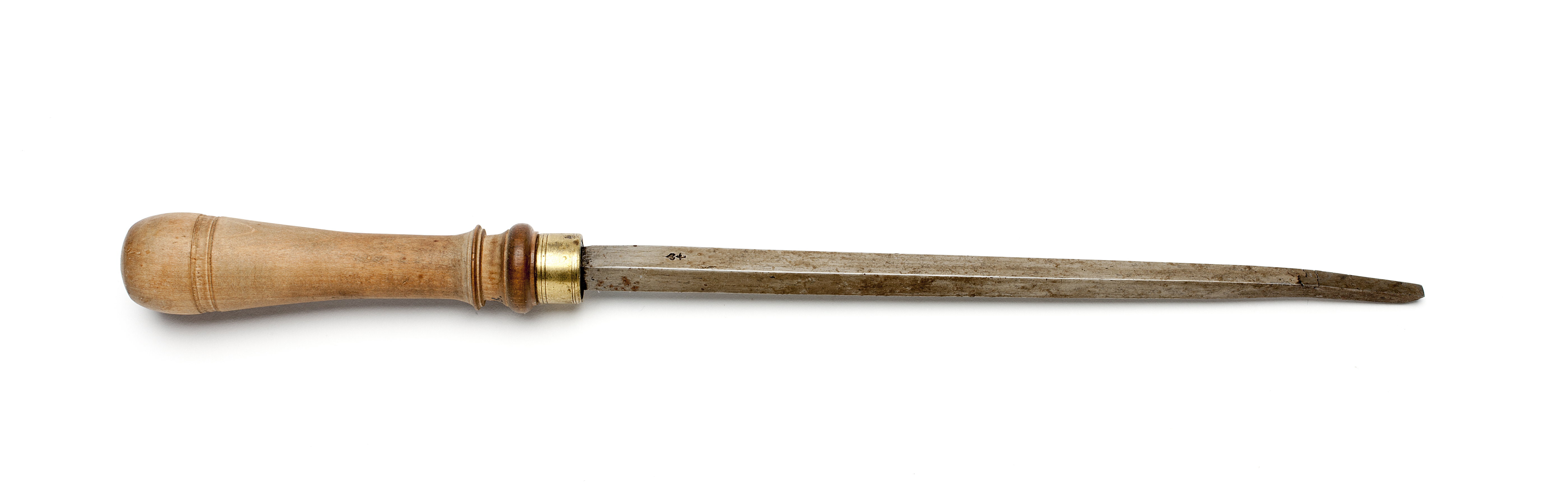 Klinga med rektangulär genomskärning. Stämplat på klingan: hjärta under kors. Svarvat skaft av päronträ, med två vulster nedtill ("rydboholmstyp"). Mässingsring. 1930 kallat stickjärn.