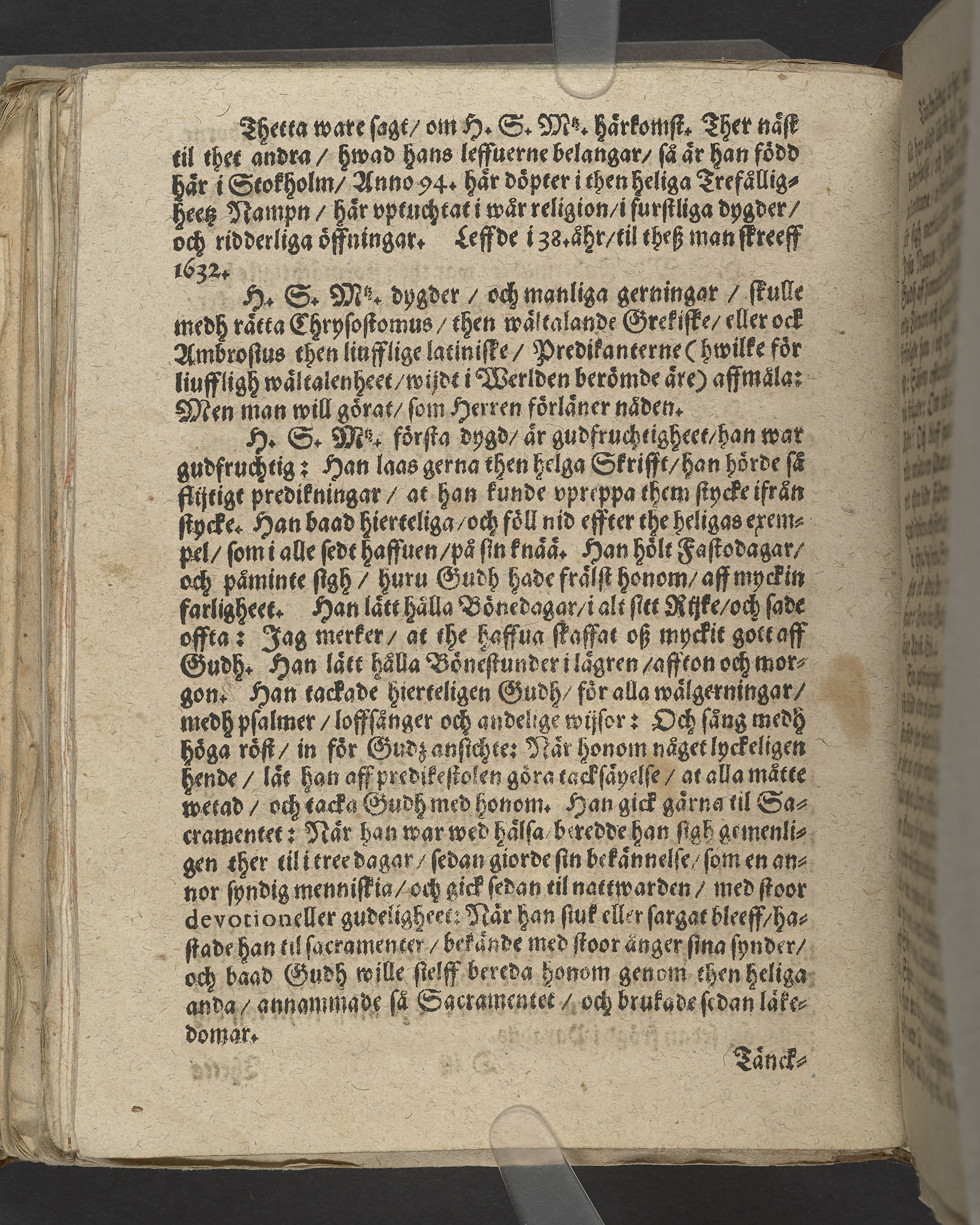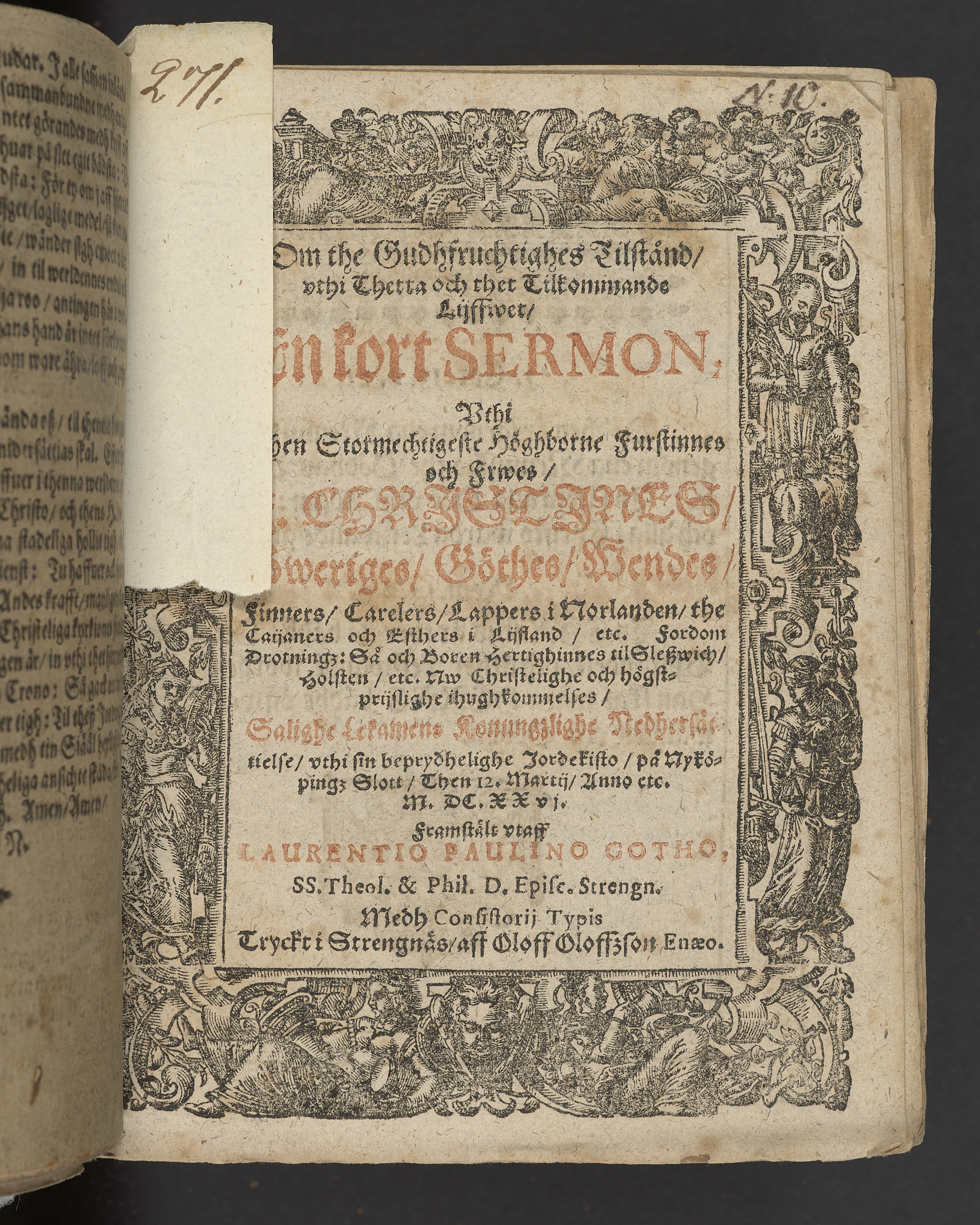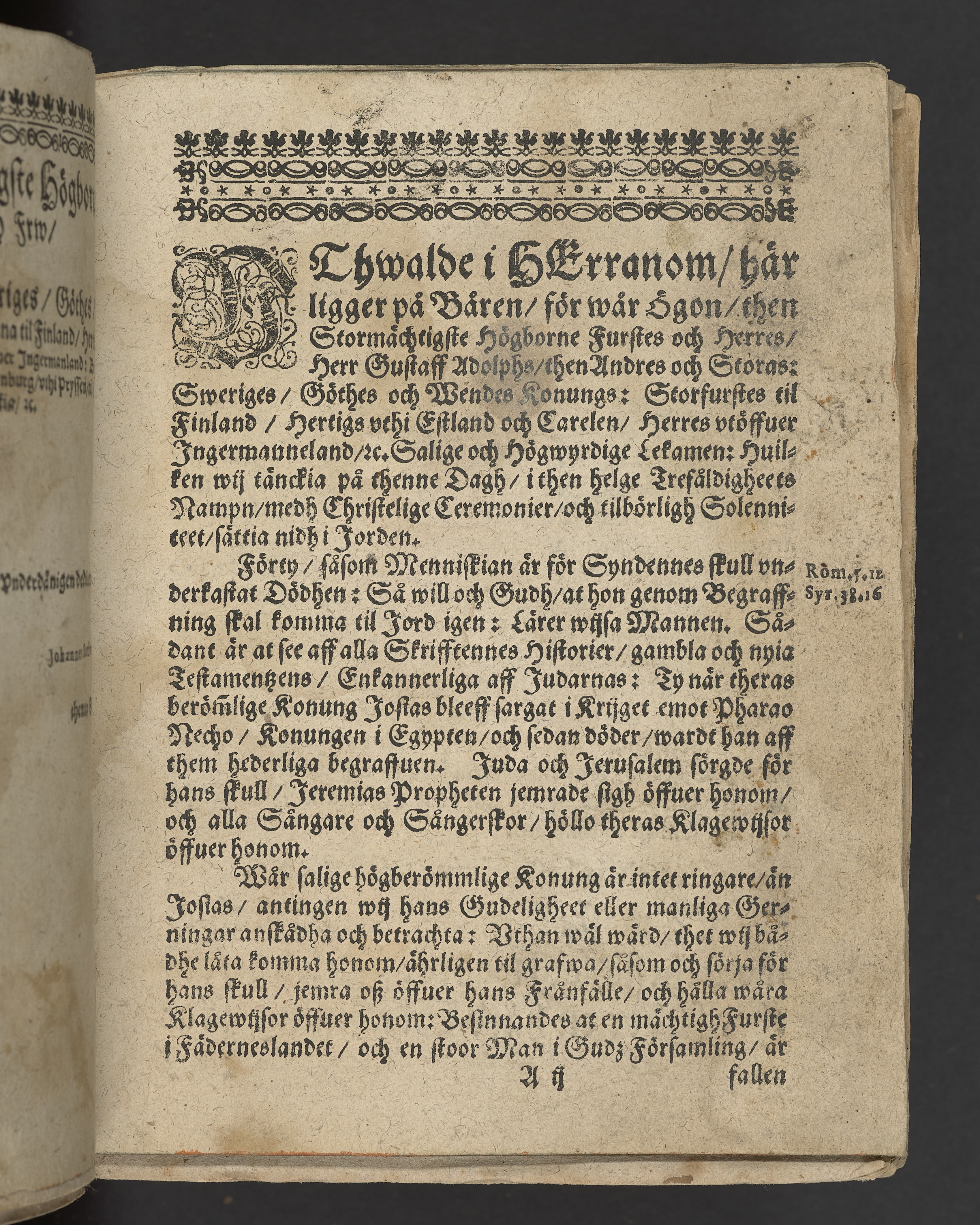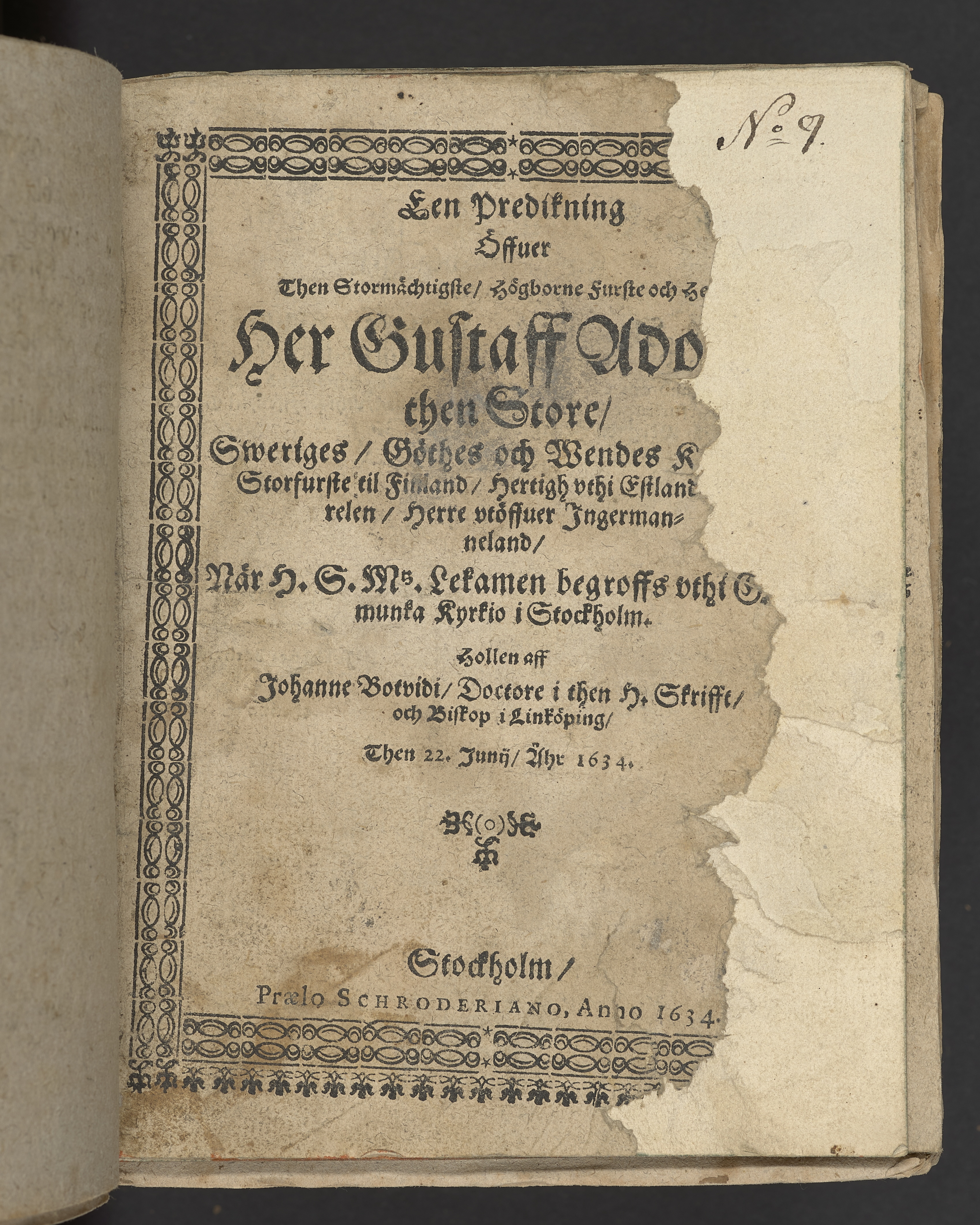 Een predikning öffuer... her Gustaff Ado[lph] then store, Sweriges... k[onung]... När H. S. M.s lekamen begroffs uthi Gråmunka kyrkio i Stockholm. Hollen aff Johanne Botvidi.. Then 22. Junii, åhr 1634. Stockholm, prælo Schroderiano, anno 1634.