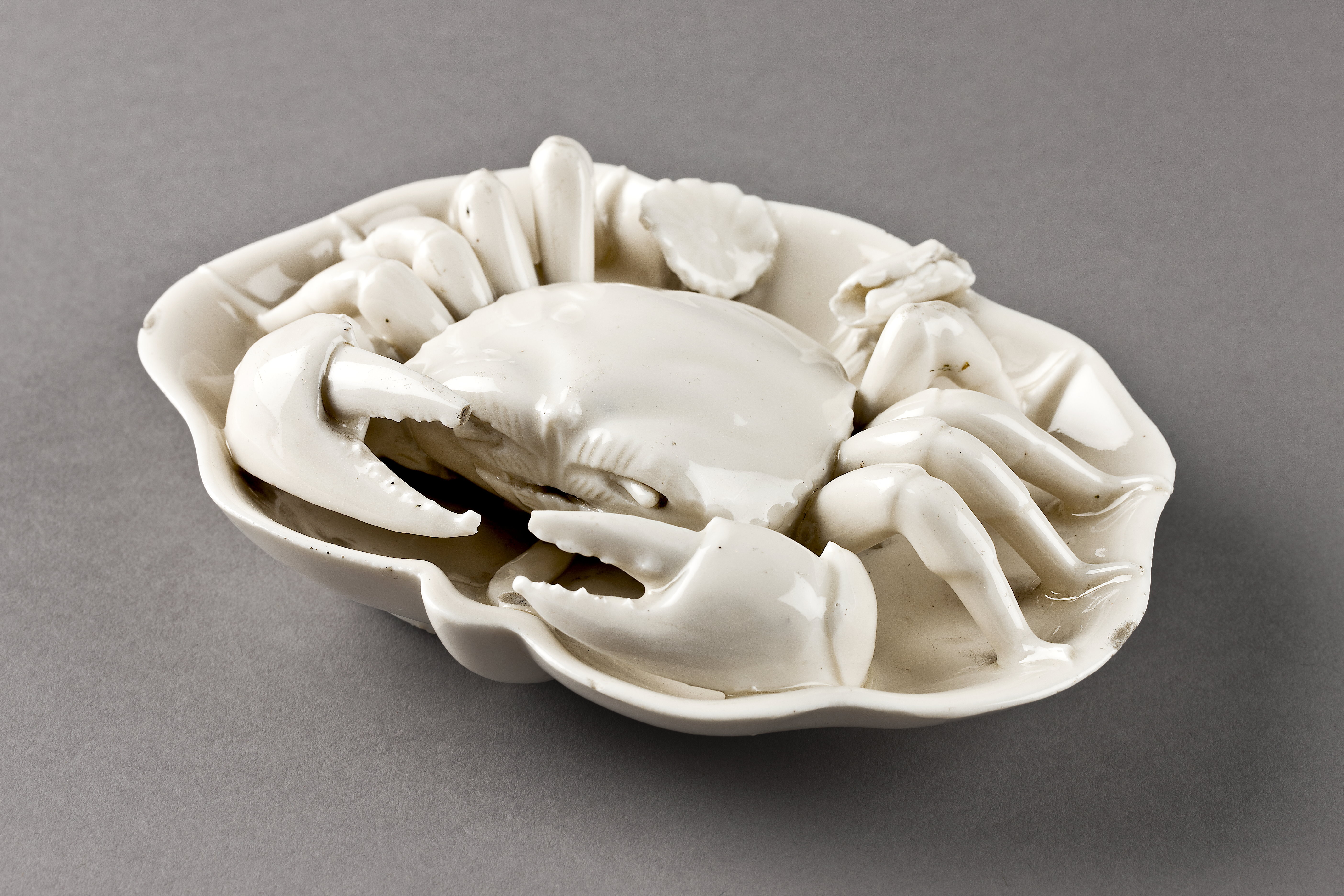 FIGUR. Krabba i lotusblad. Dehua-porslin går i Europa också under benämningen Blanc-de-Chine. Bladet skålformigt med sju flikar. Krabban upptar hela bladet. Jfr. William R. Sargent. Treasures of Chinese Export Ceramics, From the Peabody Essex Museum (2012), nr 256. Då det kinesiska språket har tusentals tecken men en begränsad mängd ljud, är det vanligt med ordlekar och bildgåtor. Krabban och lotusen utgör en bildgåta med betydelsen »må ni ha ett harmoniskt äktenskap, år efter år«, så detta föremål ska ha varit lämpligt som bröllopsgåva. Figure, Crab on a lotus leaf. Dehua ware 17th-early 18th century. A later export tureen, enamelled in colours, in form of a crab is shown in William R. Sargent Treasures of Chinese Export Ceramics From the Peabody Essex Museum (2012), No.256. Porcelain crab with transparent glaze Dehua ware, Qing dynasty, 17th century Because the Chinese language has thousands of characters but a limited range of sounds, the use of puns or rebuses is common. Crab and lotus form a rebus "May you have a harmonious marriage year after year", so this piece would be suitable as a wedding gift.
